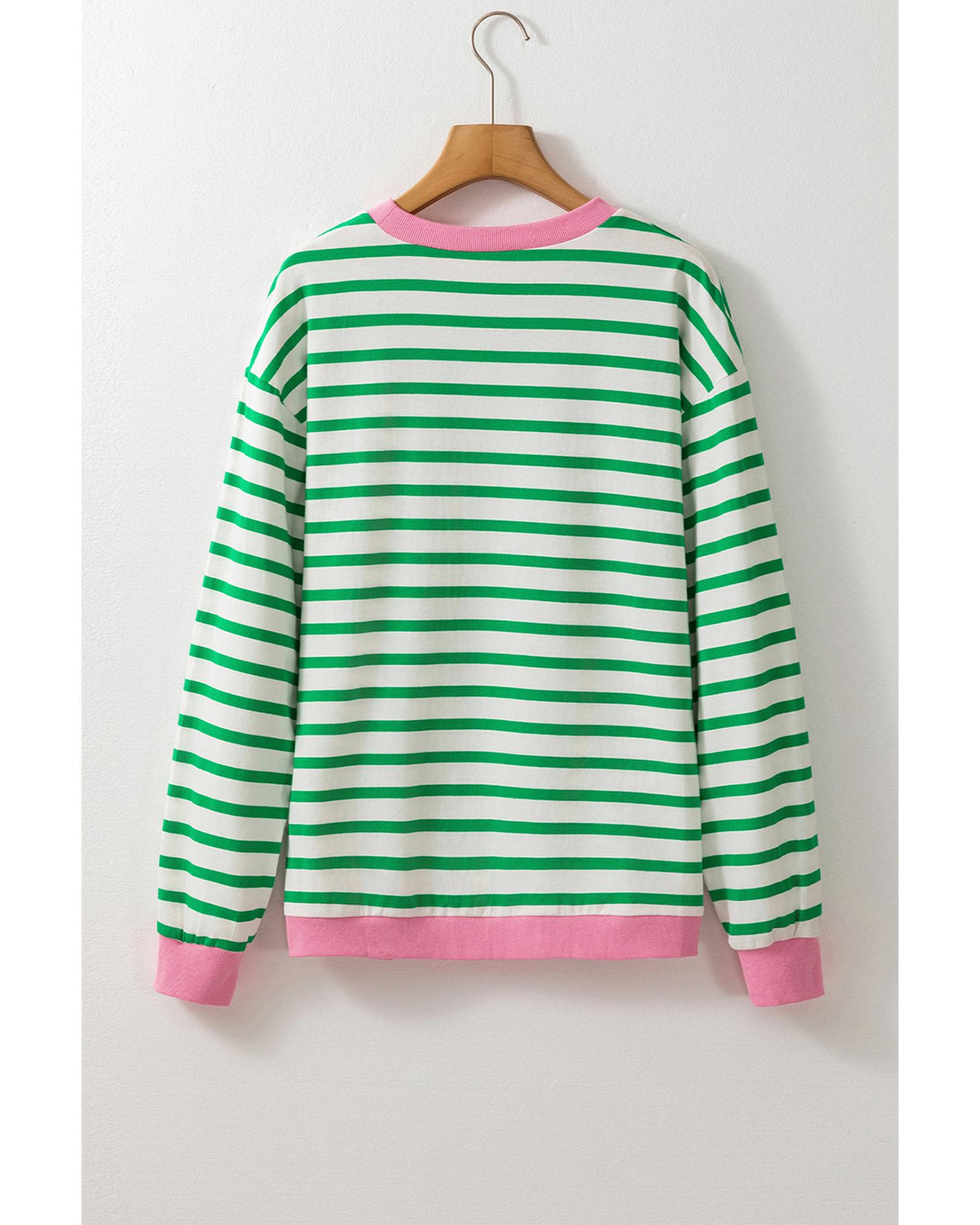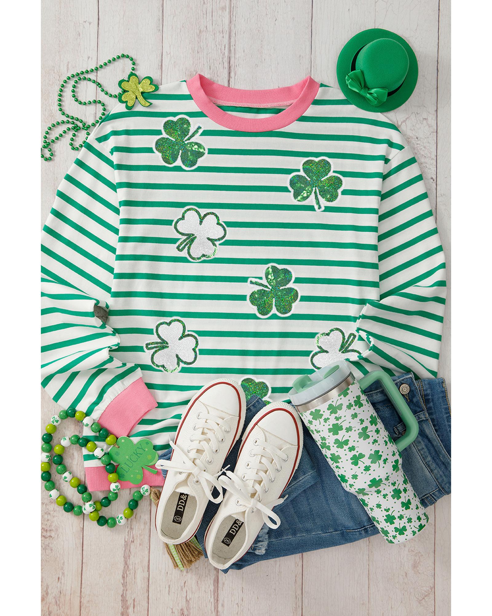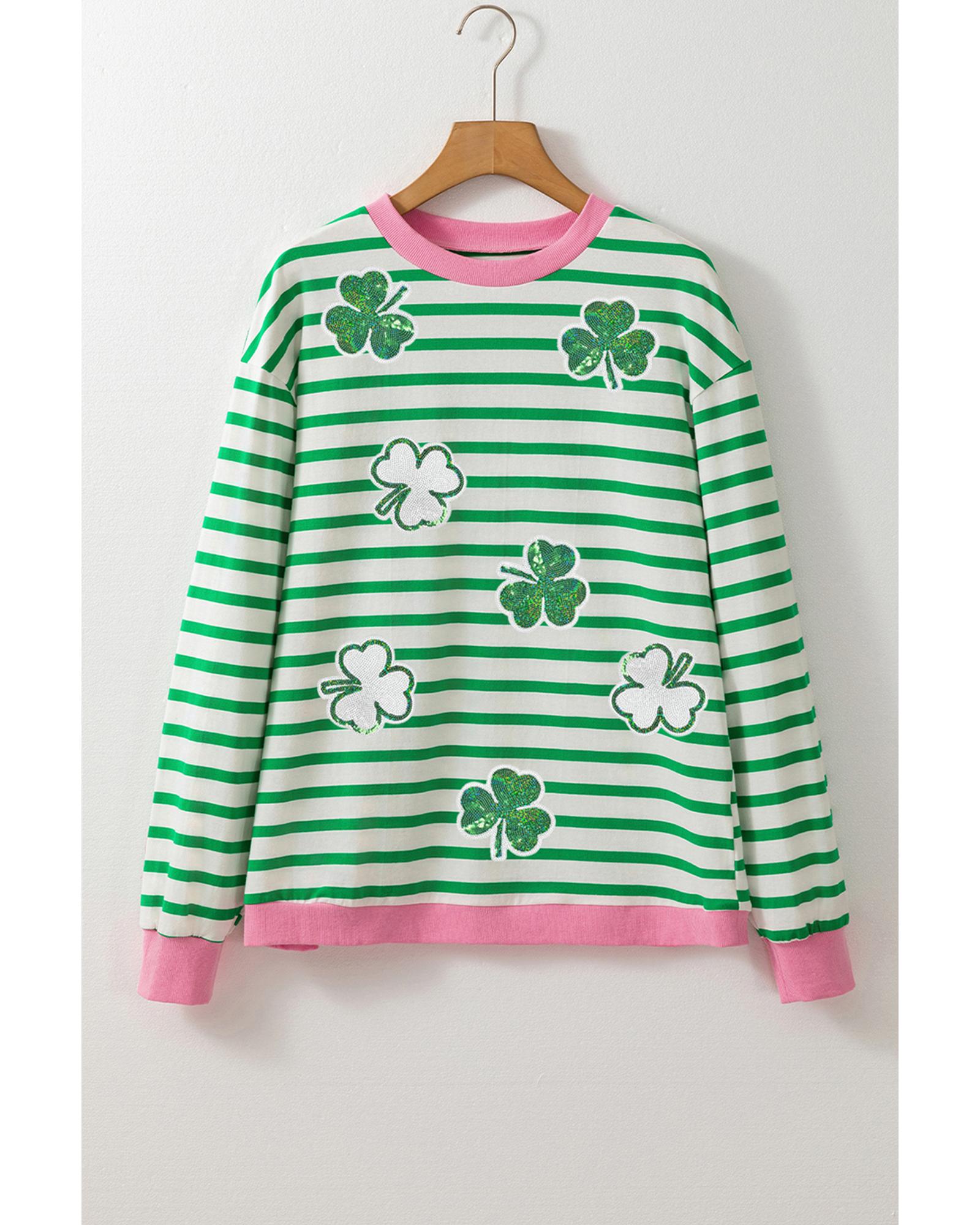 This long sleeve top features a vibrant green striped design accented with a sequin clover graphic and colorblock details, creating a festive and eye-catching look. The crew neck and relaxed fit provide comfort and a classic silhouette, making it suitable for various occasions, especially St. Patrick’s Day celebrations or casual outings.