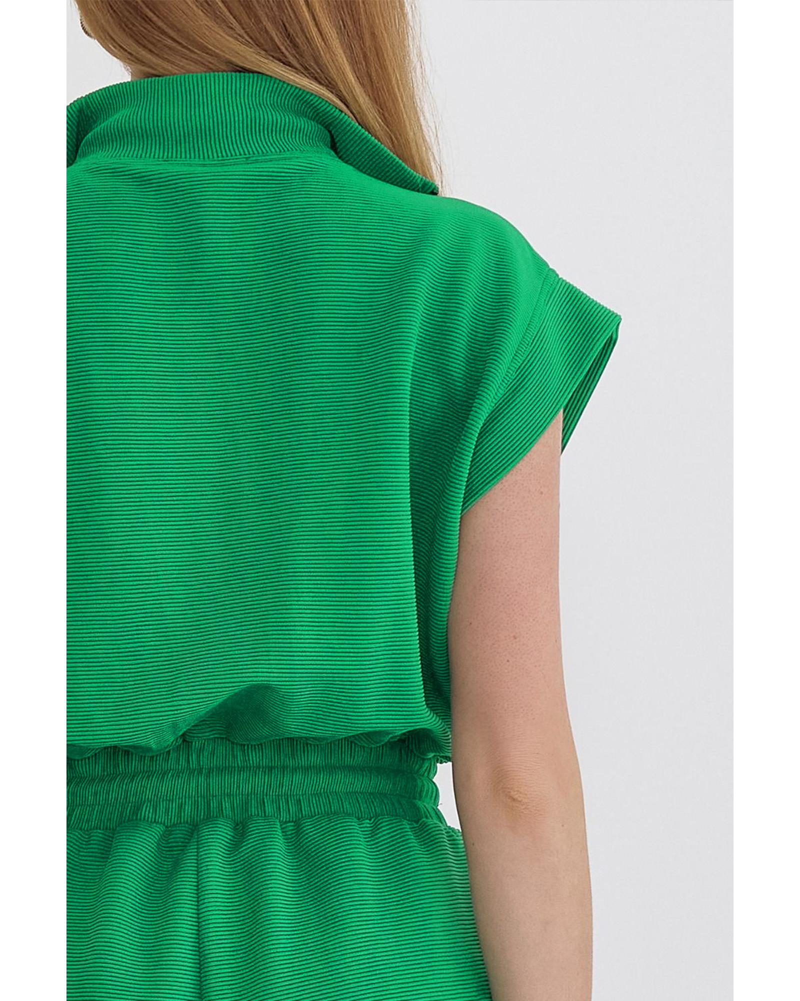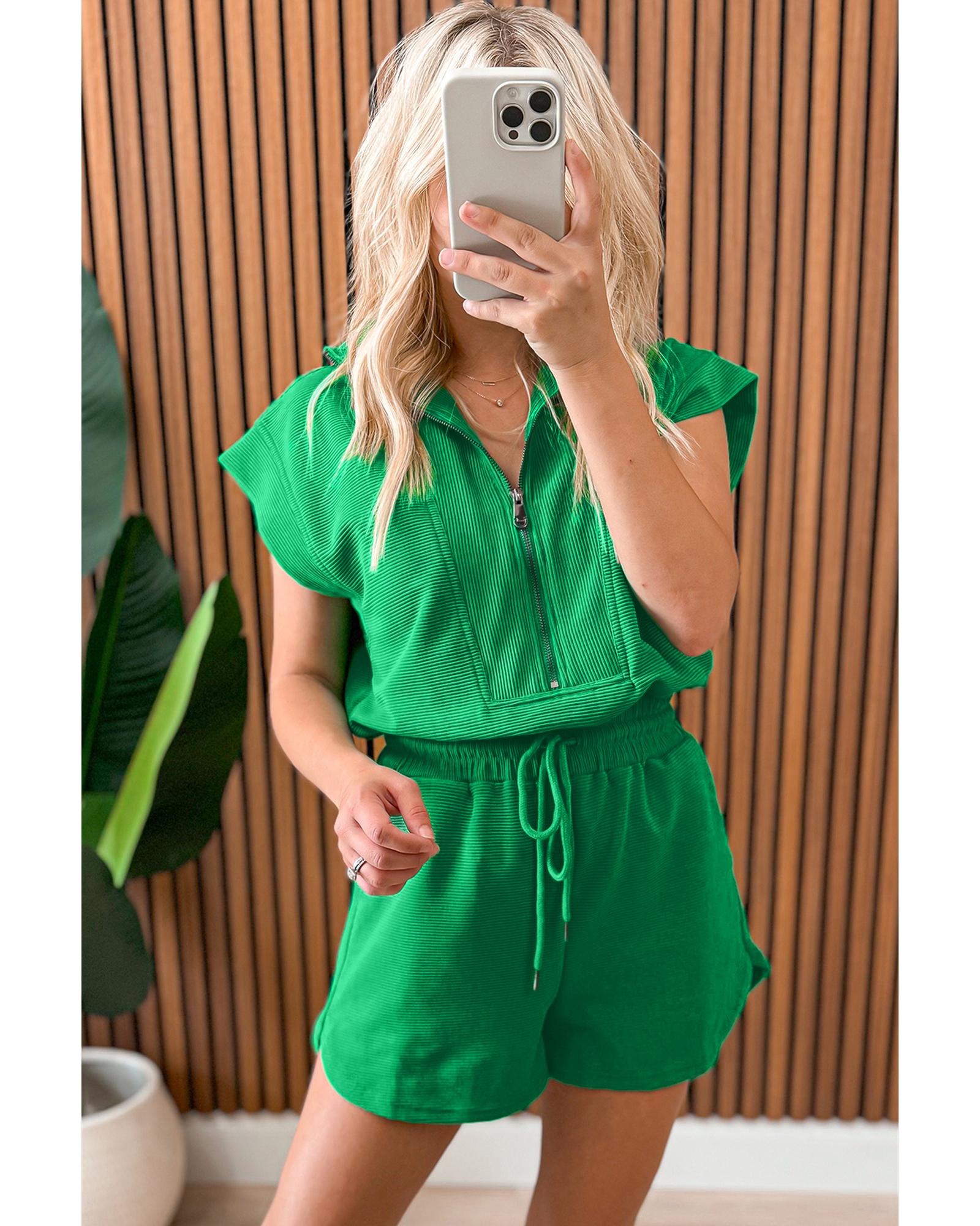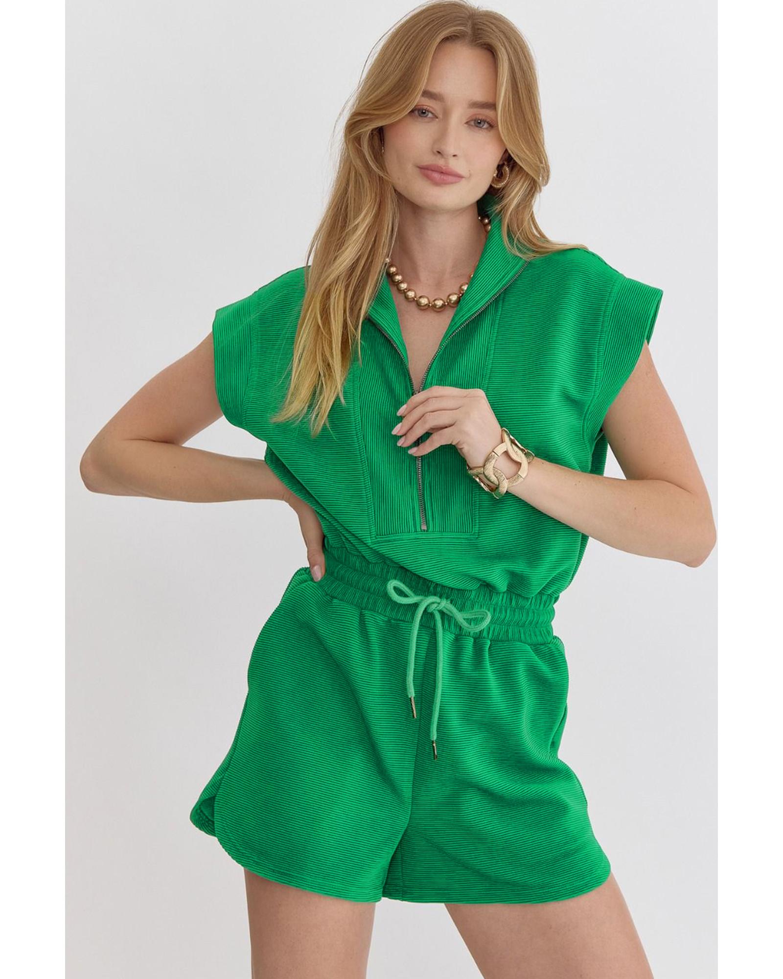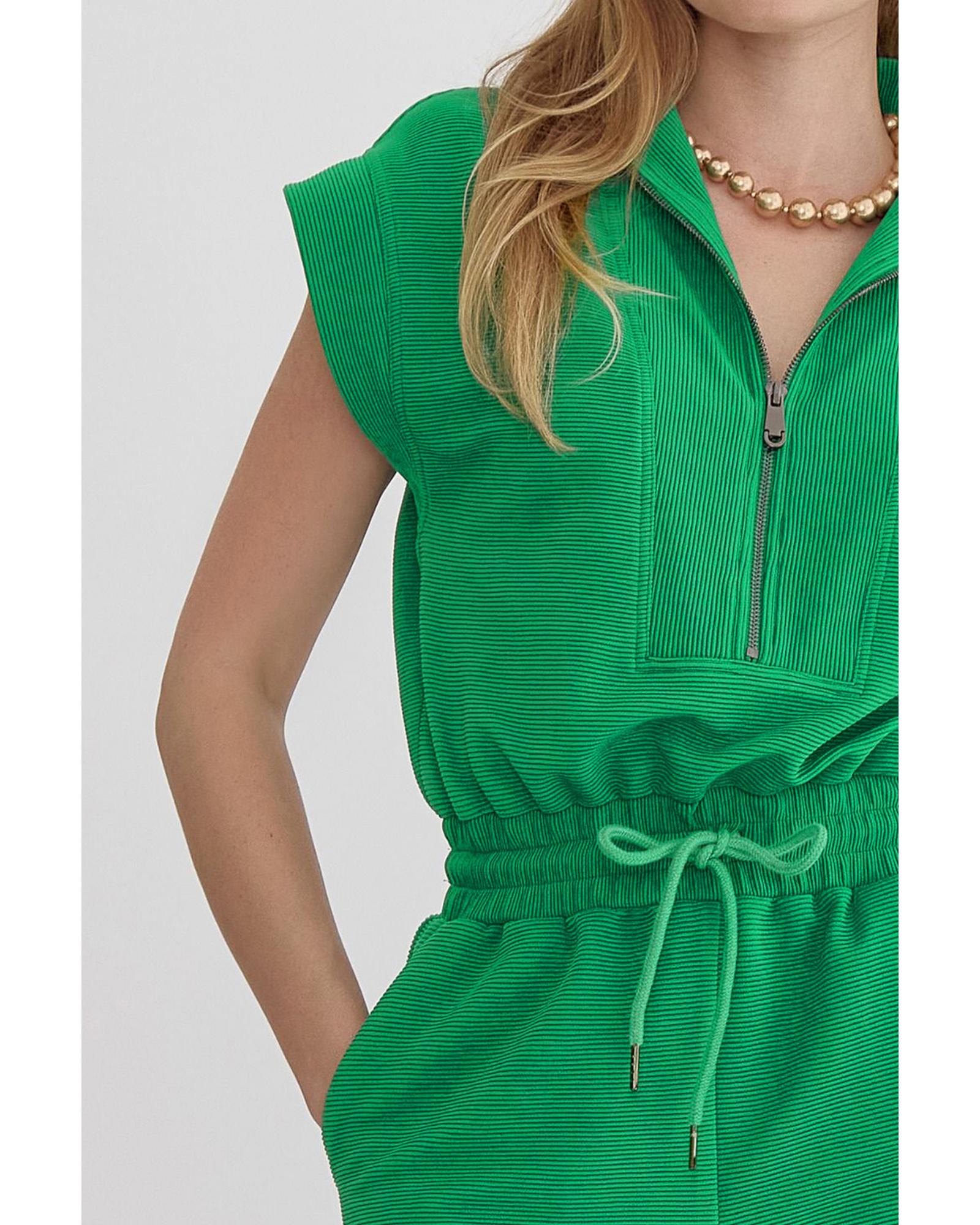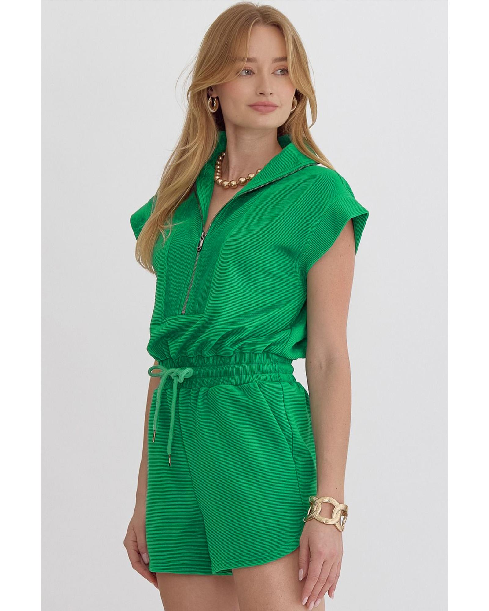 Bright Green Textured Short Sleeve Half Zip Drawstring Waist Romper – S
