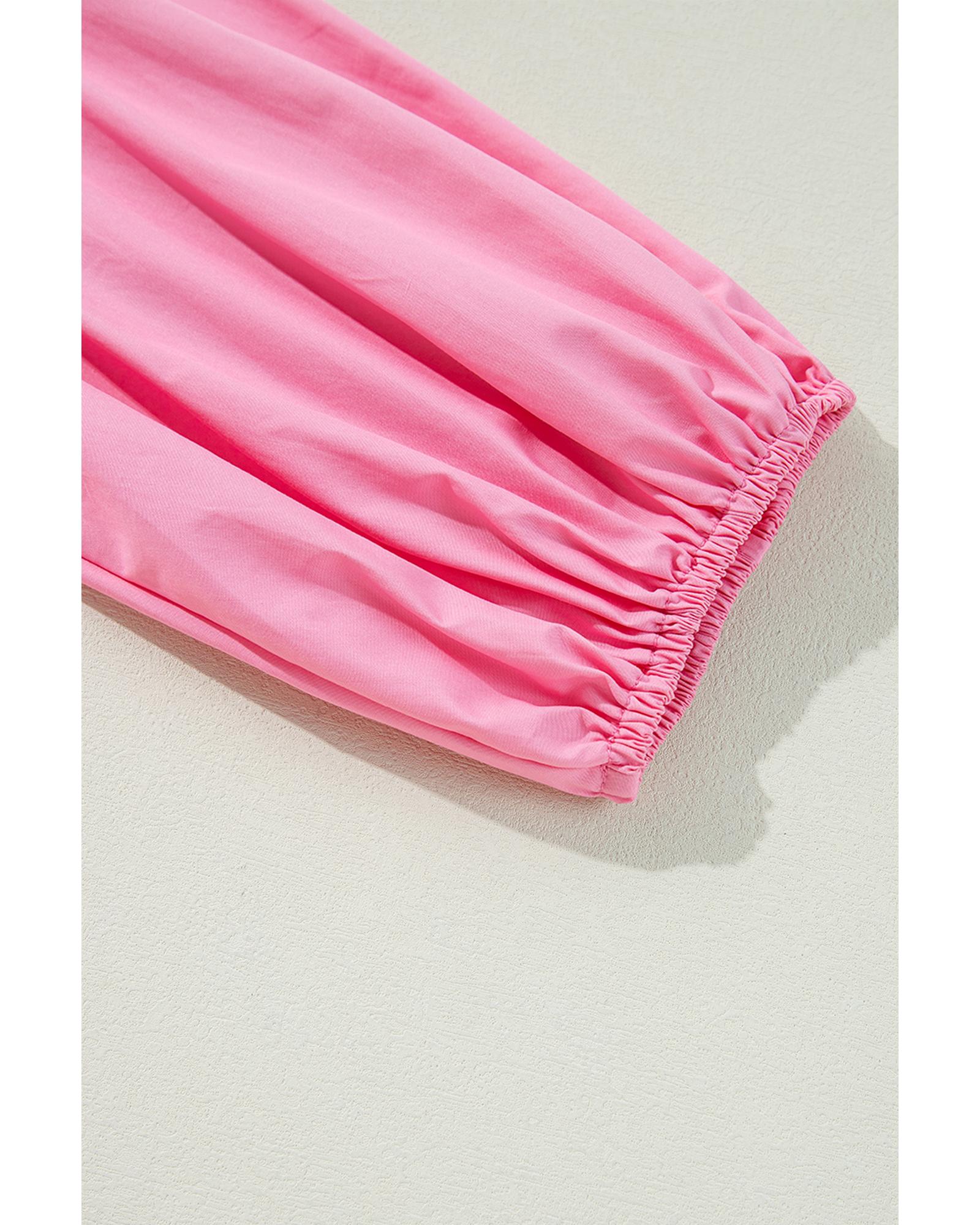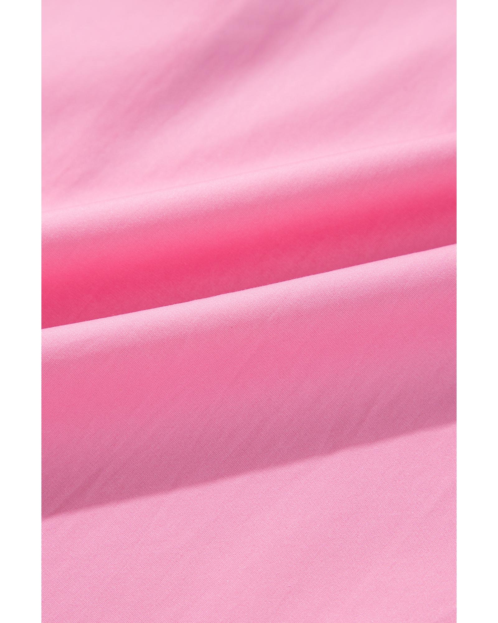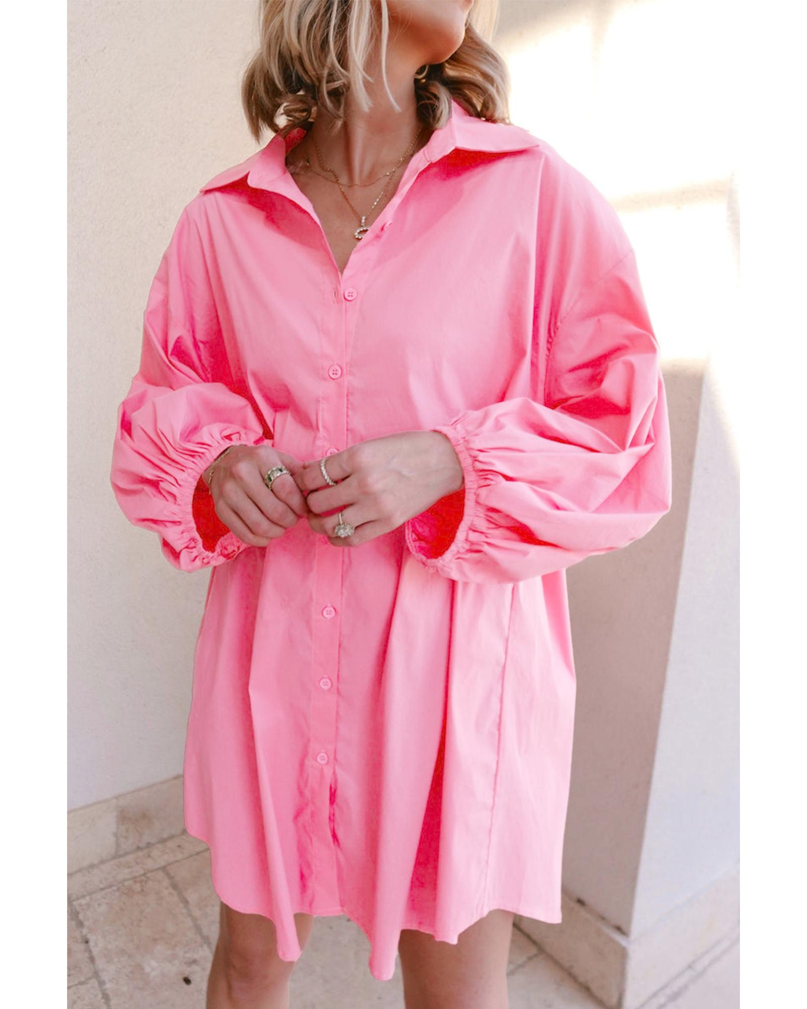 This bright pink balloon sleeve button-up mini shirt dress offers a trendy and versatile style with a chic collared neckline and a sleek solid color palette. Designed with a fitted look, it combines comfort and fashion for various occasions.