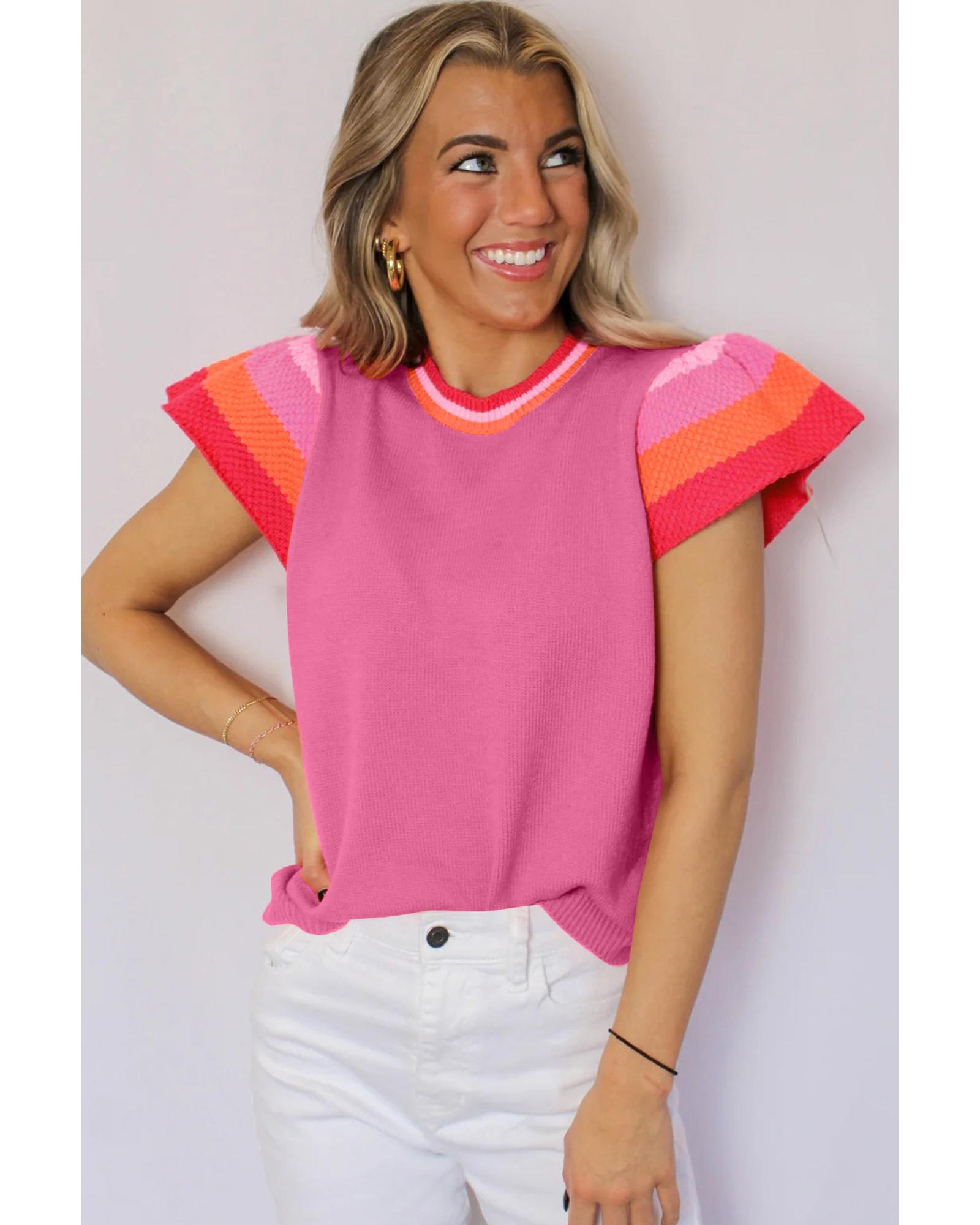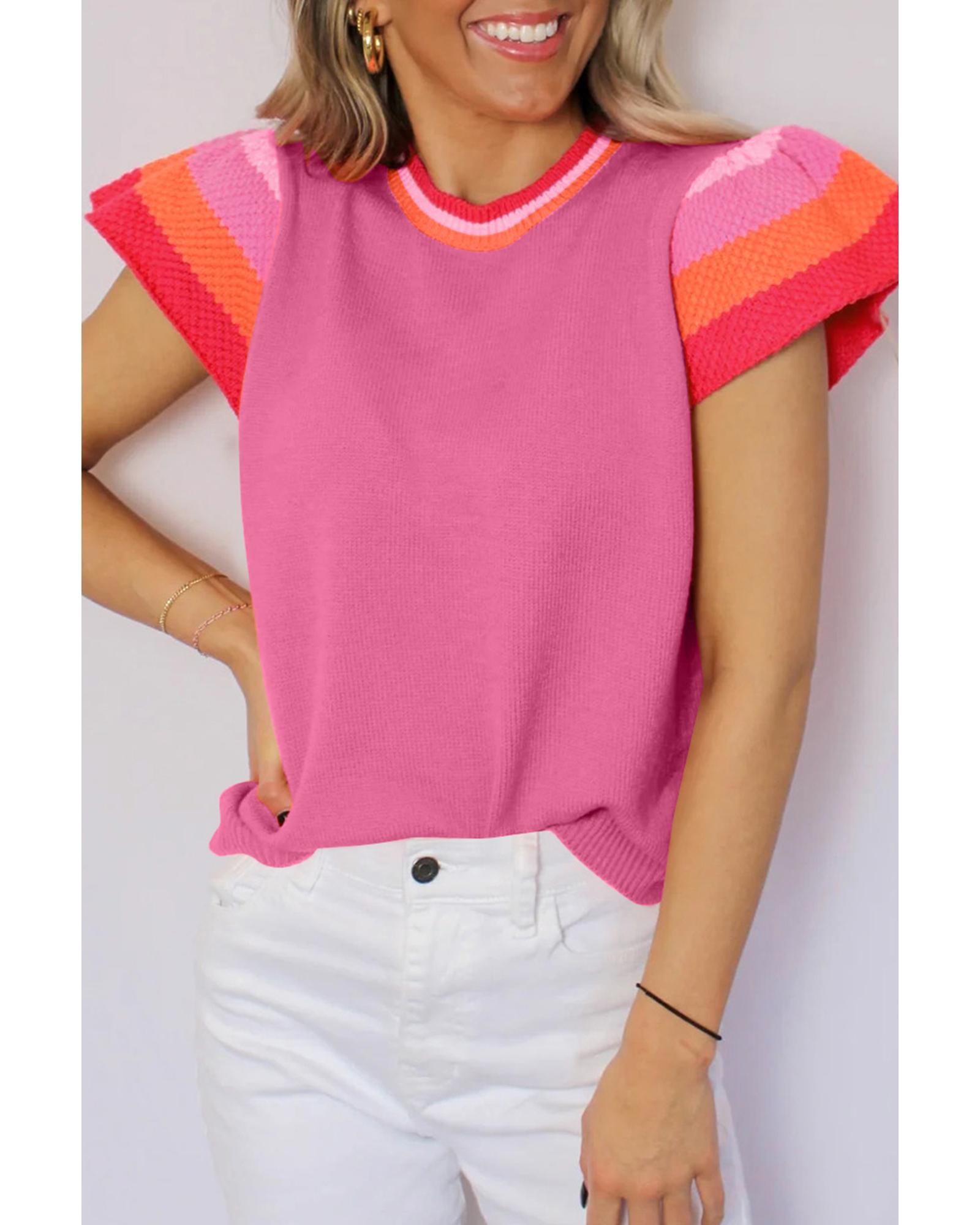 This bright pink knitted sweater T-shirt features a trendy fitted design with feminine flutter sleeves and contrasting crew neck and sleeve details. It offers a relaxed fit suitable for various body shapes and is ideal for warm weather, making it versatile for all four seasons.