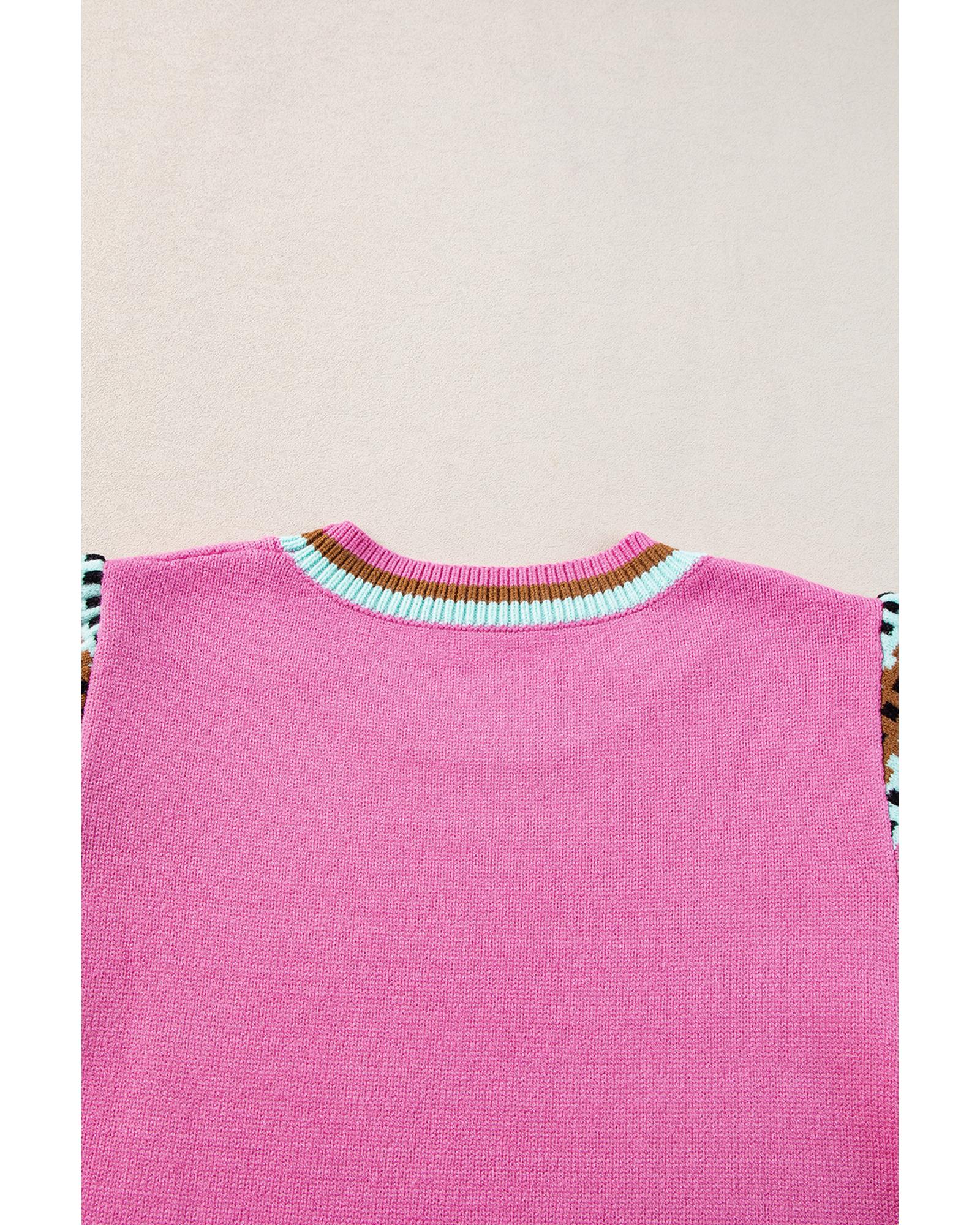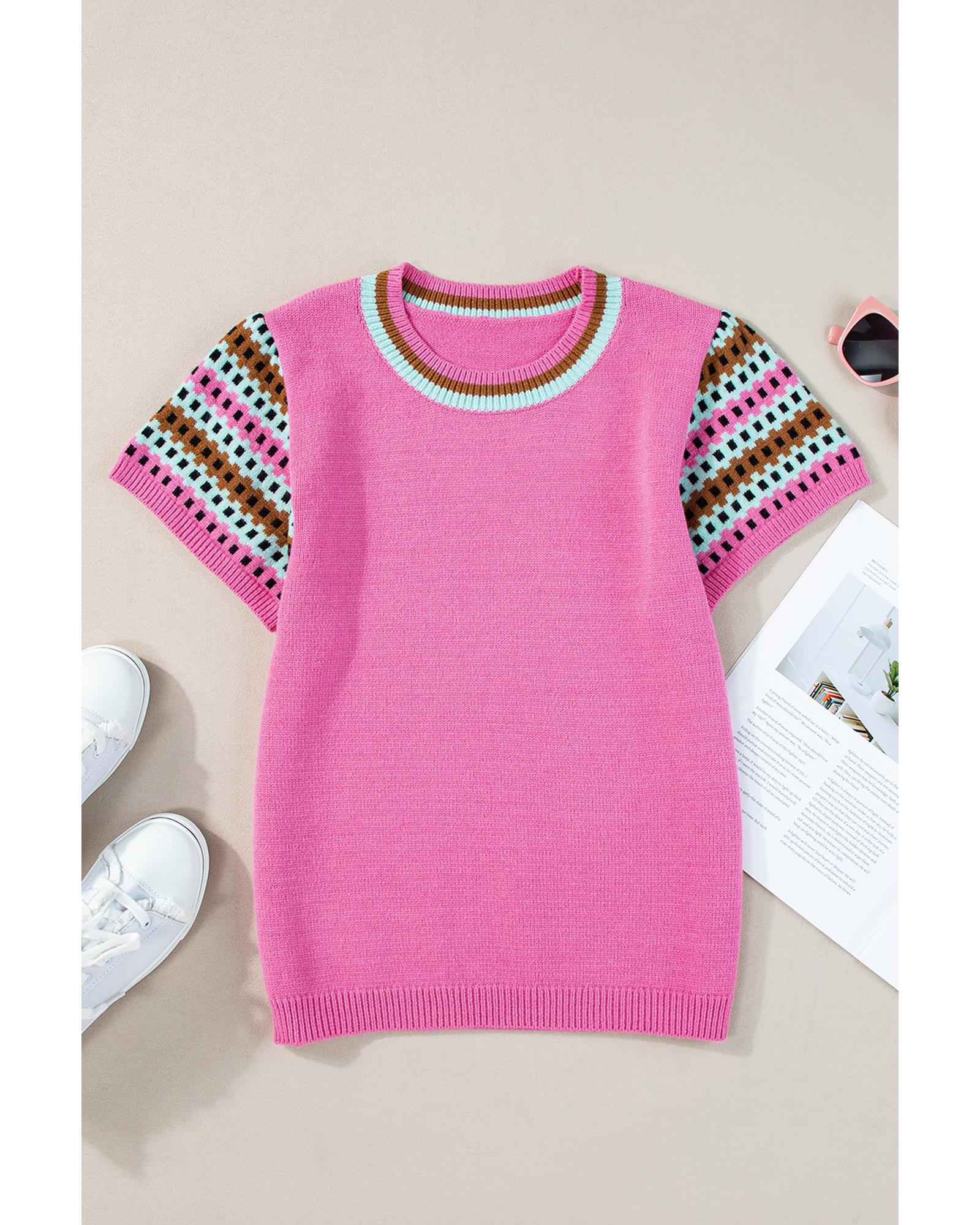 This bright pink contrast printed cap sleeves crewneck sweater offers a trendy and fitted look, making it a stylish choice for transitional seasons. Its fun sleeve pattern adds a unique contrast detail, while the classic crew neck design ensures versatile wear. This sweater pairs well with denim or skirts for a casual yet fashionable outfit.