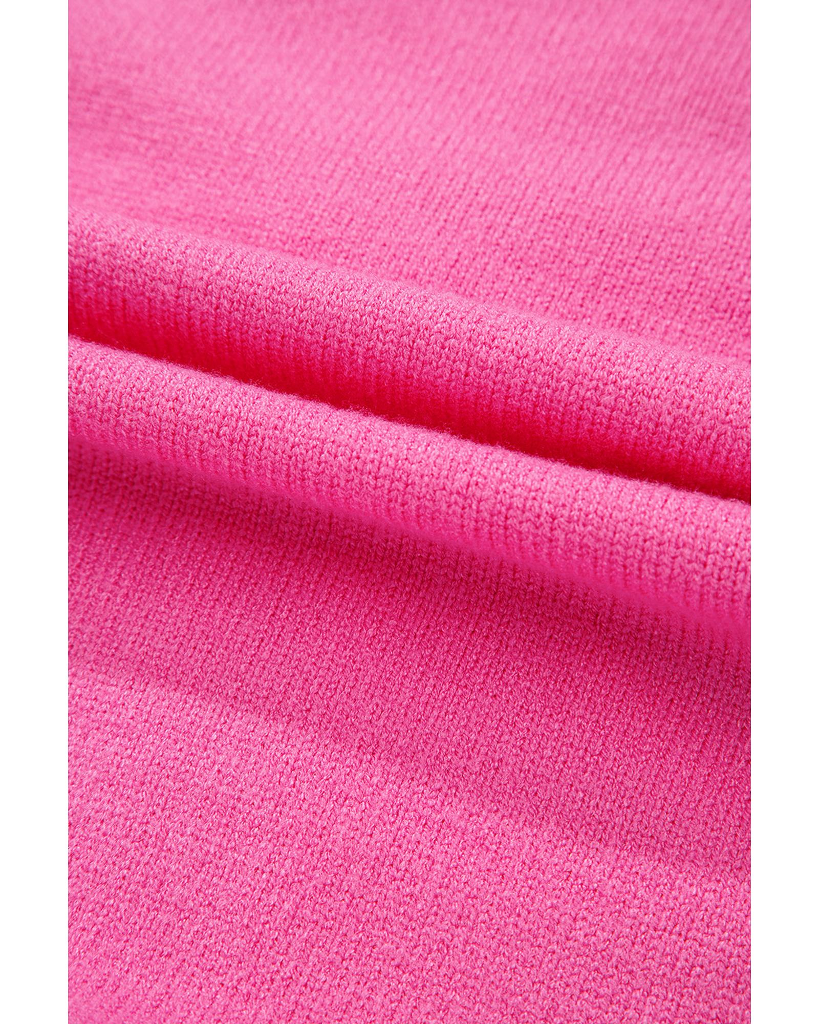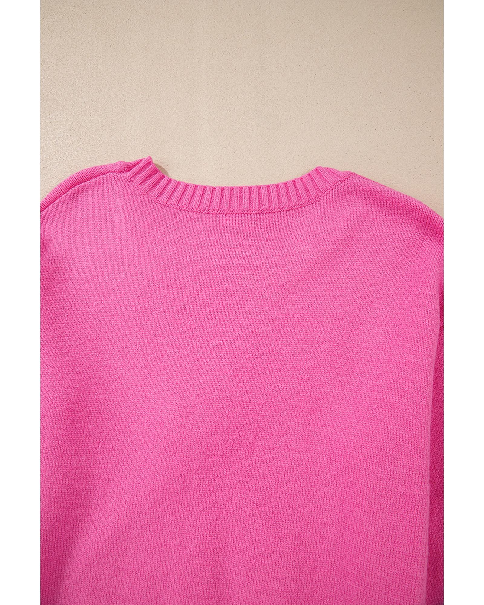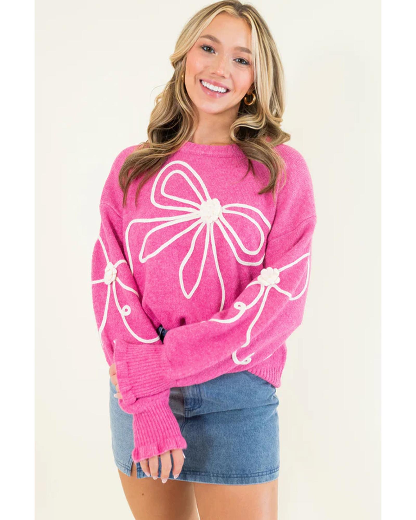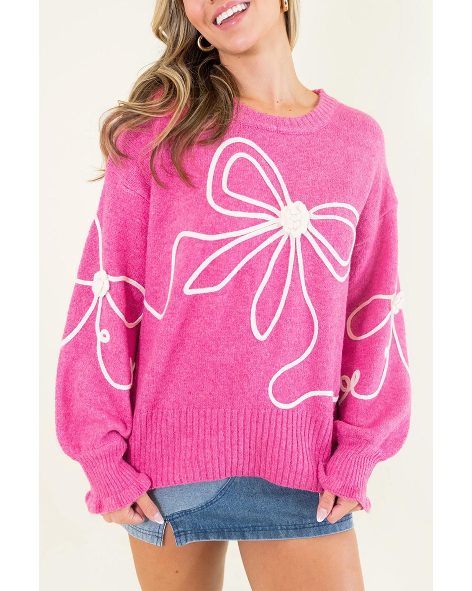 Bright Pink Corded Flower Bow Ribbed Trim Casual Sweater – XL