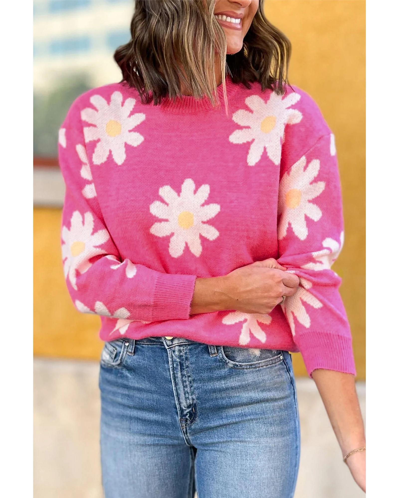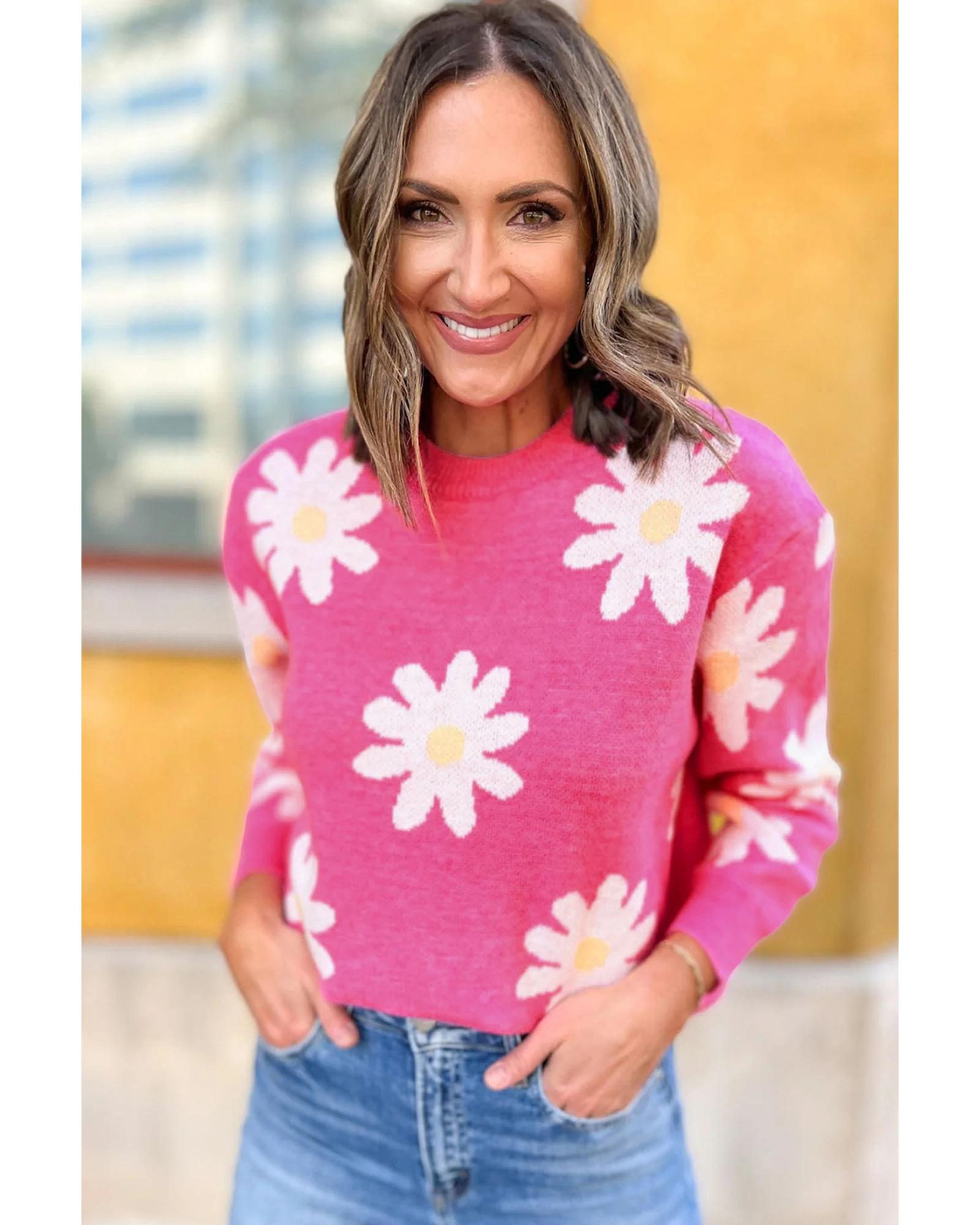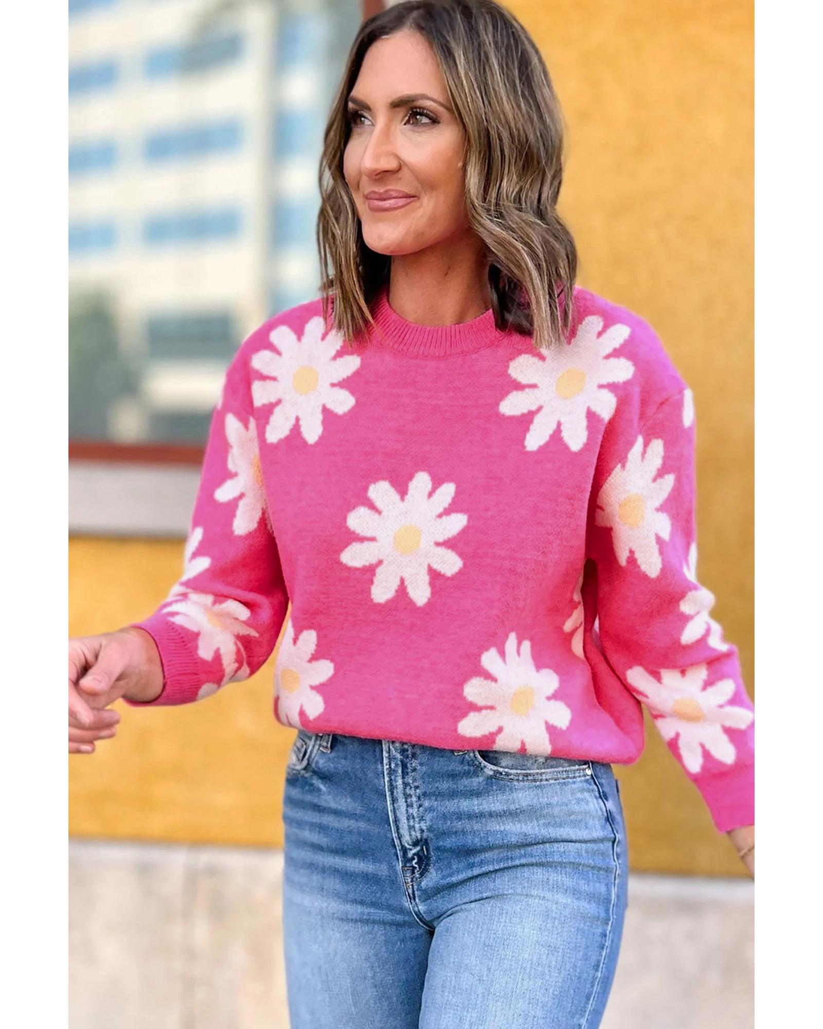 This bright pink daisy flower crew neck sweater features a trendy fitted design with long sleeves and a classic crew neckline. Made from a knitted material with ribbed trim, it offers both style and comfort for everyday wear.