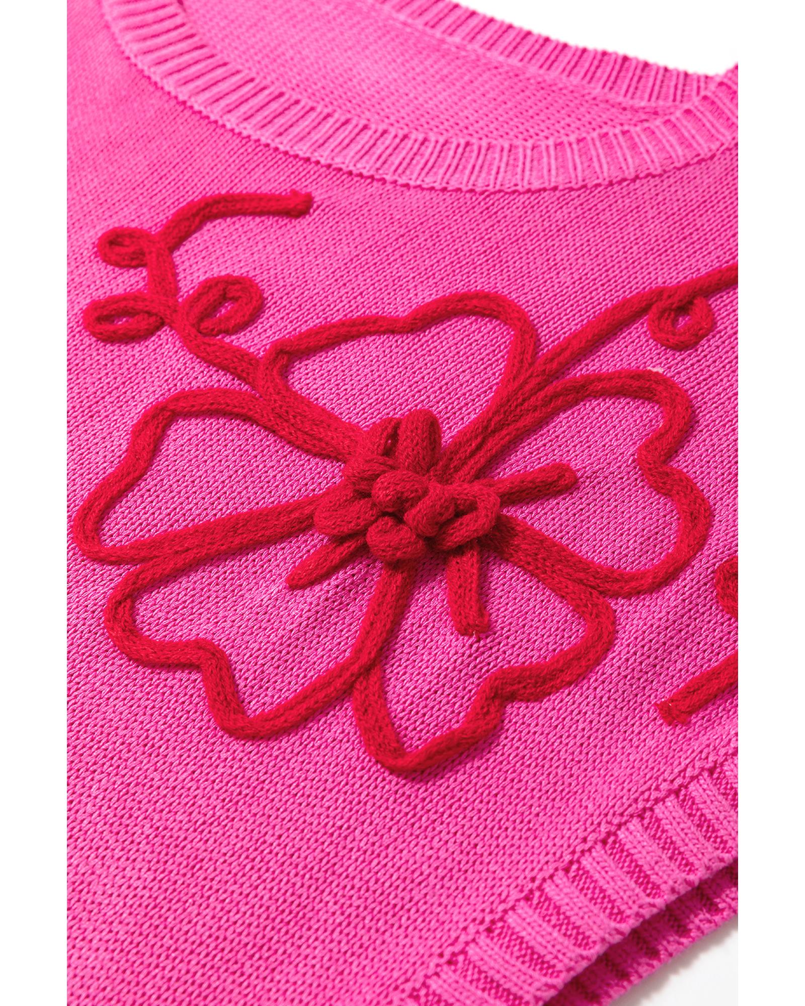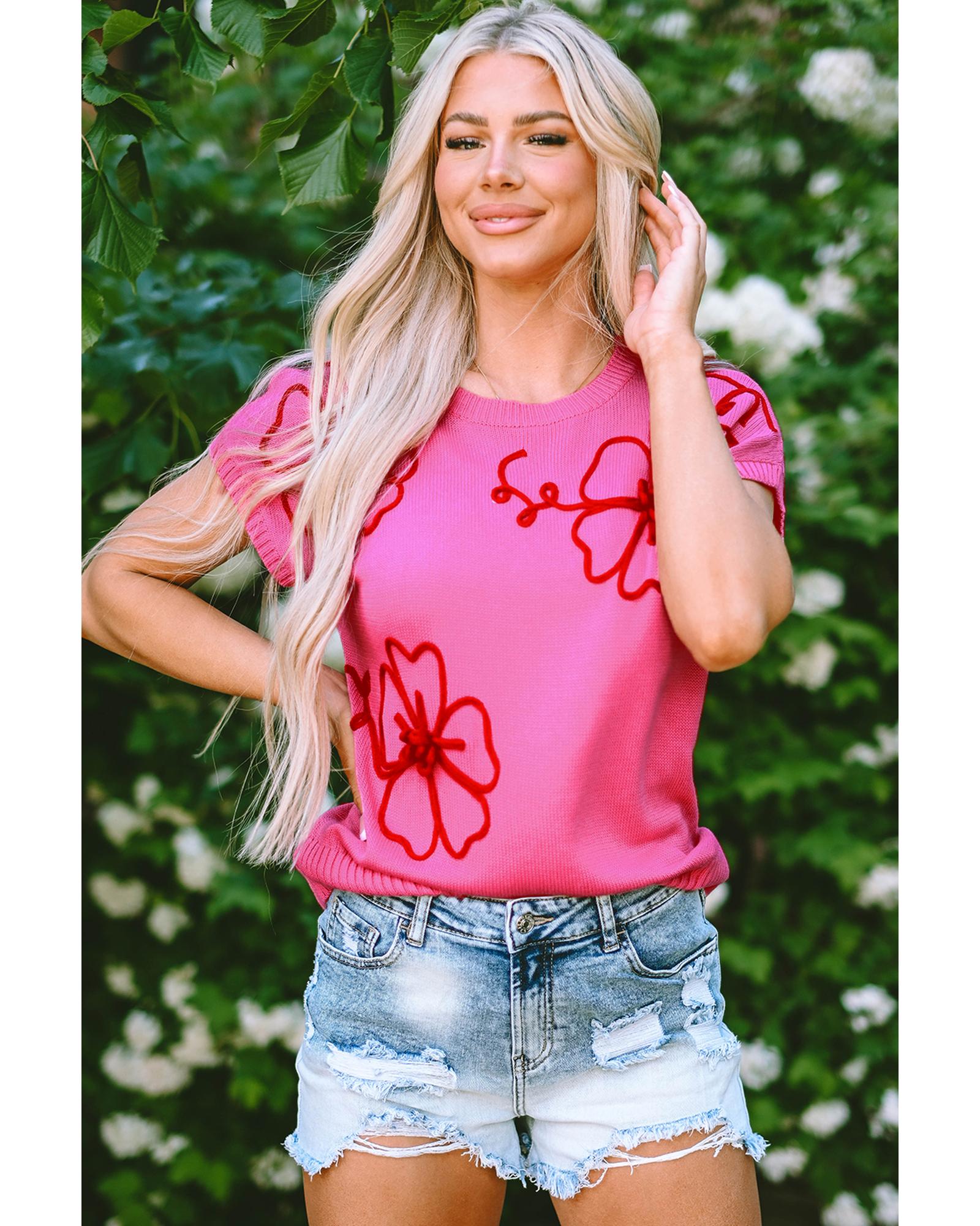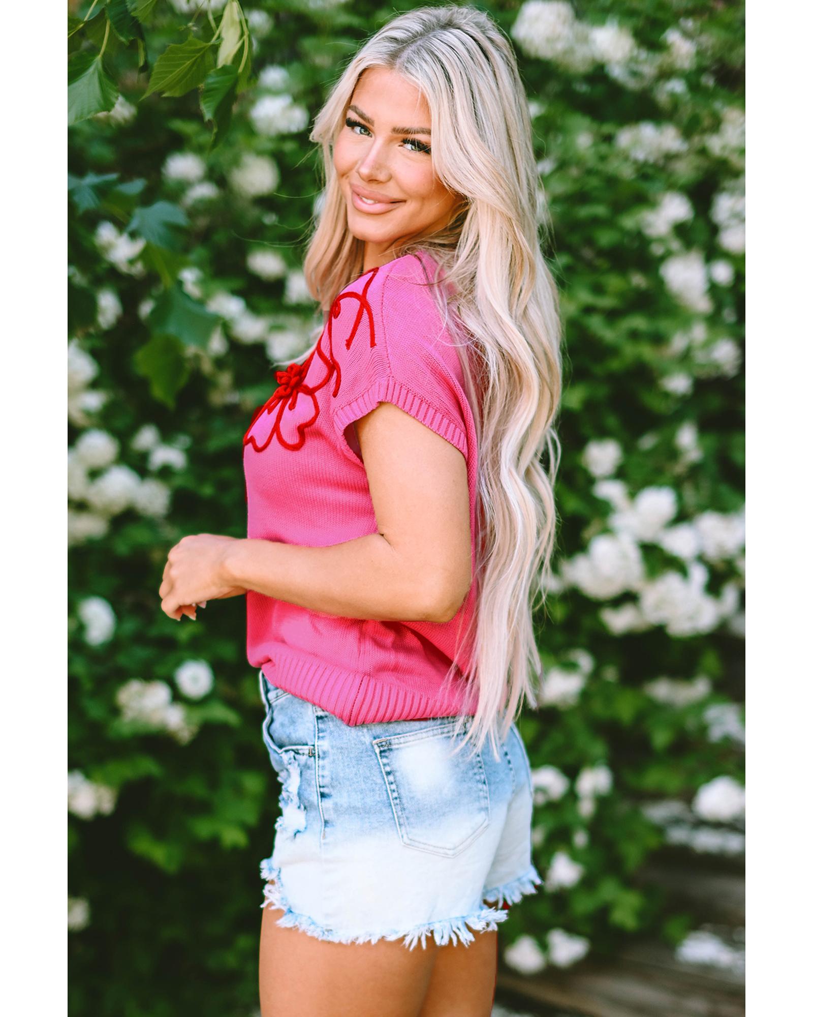 Bright Pink Flower Embroidery Short Sleeve Knitwear Top – L