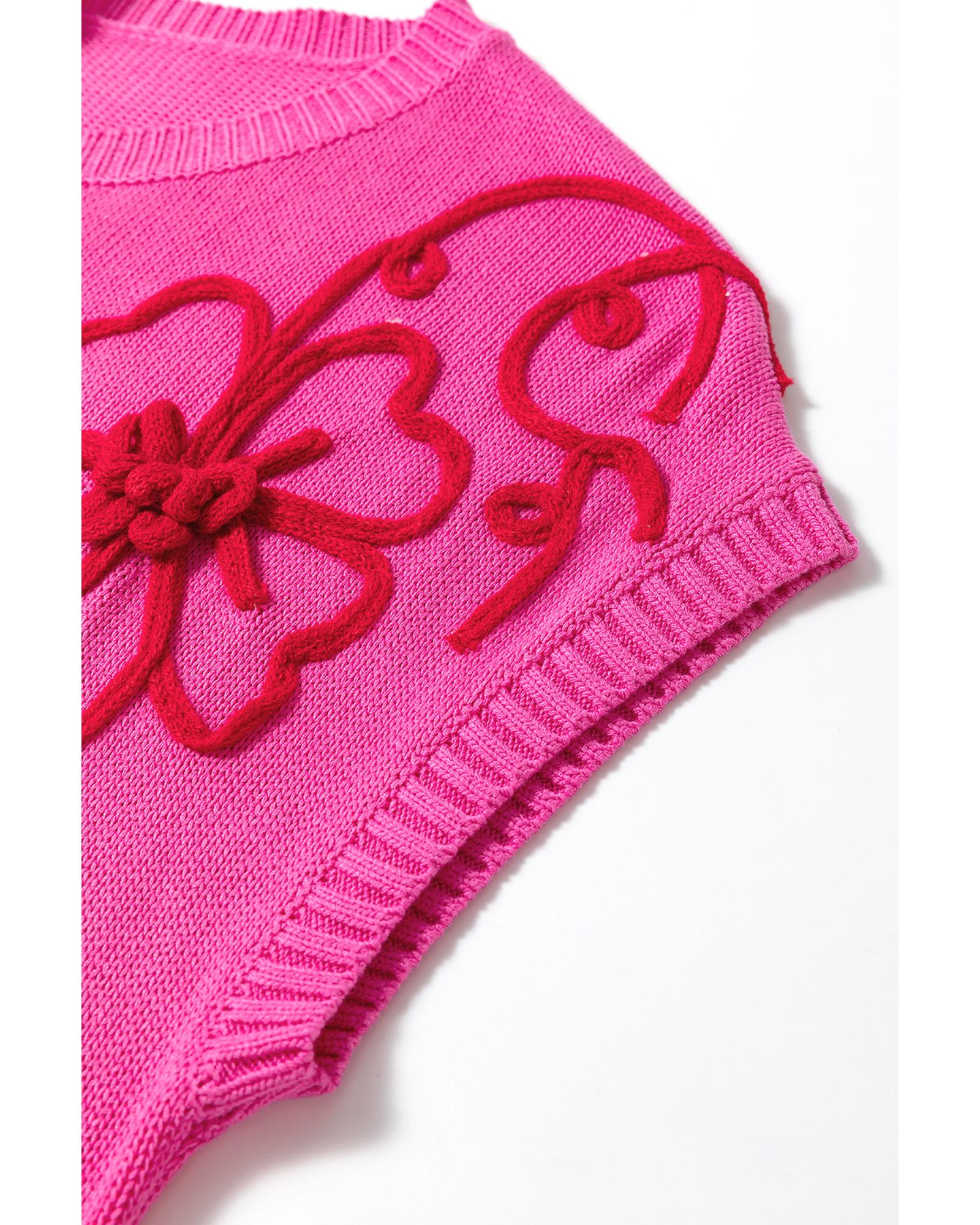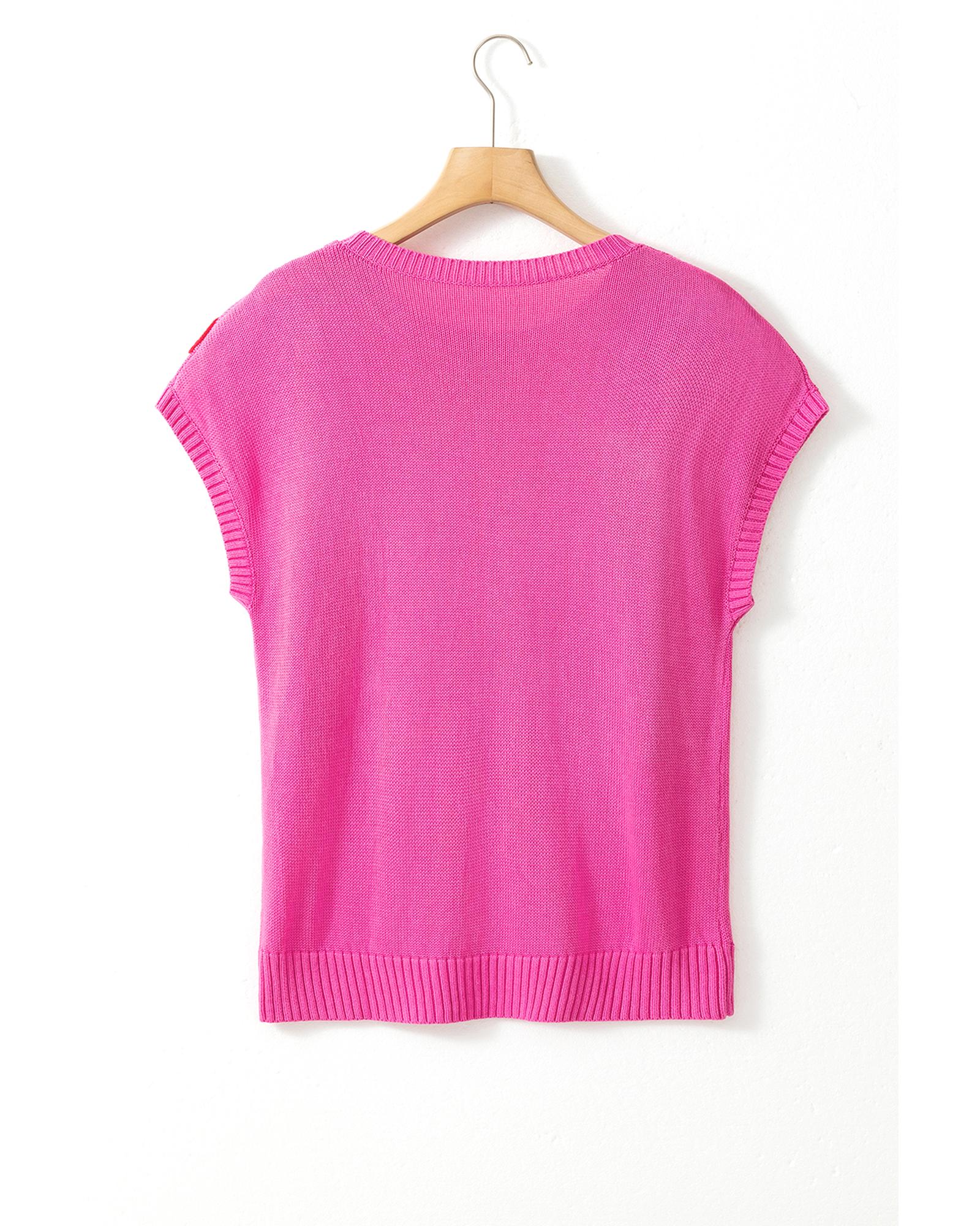 Bright Pink Flower Embroidery Short Sleeve Knitwear Top – XL