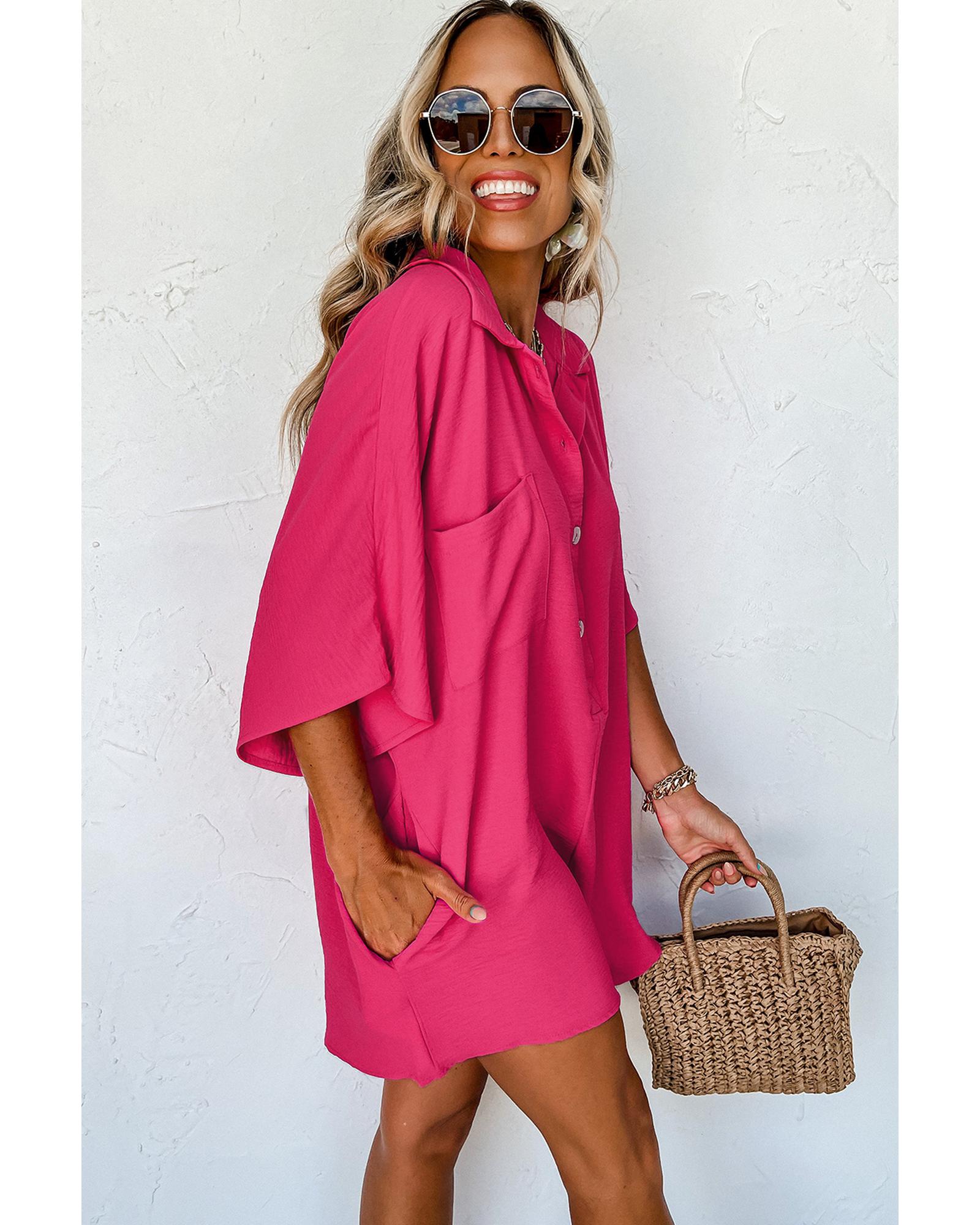 This bright pink half-button collared romper offers a casual and stylish look with a loose fit, making it suitable for various body types. Its versatile design allows for easy pairing with different shoes or sandals, perfect for daily wear.