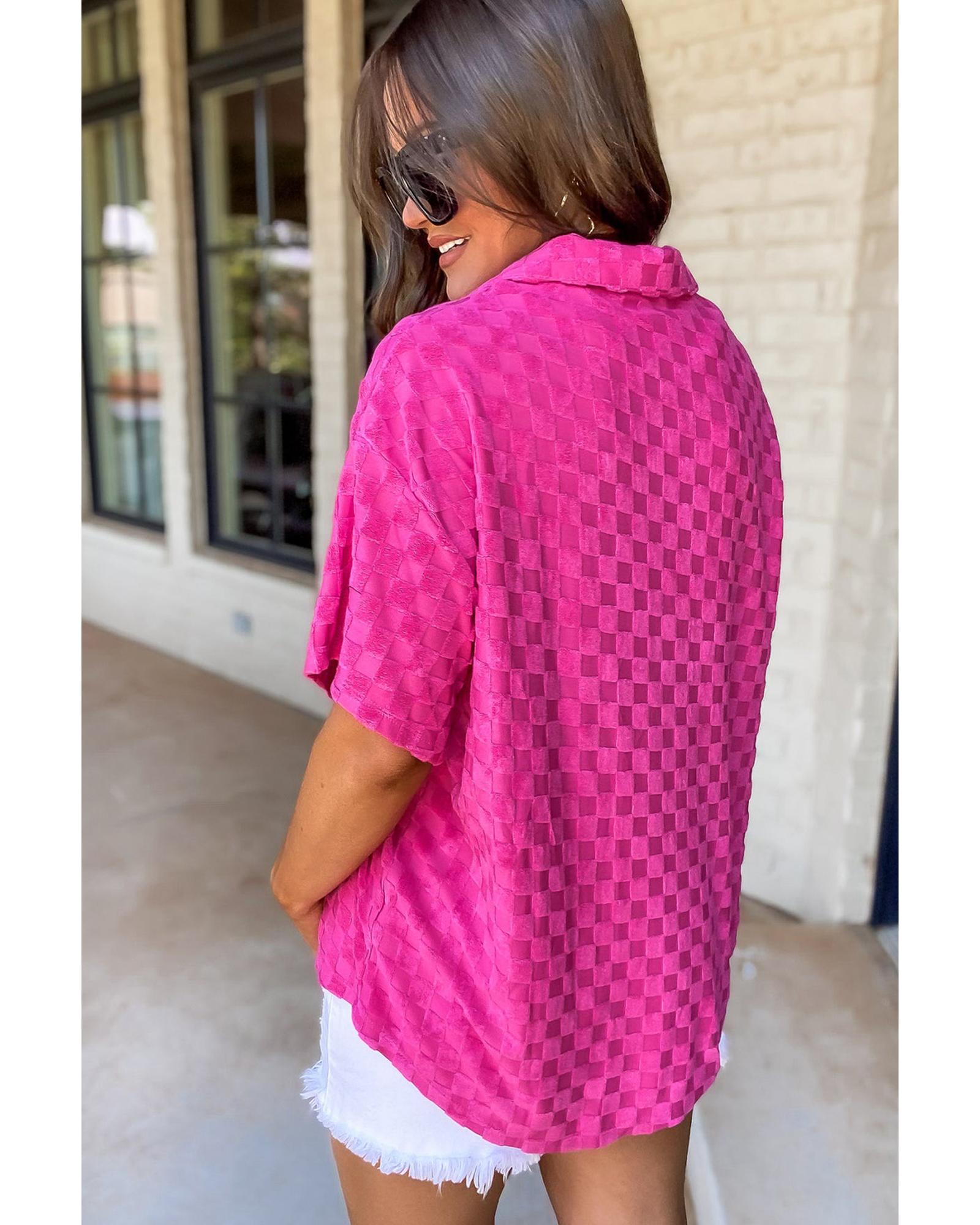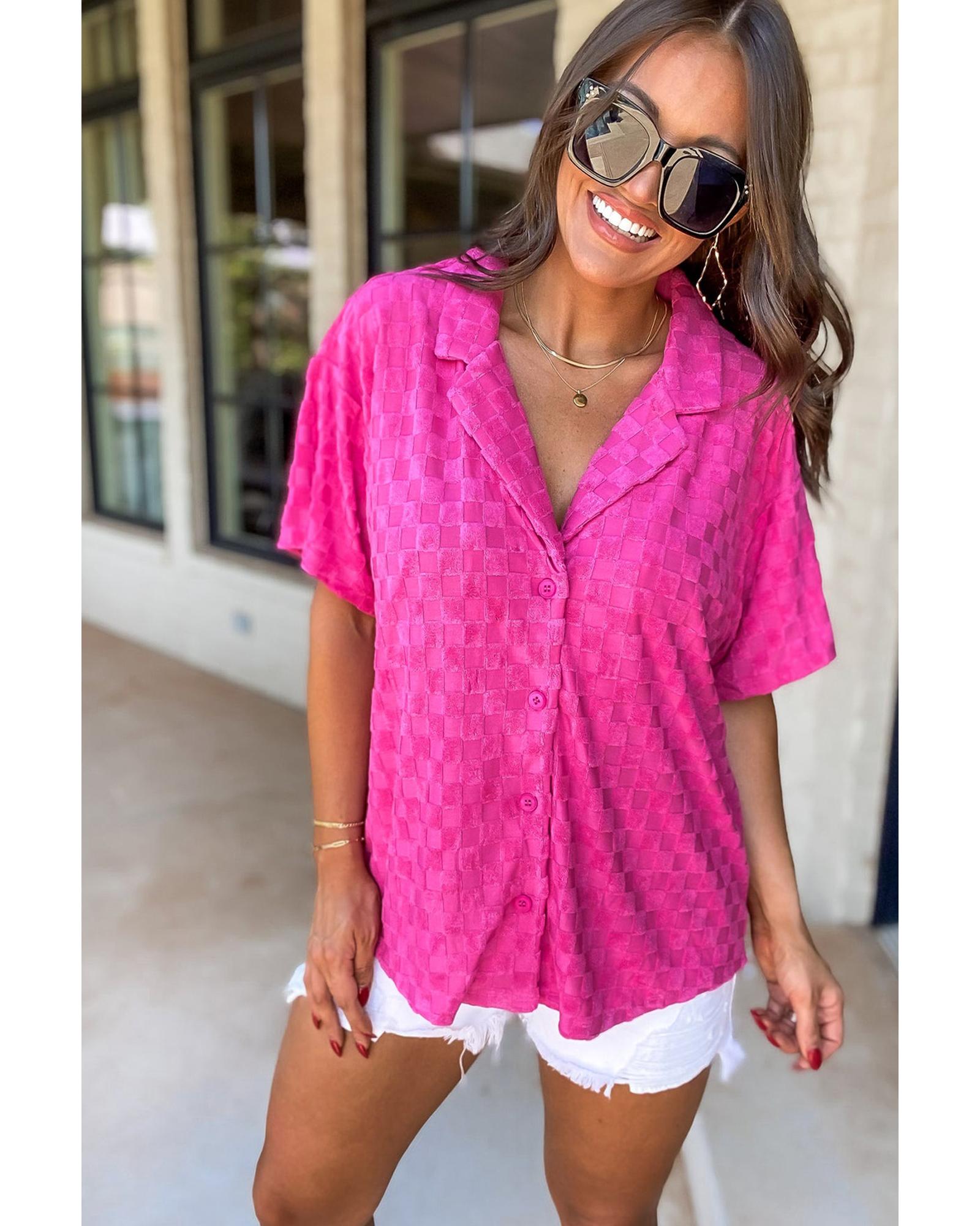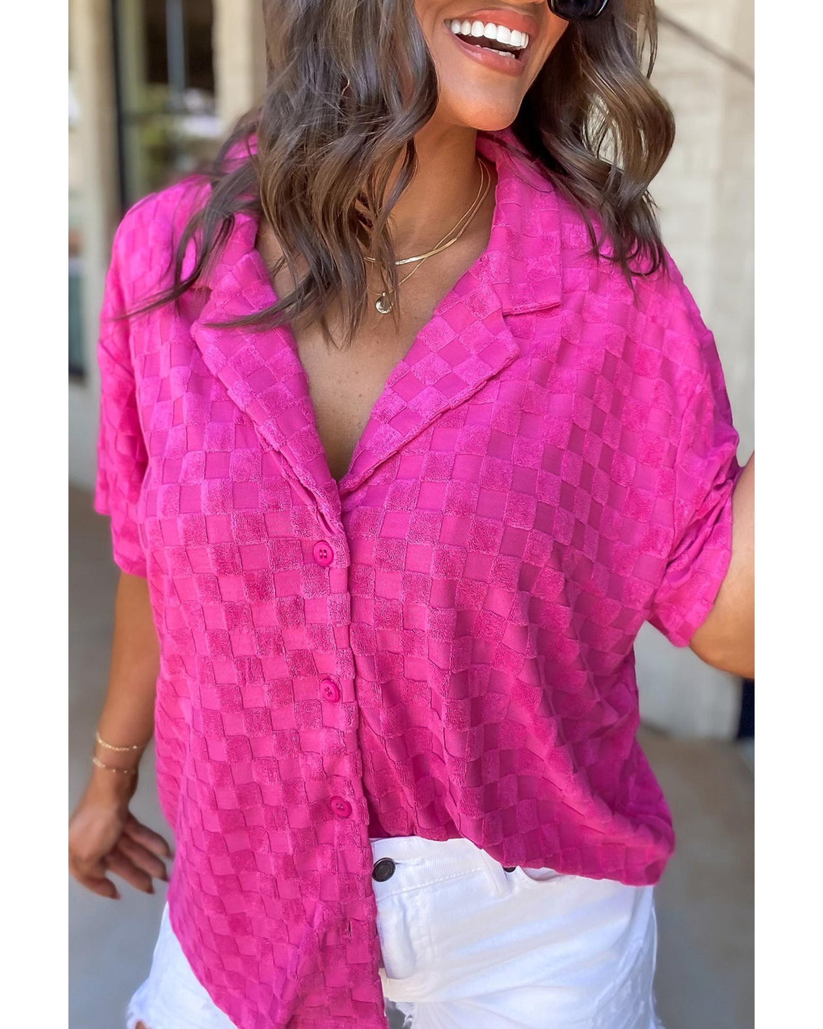 Bright Pink Lapel Neck Checkered Textured Short Sleeve Shirt – L