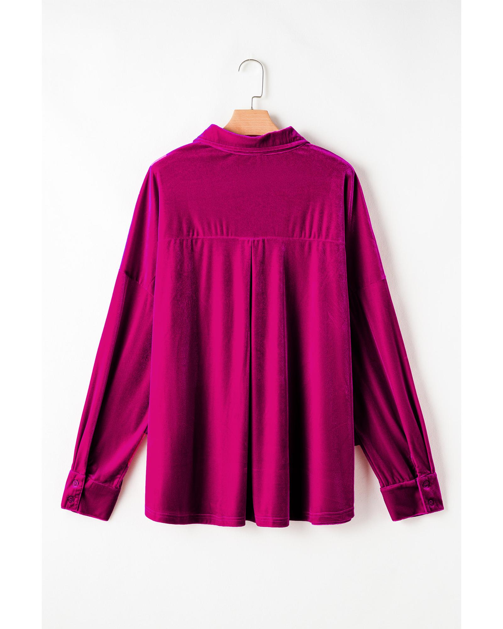 This plus size velvet shirt features a vibrant pink color and a relaxed fit, designed with a trendy and comfortable style. It is suitable for various casual occasions and offers a soft touch with its velvet fabric. The shirt includes functional chest pockets and drop shoulder detailing, complemented by a classic button design for a timeless look.