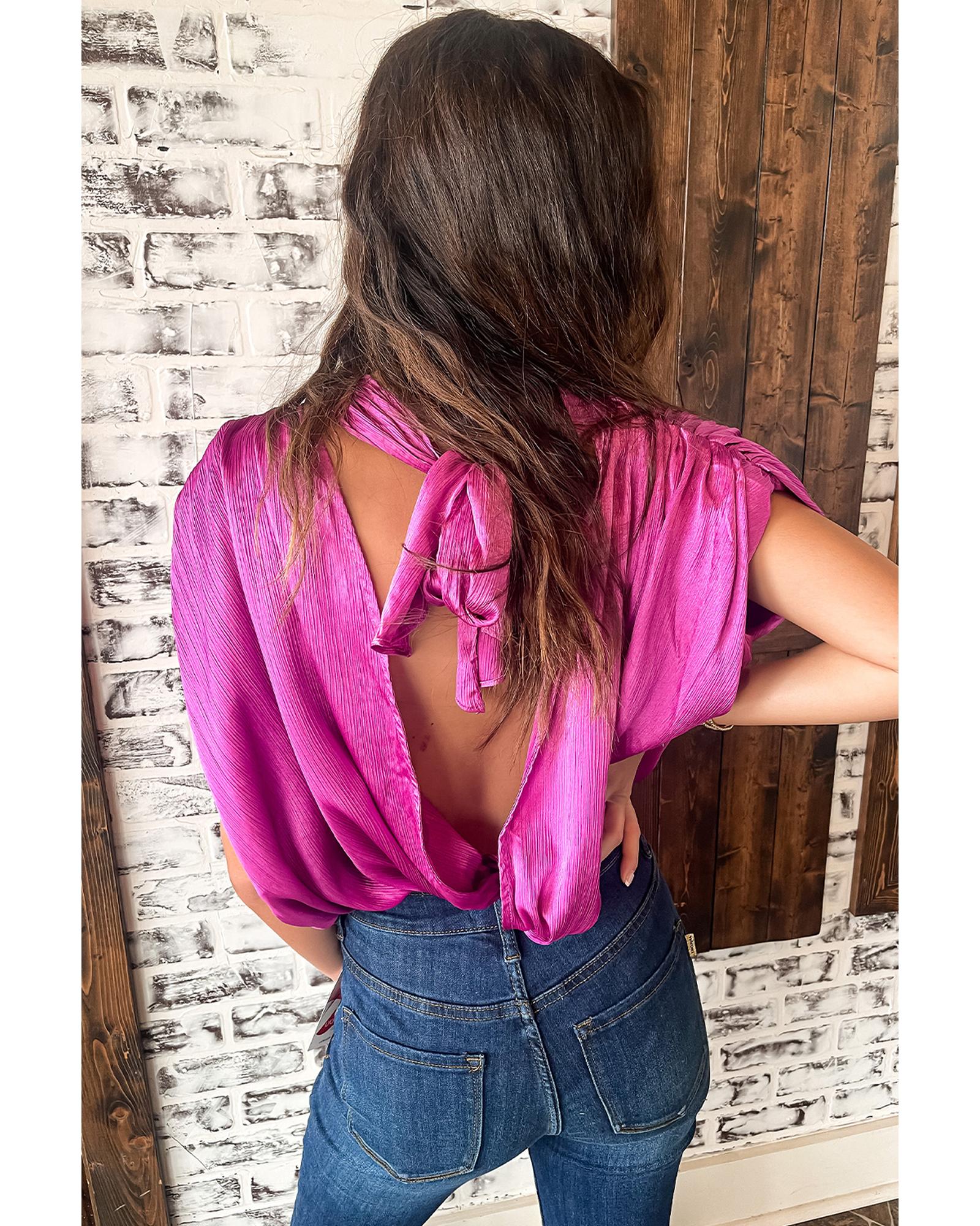 This bright pink, backless blouse features a trendy fitted design with a unique shiny fabric that catches the eye. It is suitable for various casual and stylish outfits, offering a versatile addition to your wardrobe.