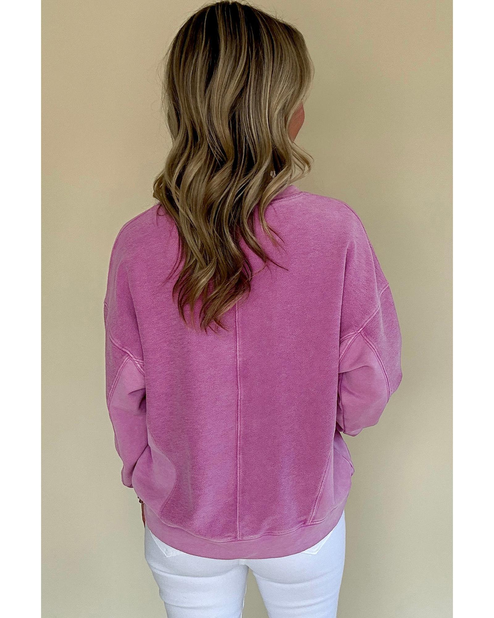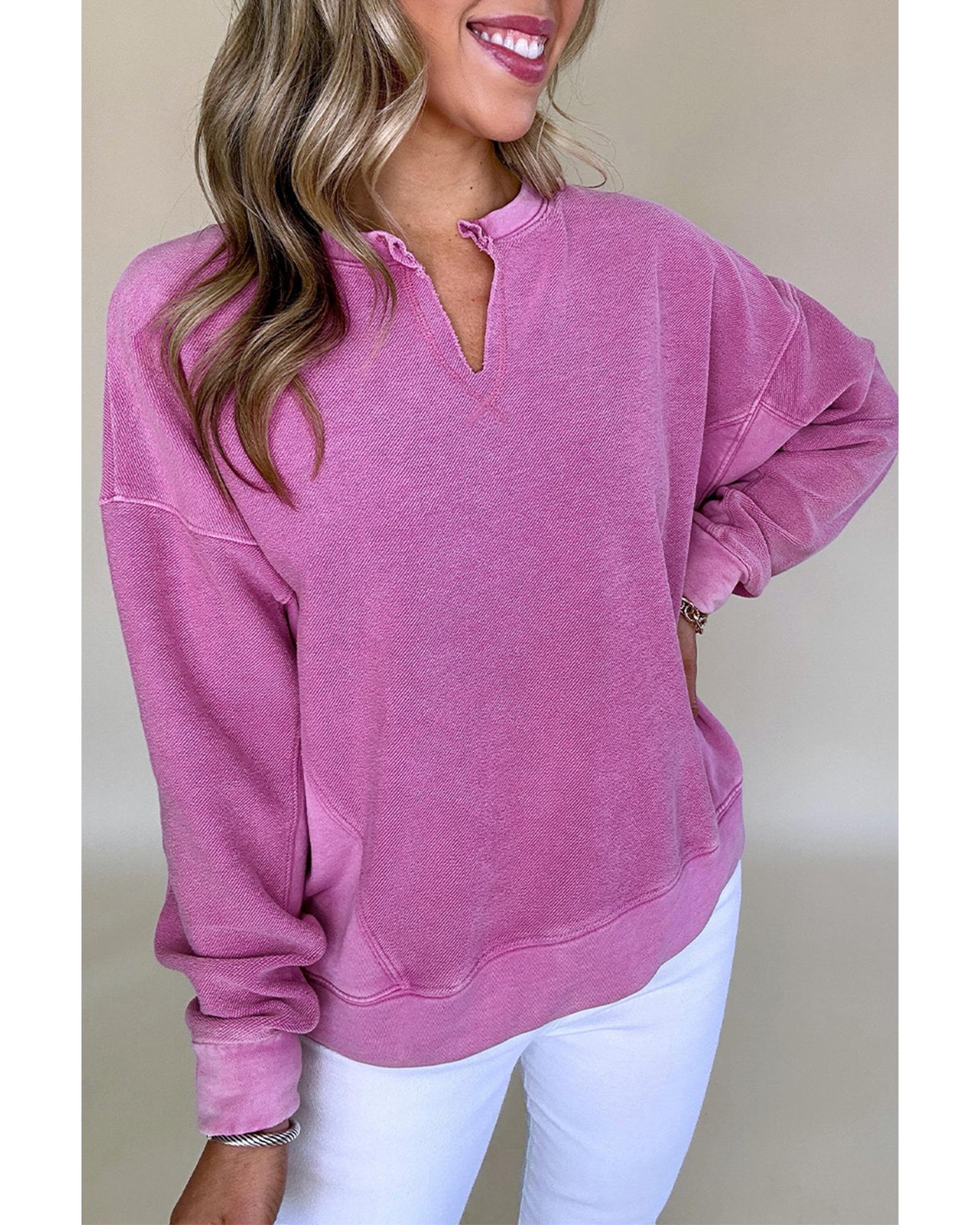 This bright pink solid color sweatshirt features a stylish notched neck and a relaxed fit, designed with a trendy and comfortable silhouette. The drop shoulder design adds a casual and modern touch, making it suitable for various casual occasions.