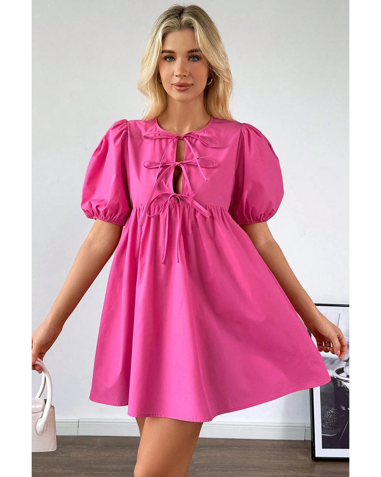 Bright Pink Solid Color Puff Sleeve Tie Front High Waist Mini Dress - S