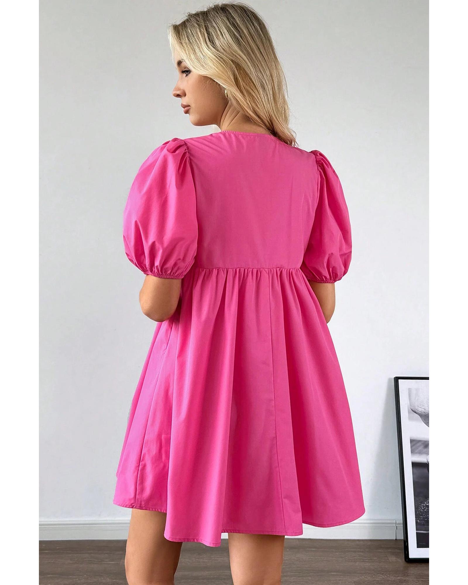 Bright Pink Solid Color Puff Sleeve Tie Front High Waist Mini Dress – XL