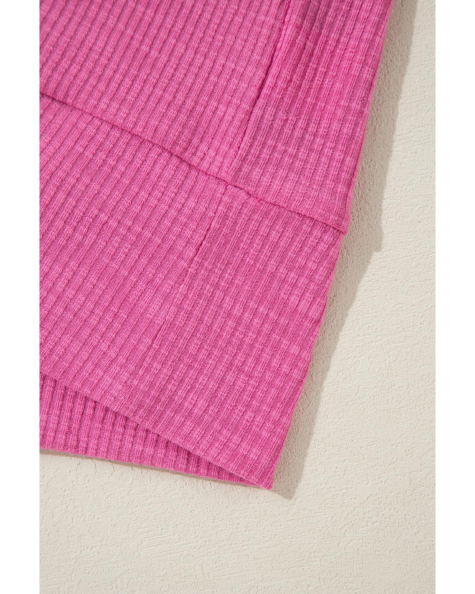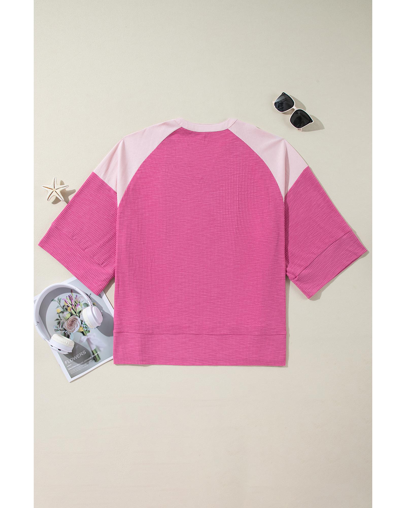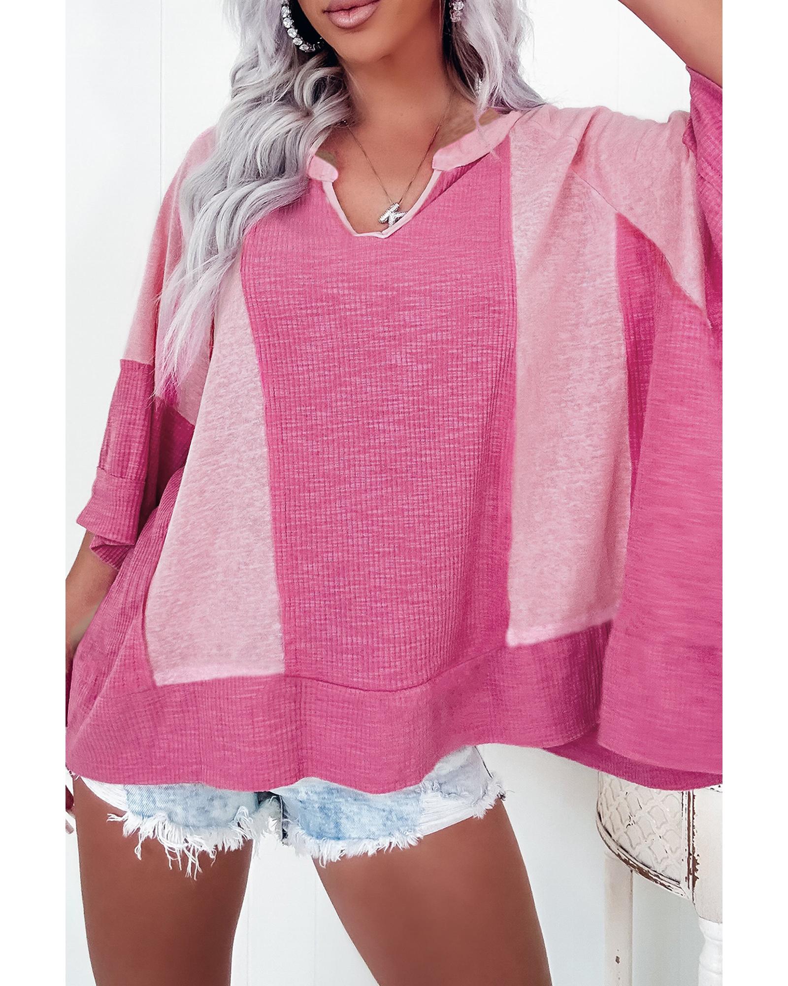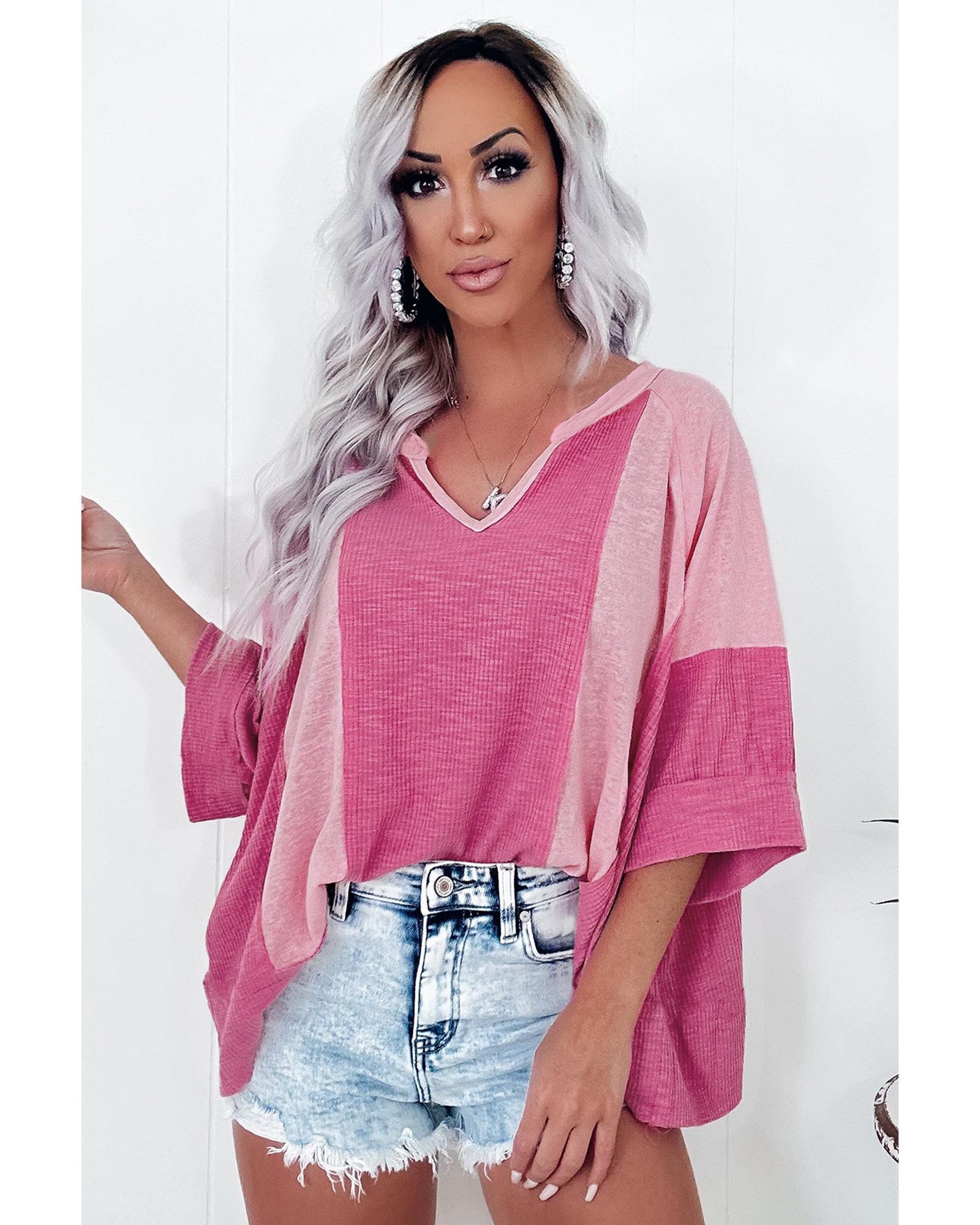 This bright pink textured colorblock top features a trendy oversized fit with 3/4 sleeves, making it a stylish choice for casual occasions. Crafted from a soft and comfortable knit fabric, it offers both comfort and fashion. The design is versatile and flattering, suitable for various casual settings.