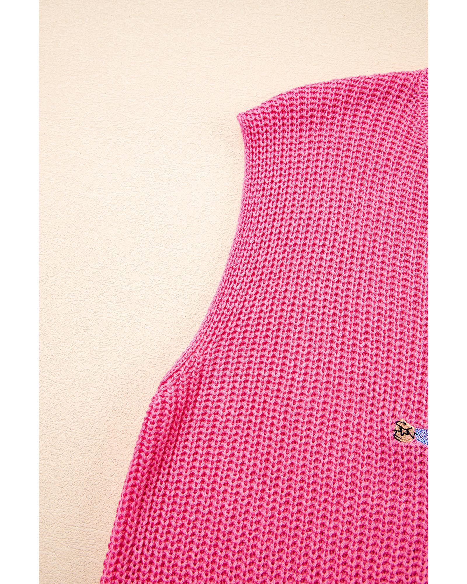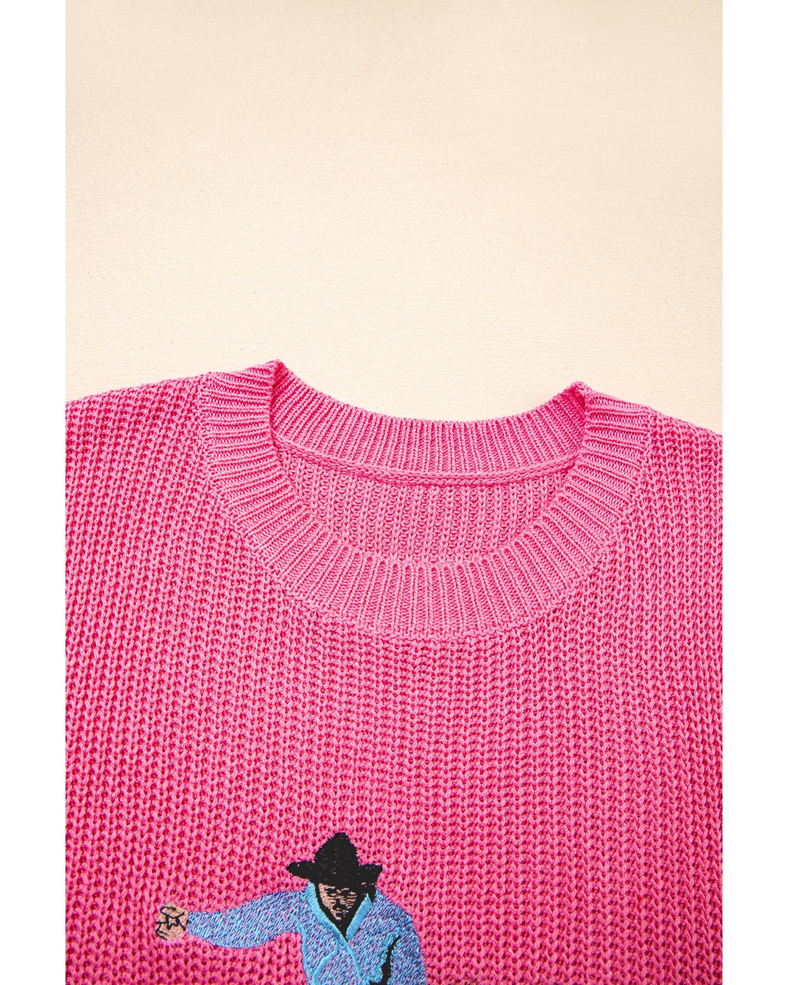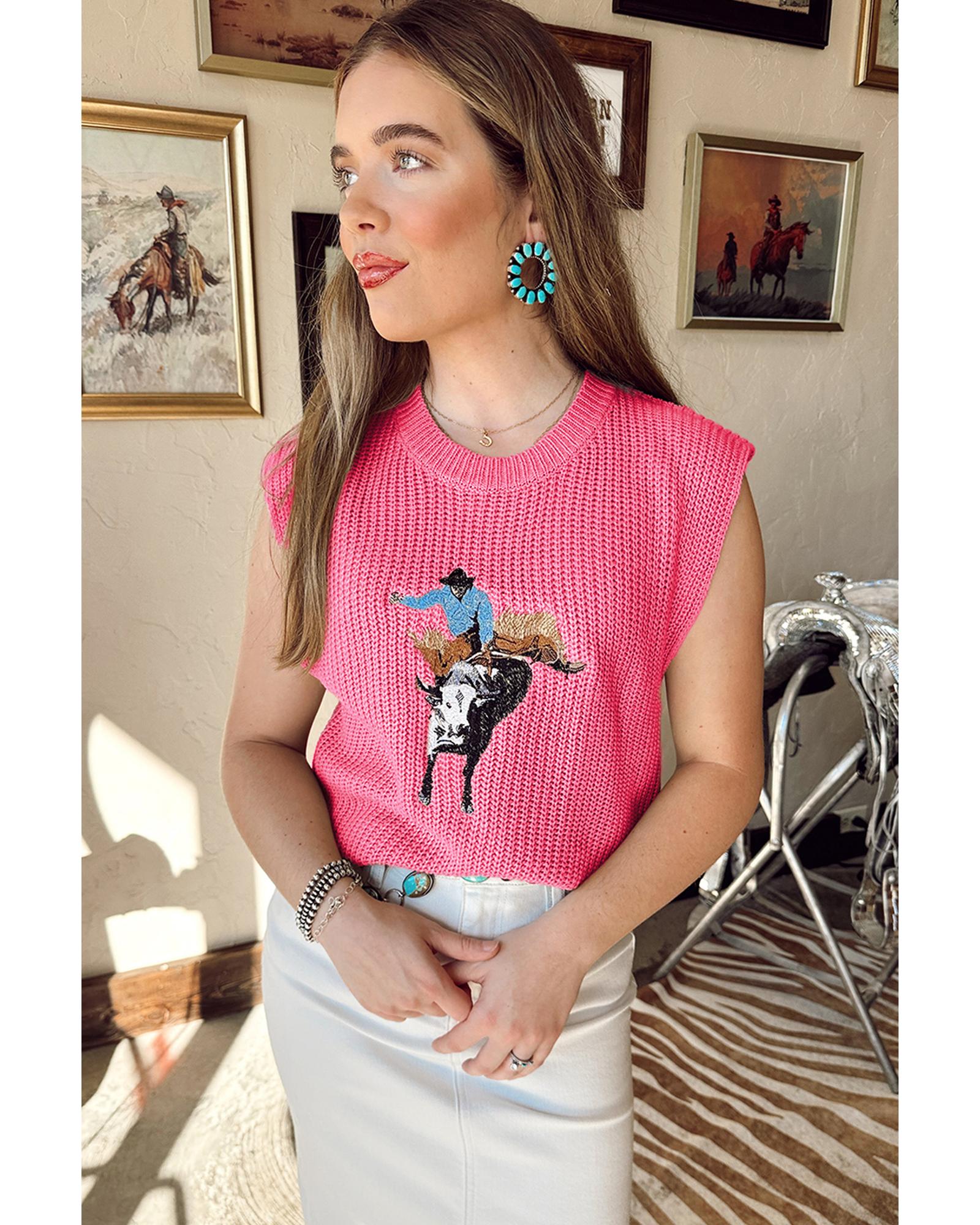 Bright Pink Western Cowboy Embroidery Round Neck Sleeveless Sweater – L