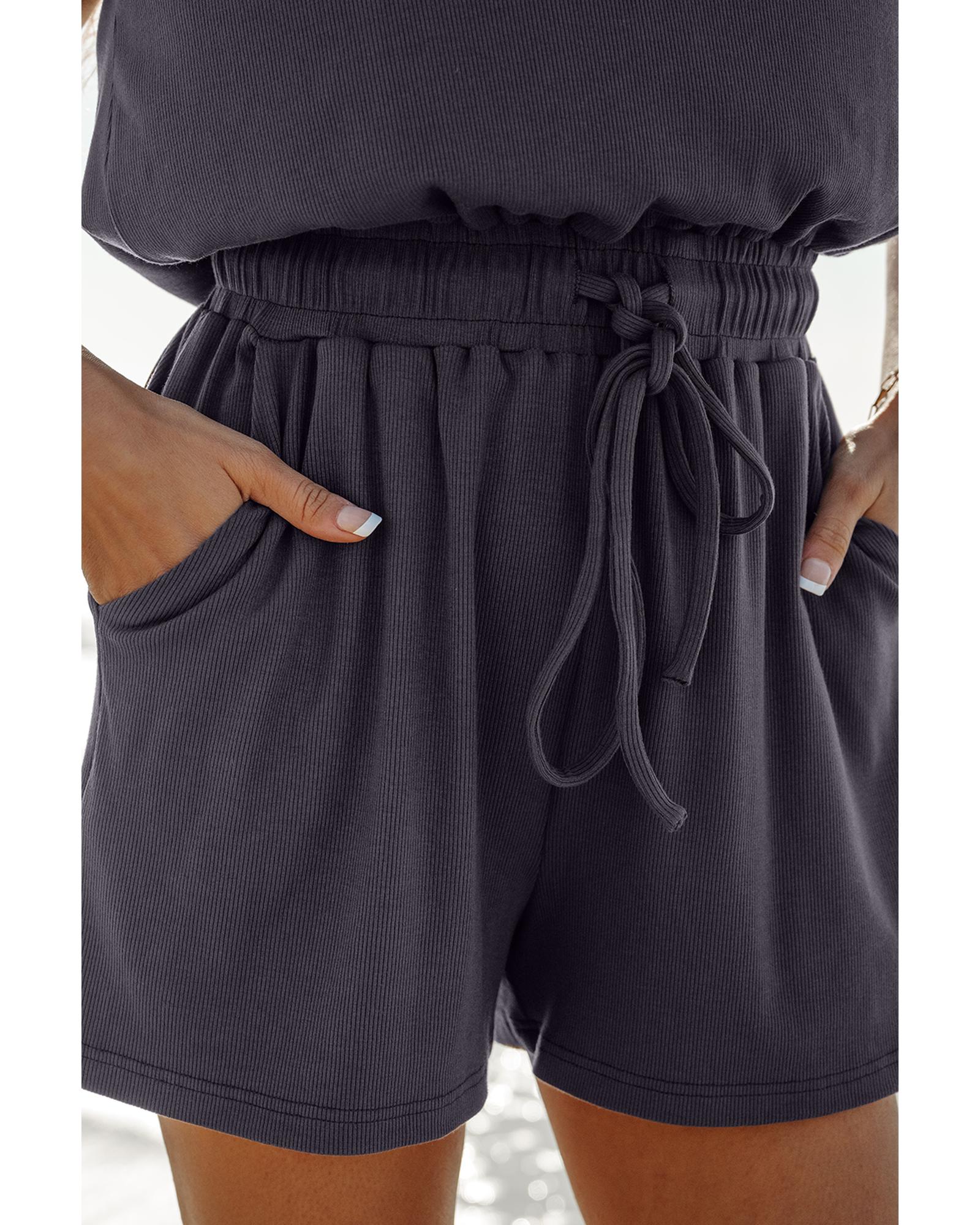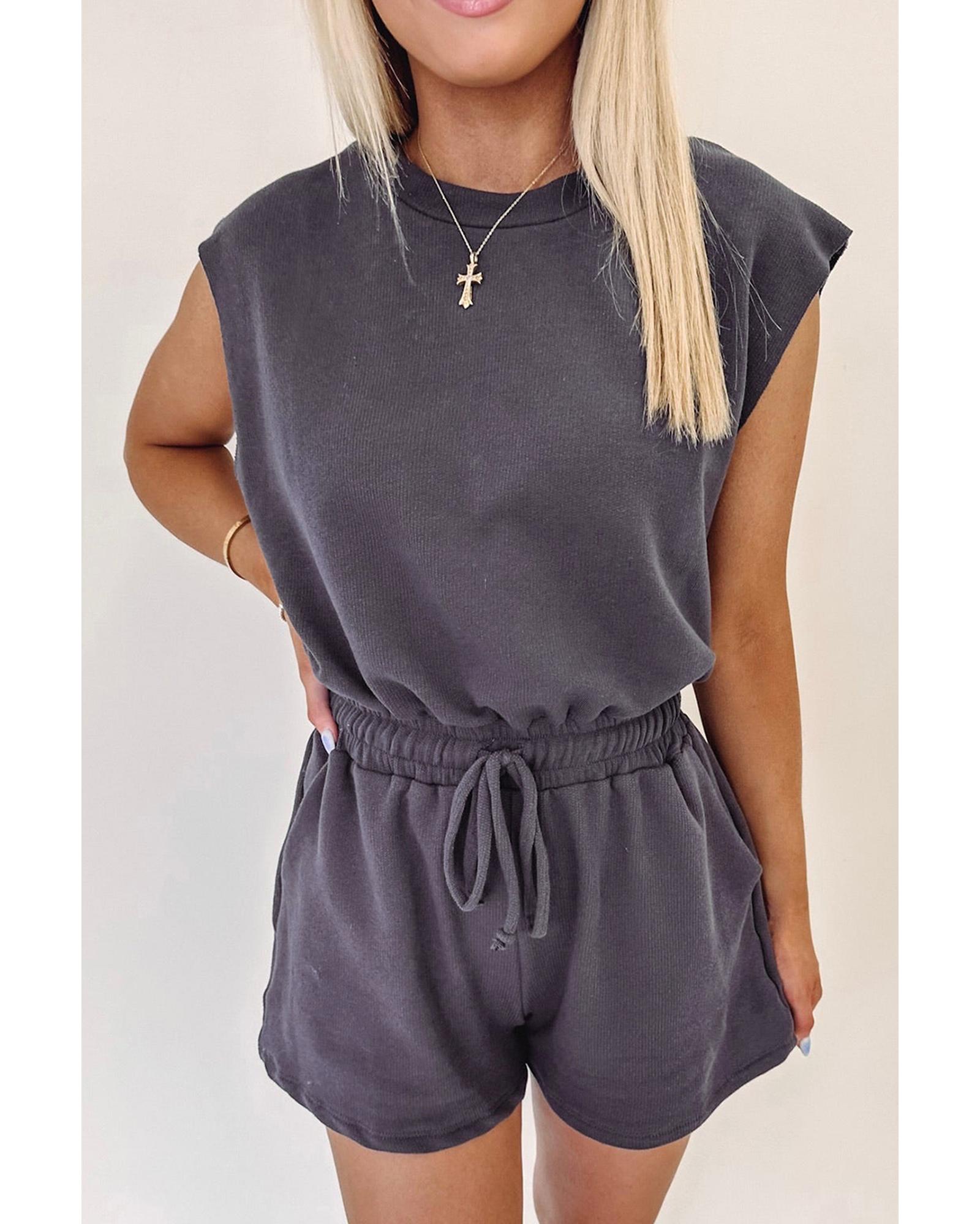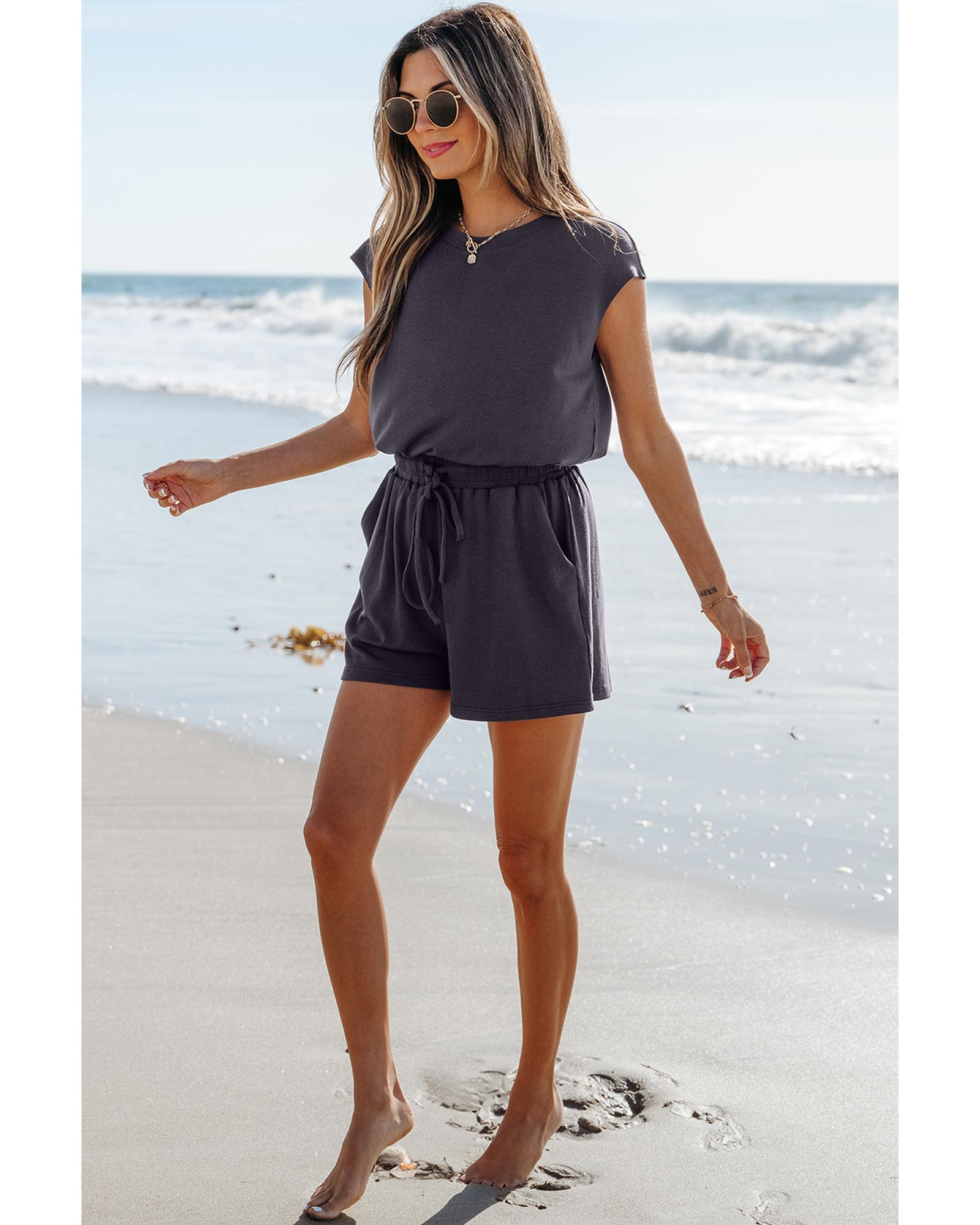 This romper features a stylish open back design with a comfortable cap sleeve and a drawstring waistline, making it a versatile addition to your wardrobe. Its elastic waist ensures a comfortable fit, suitable for various casual occasions. Pair it effortlessly with ankle boots for a chic look.