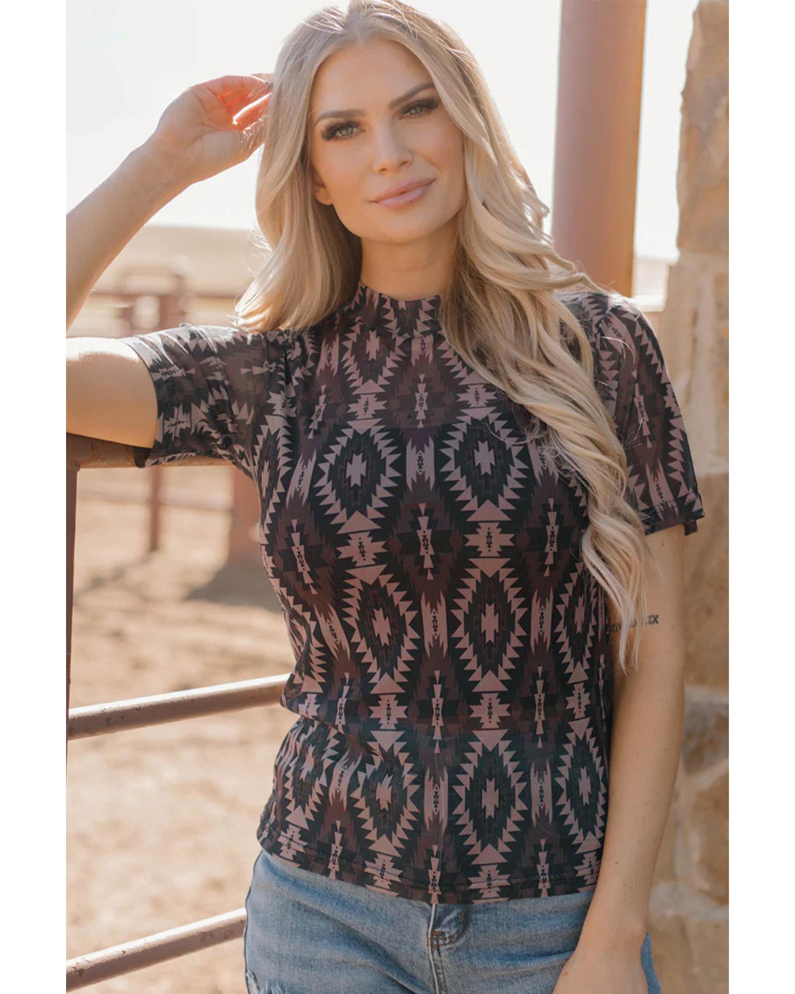 Brown Aztec Print Mock Neck Short Sleeve Mesh T Shirt – M