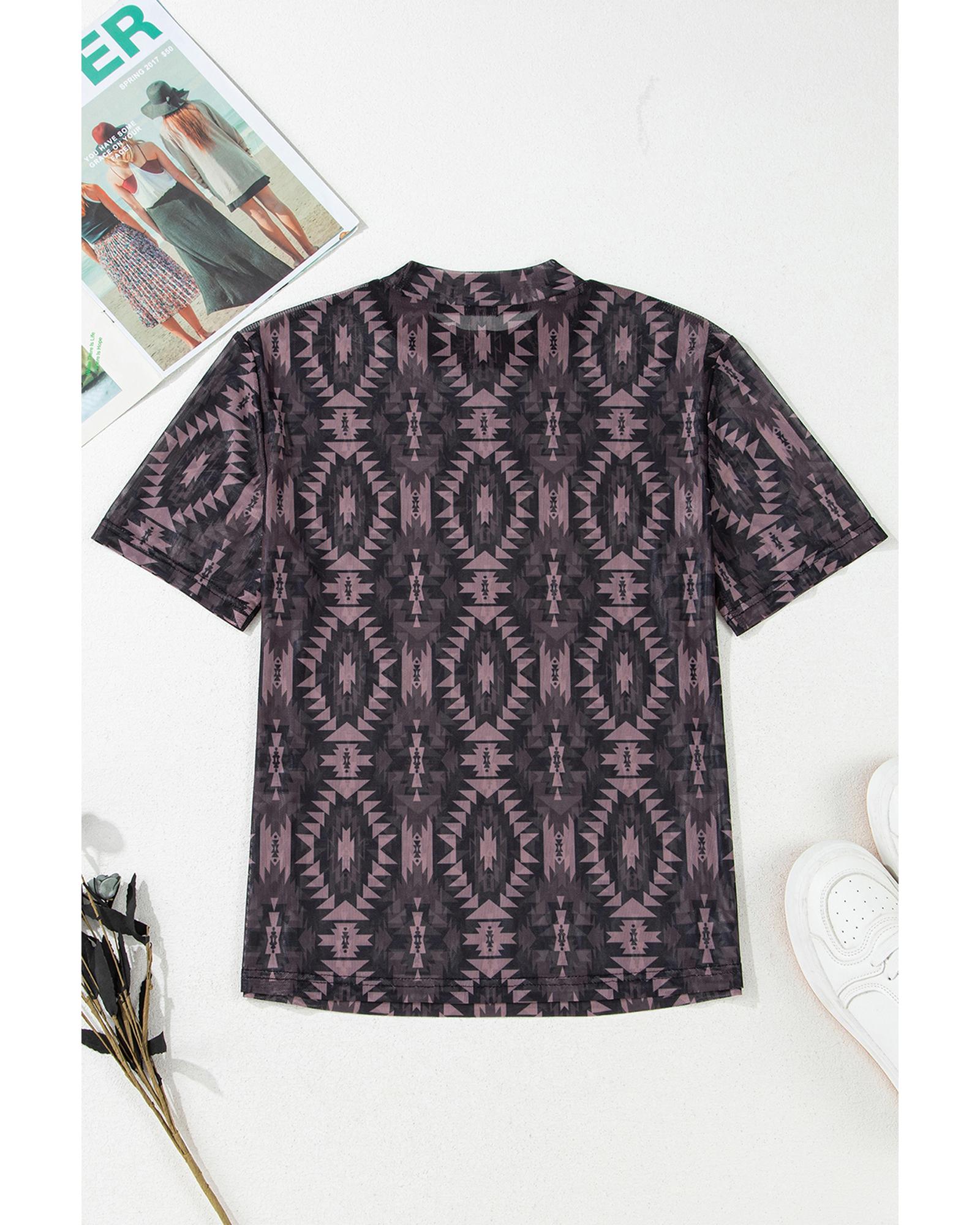 This short sleeve mesh T-shirt features a stylish Aztec print and a comfortable mock neck design, making it a versatile addition to any wardrobe. Crafted from breathable fabric, it offers a lightweight and comfortable fit suitable for various occasions.