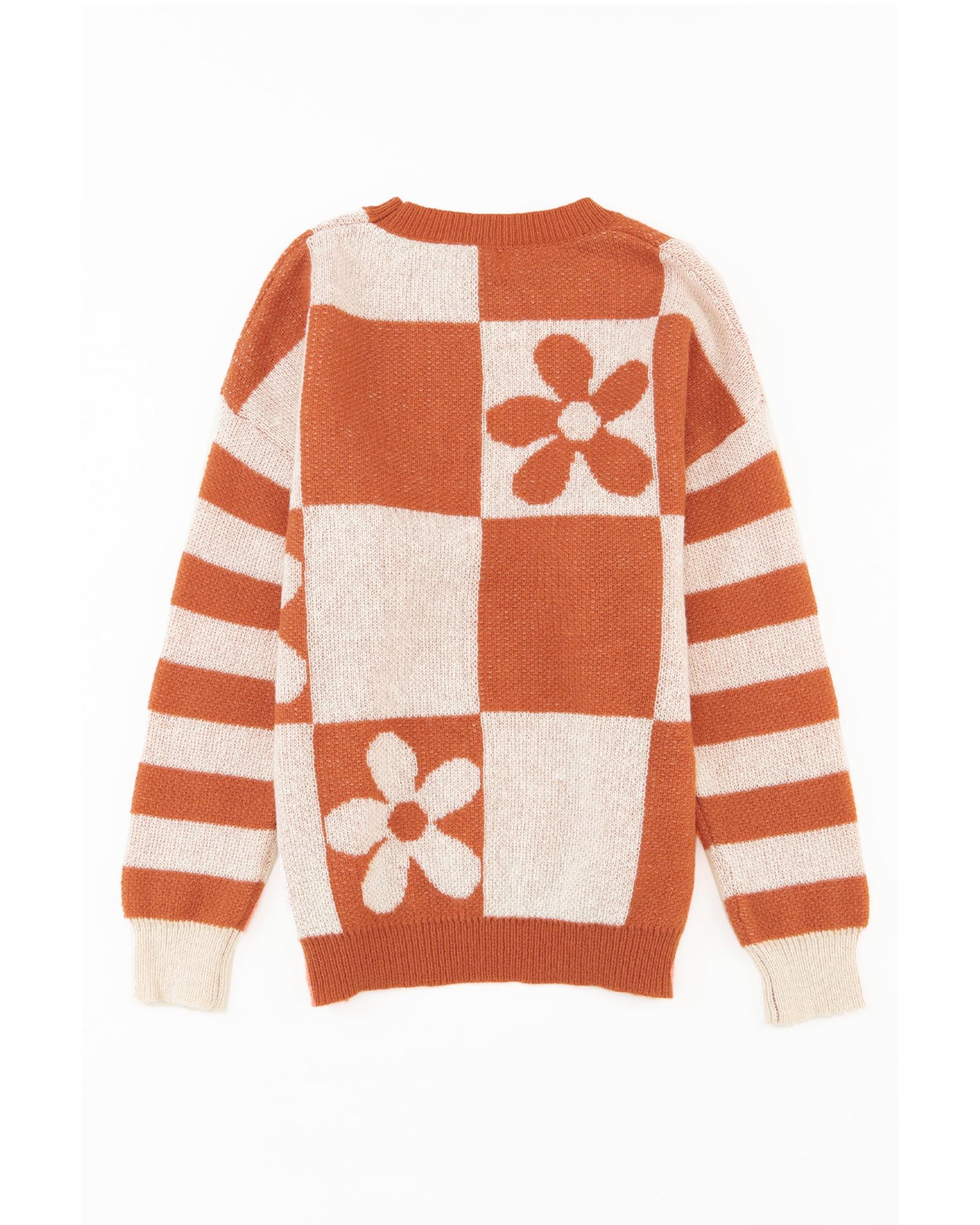 This sweater features a stylish checkered floral print combined with striped sleeves, offering a trendy and comfortable fit. Designed with a relaxed silhouette, it provides a versatile look suitable for various occasions. The fine knit material ensures softness and durability, making it a great addition to your wardrobe.