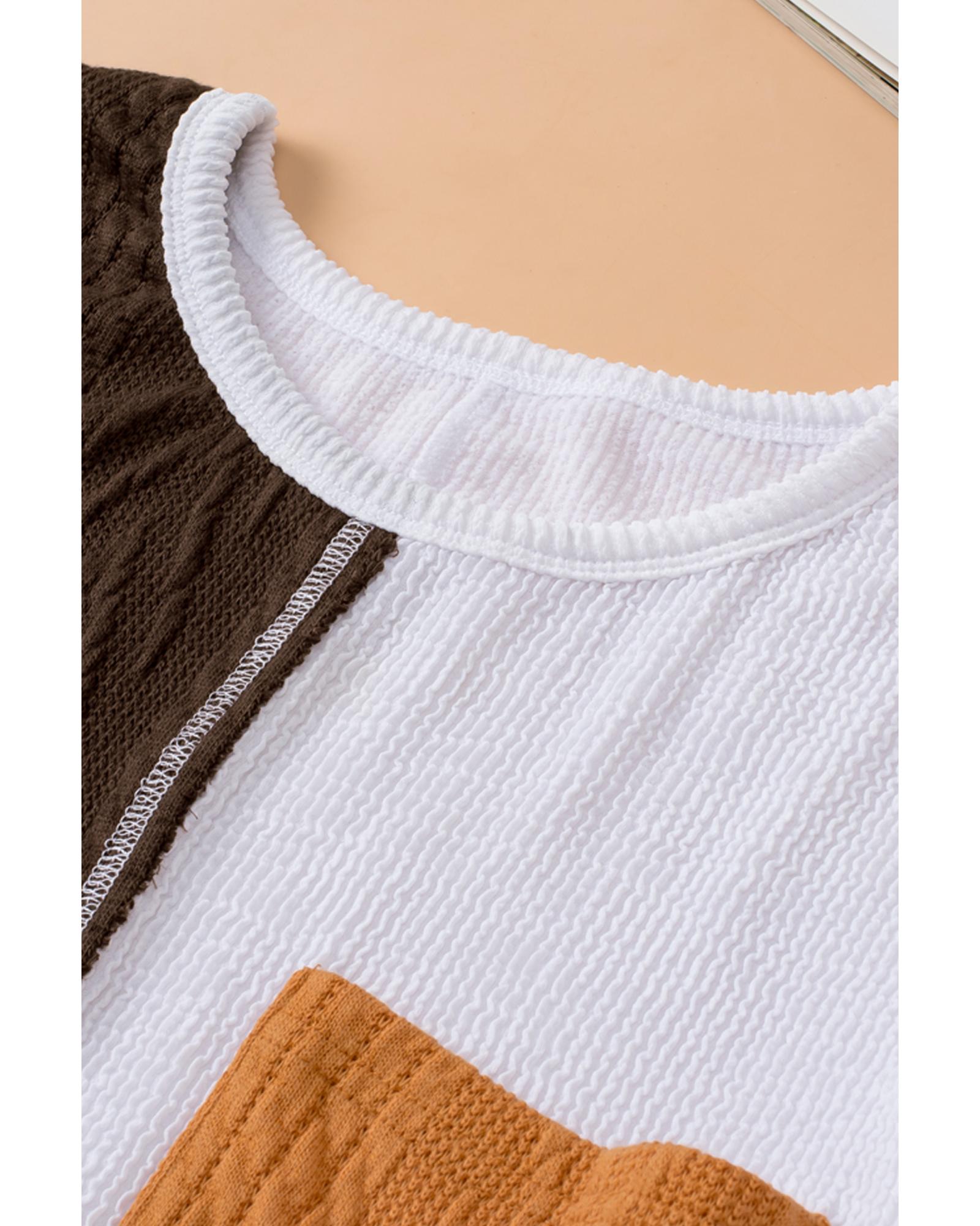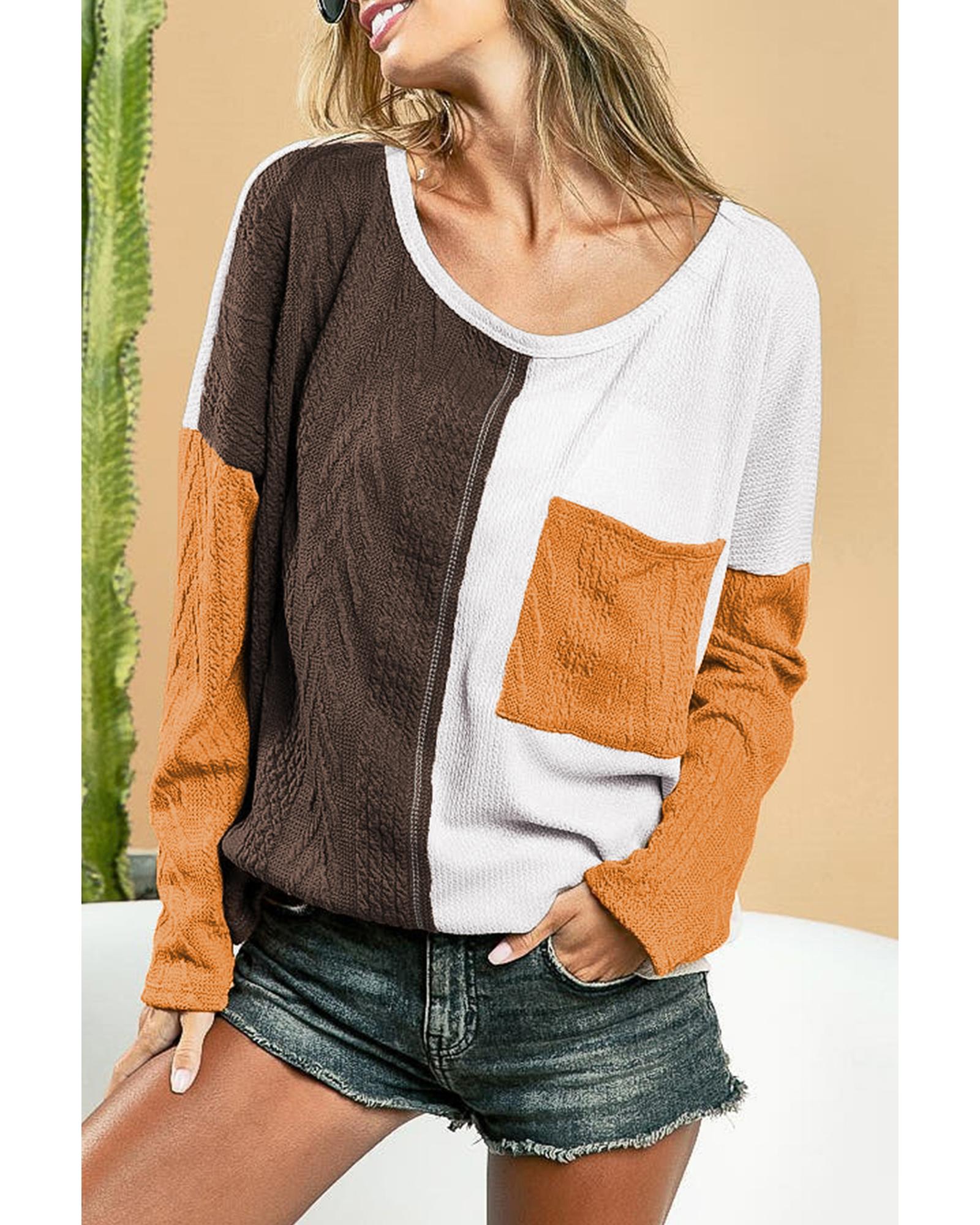 Brown Color Block Patchwork Chest Pocket Long Sleeve Top – M