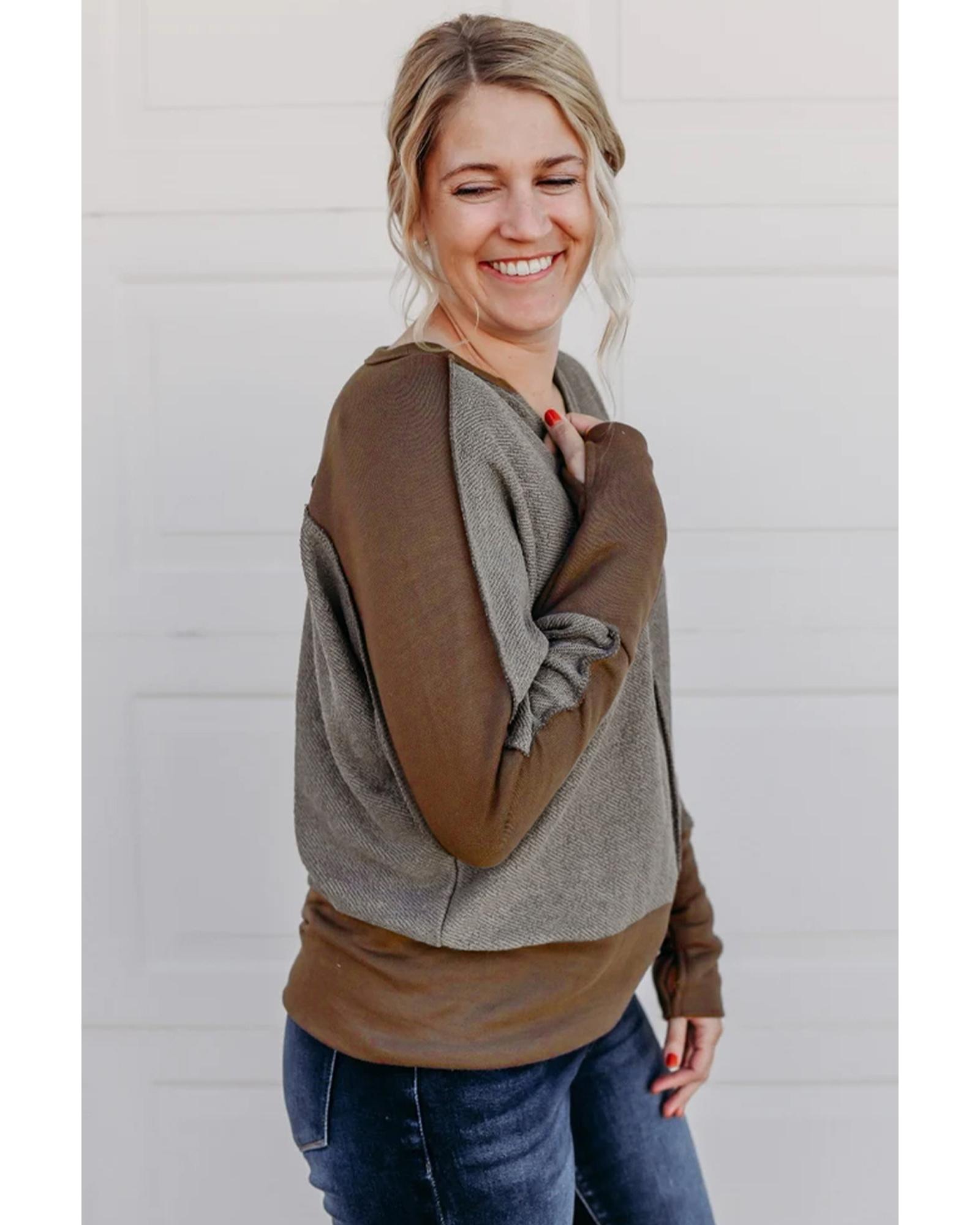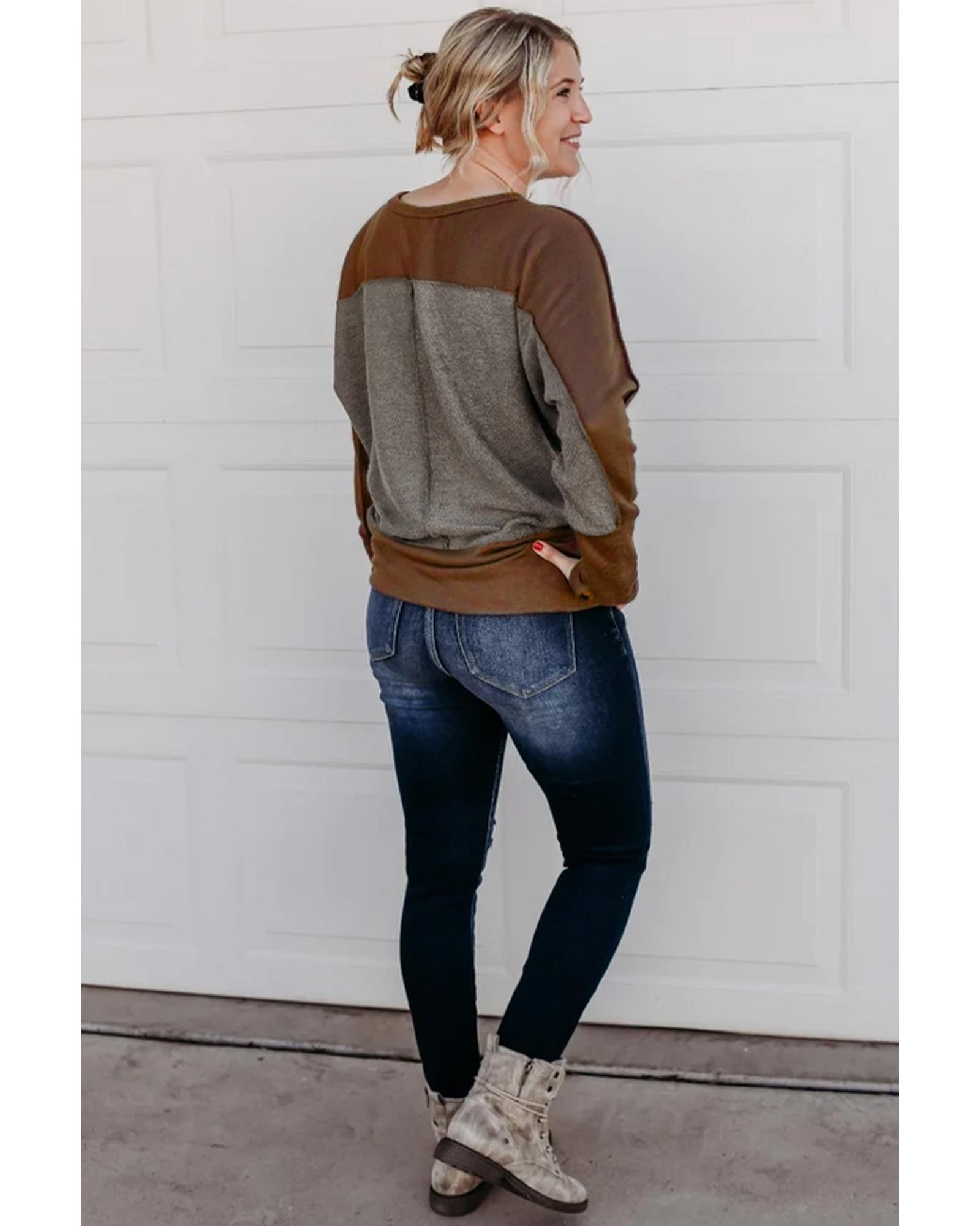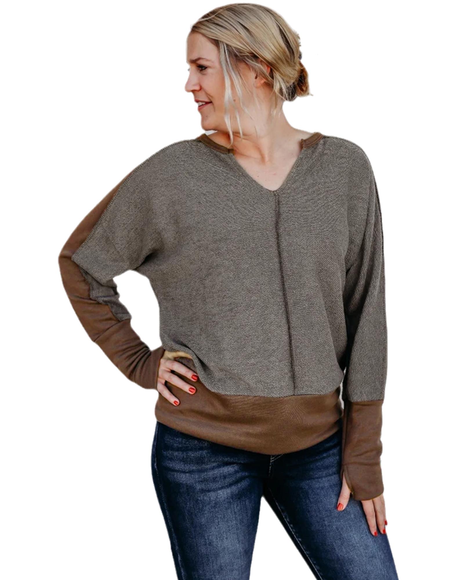 Brown Contrast Patchwork Thumbhole Sleeve Top – S