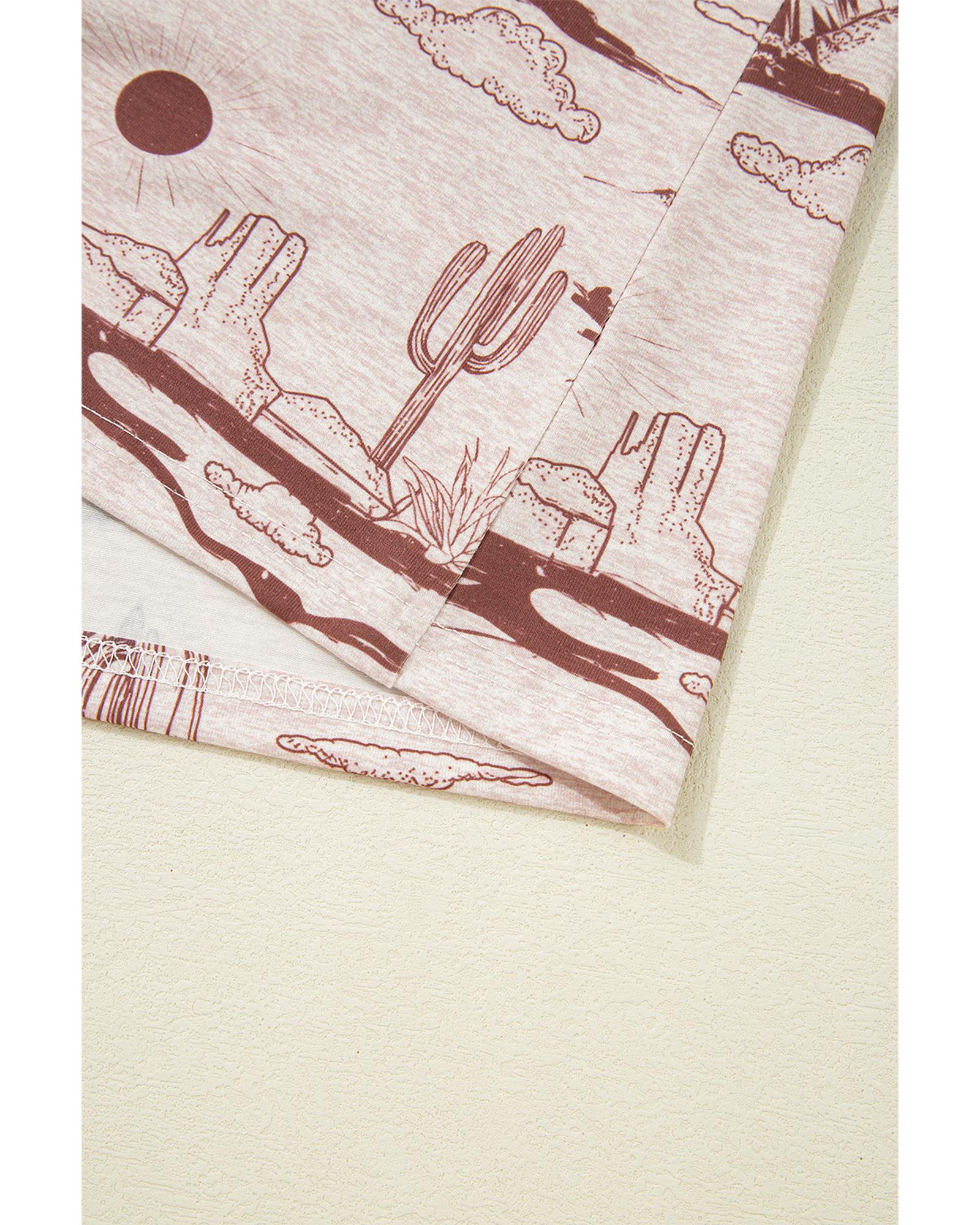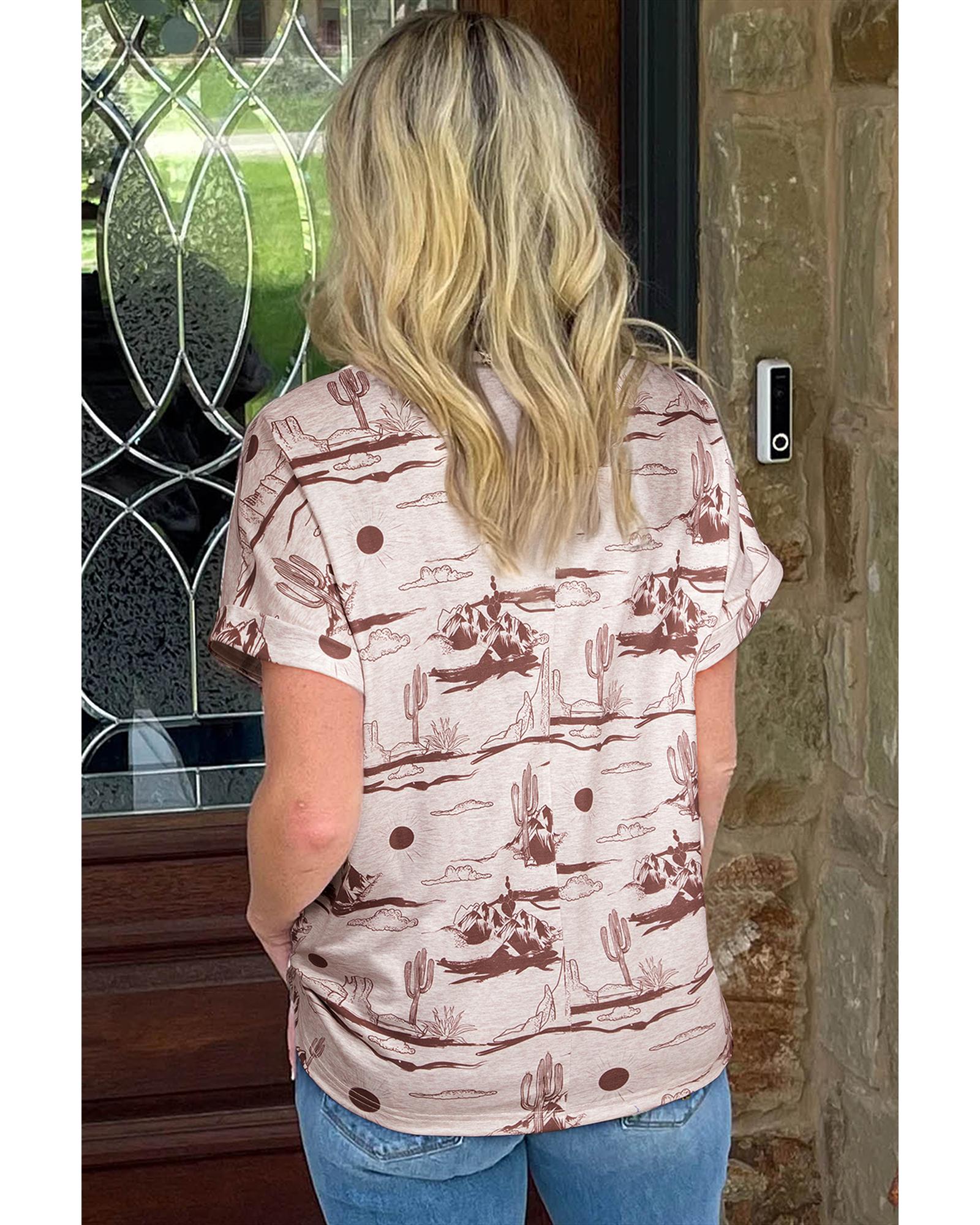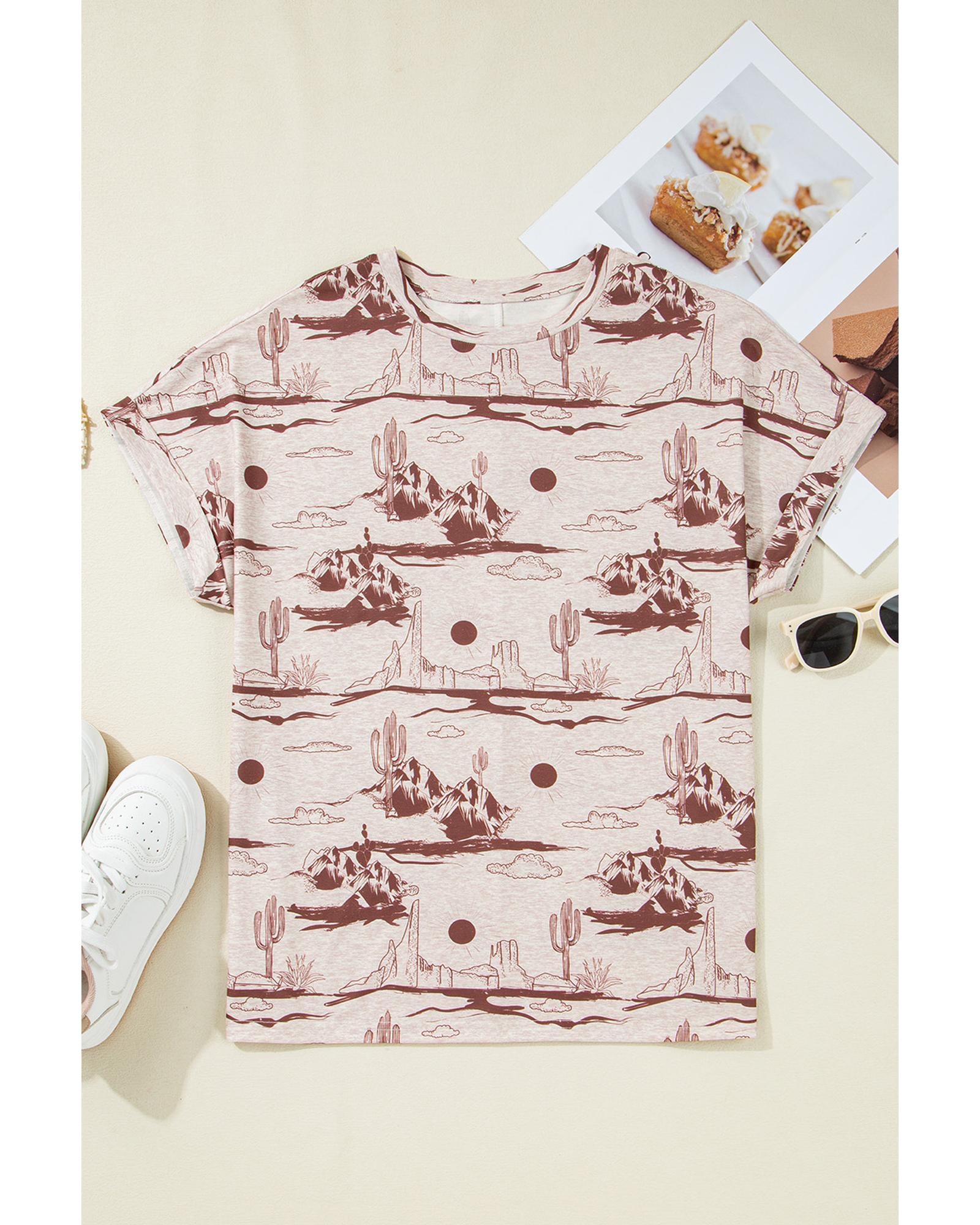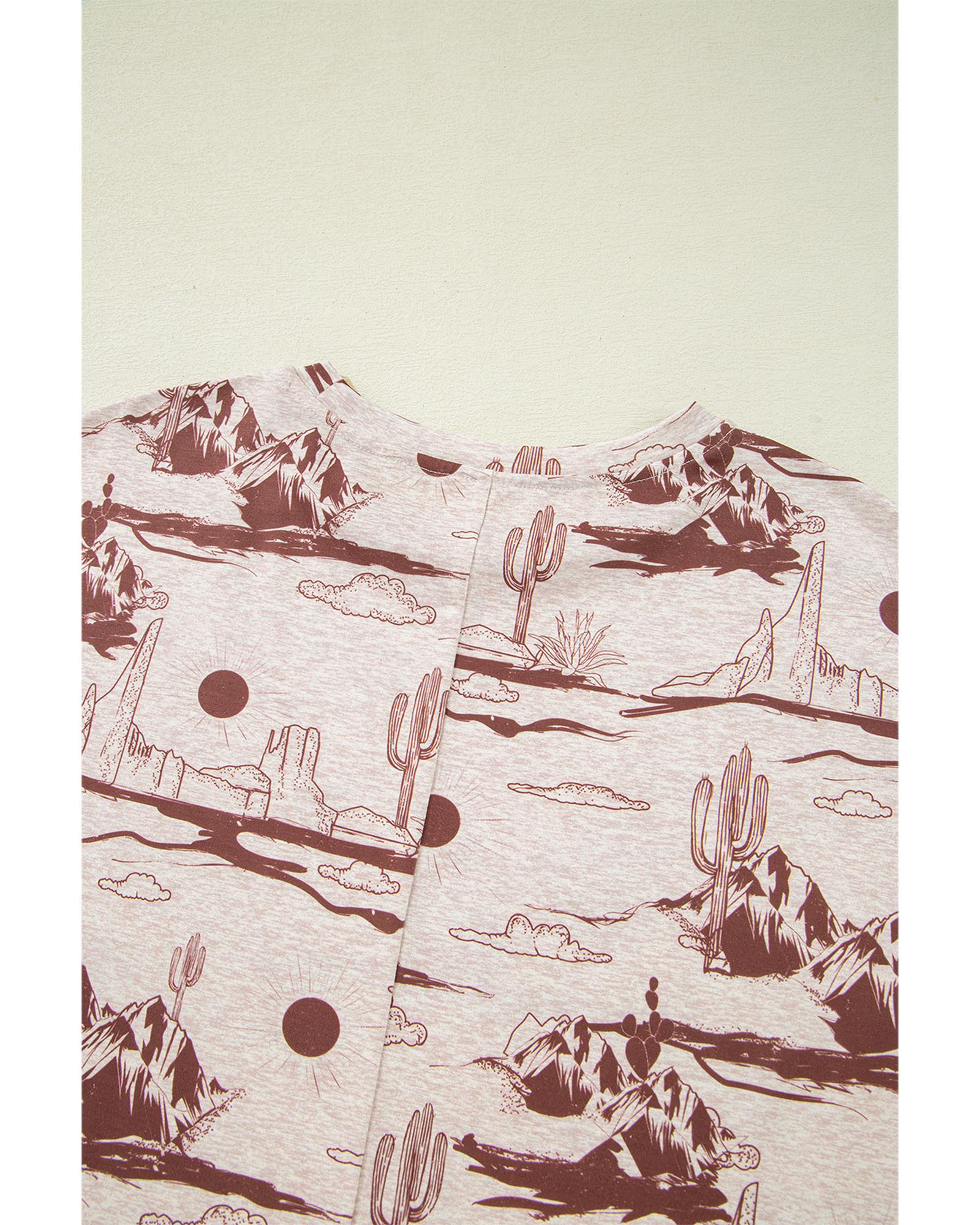 This short sleeve knit top features a desert sand print design, combining comfort and style for everyday wear. Its versatile style makes it suitable for layering or wearing alone, with a neutral hue inspired by sun-soaked desert landscapes. The high elasticity ensures a comfortable fit for various body types.