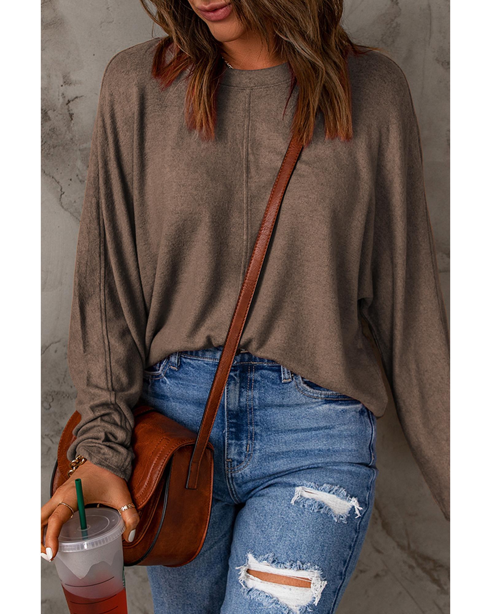 Brown Fiery Solid Color Patchwork Long Sleeve Top – L