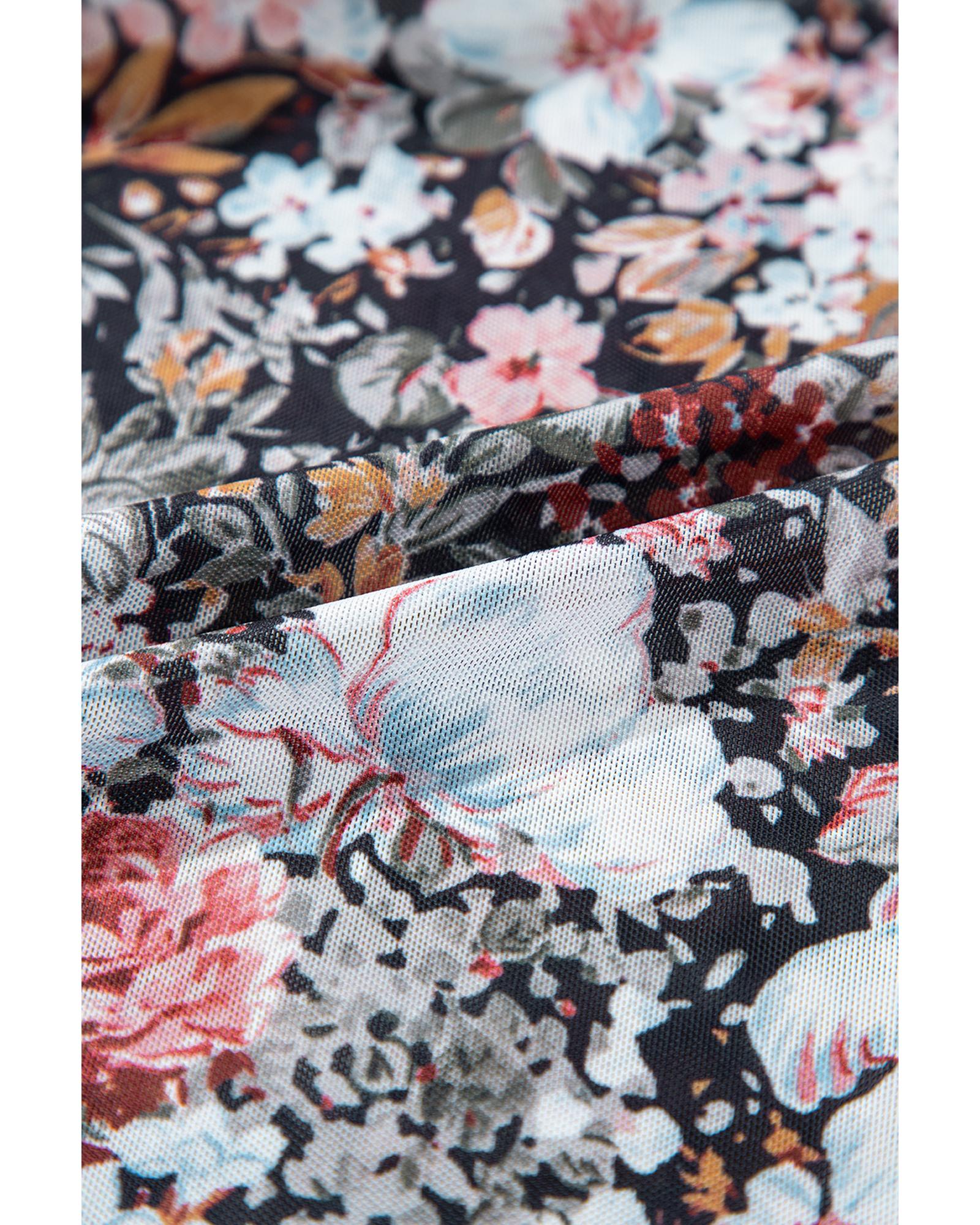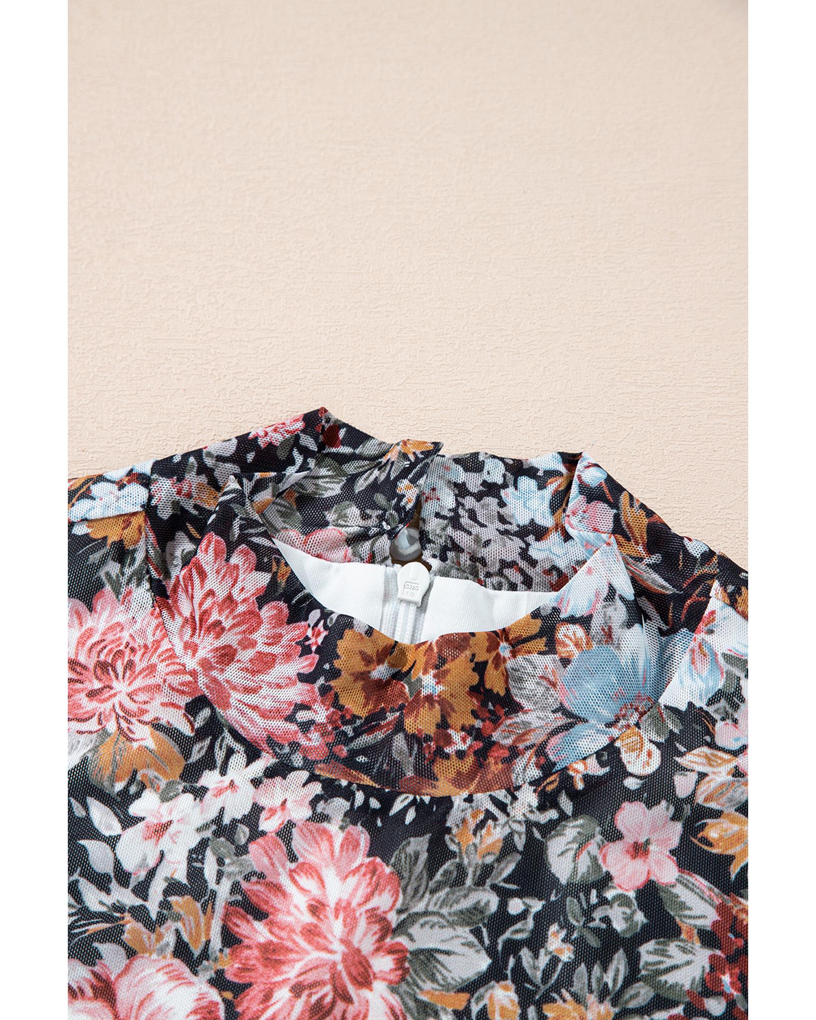 This midi dress features a floral allover print with a mock neck design, offering a stylish and fitted silhouette. Its long sleeves and lettuce trim detailing add to its elegant appearance, making it suitable for various occasions.