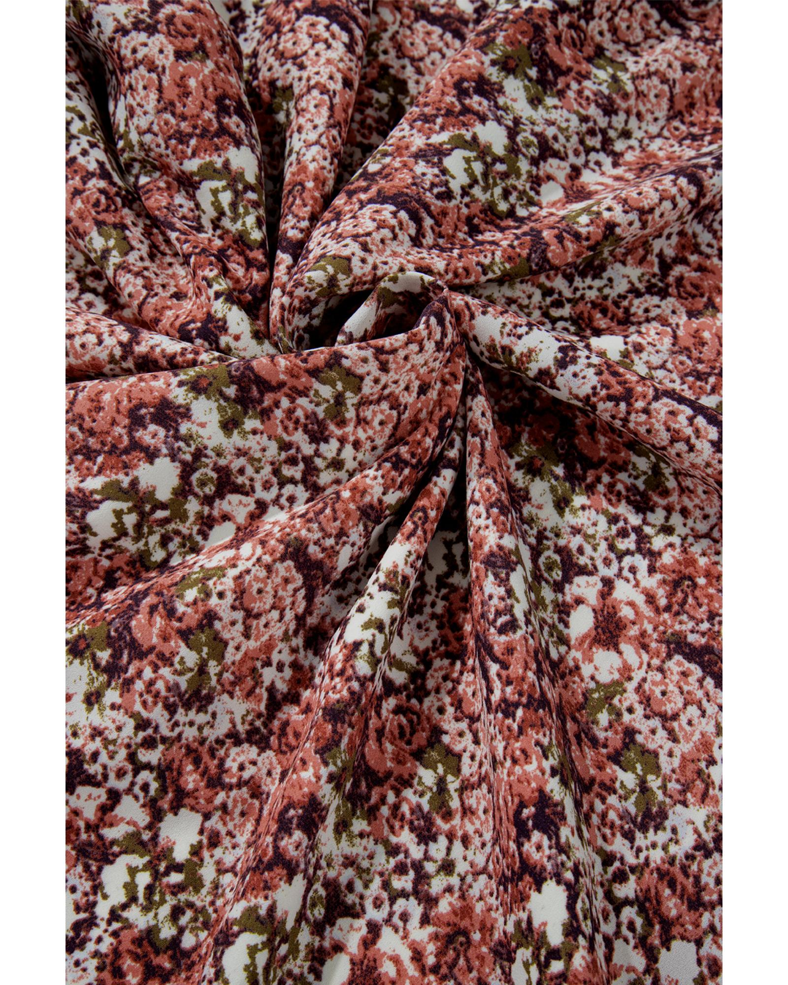 This floral print midi dress features a split front design with tiered frills and a V neckline, creating a feminine and stylish silhouette. The dress is accented with charming puff sleeves and vibrant floral patterns, making it perfect for a fresh and romantic look.