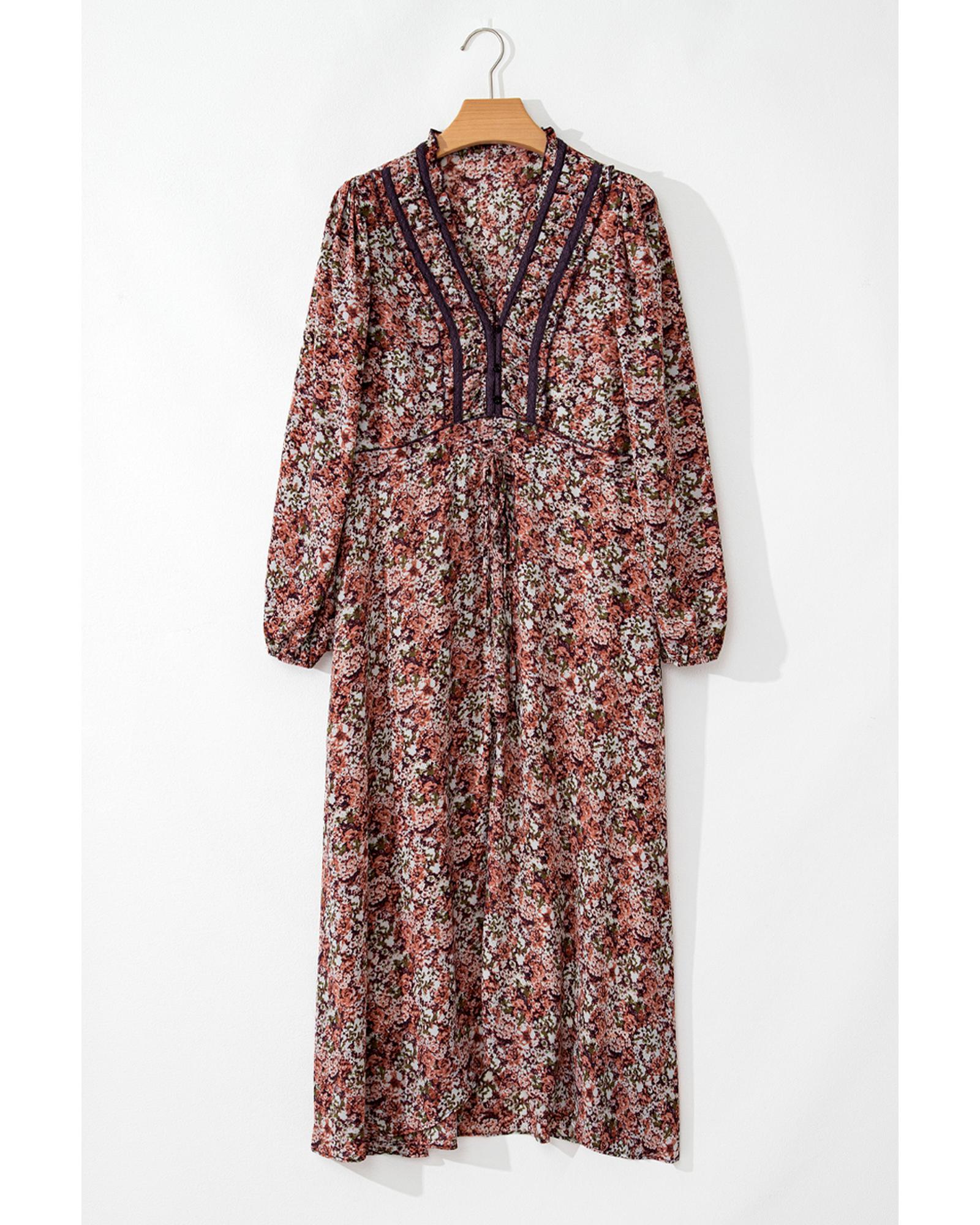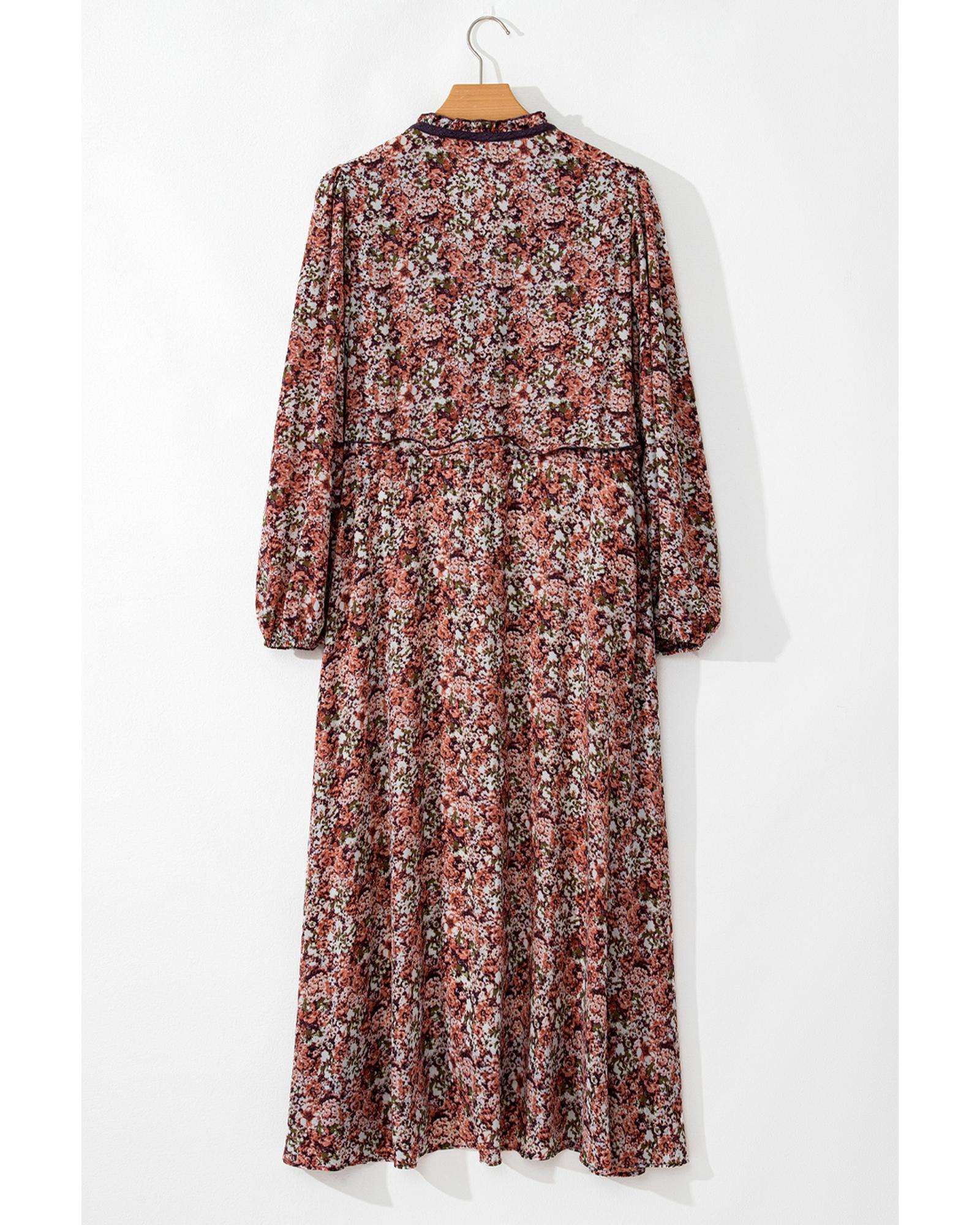 This floral print midi dress features a split front design with tiered frills and a V neckline, creating a feminine and stylish silhouette. The dress is accented with charming puff sleeves and vibrant floral patterns, making it perfect for a fresh and romantic look.