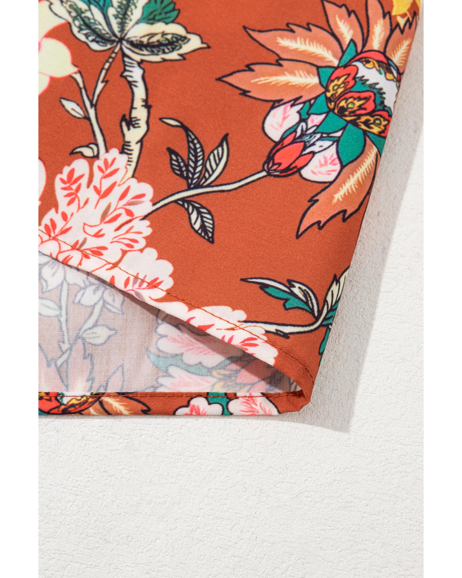 Brown Floral Stitched V Neck Frilled Trim Puff Short Sleeve Blouse – 2X