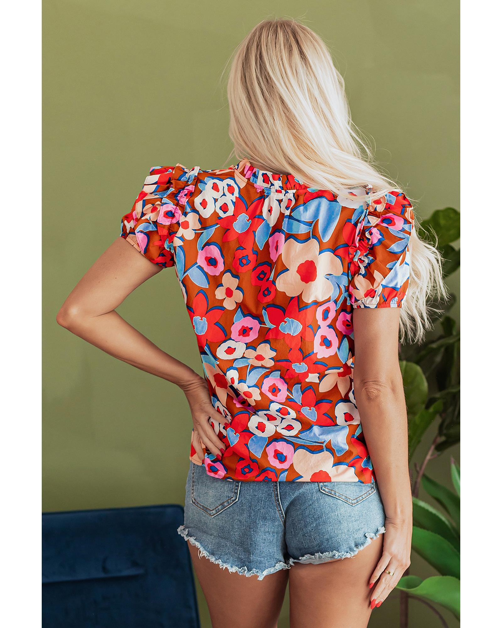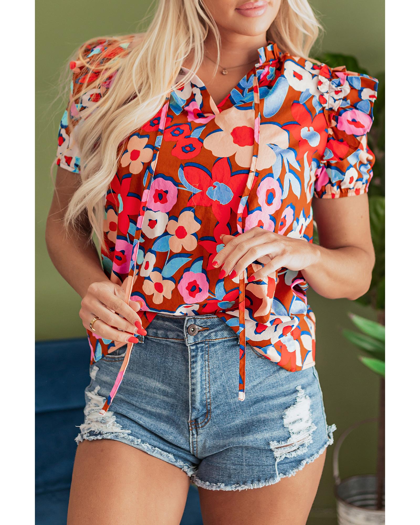 Brown Flower Print Self Tie Frilled Collar Puff Sleeve Blouse – L