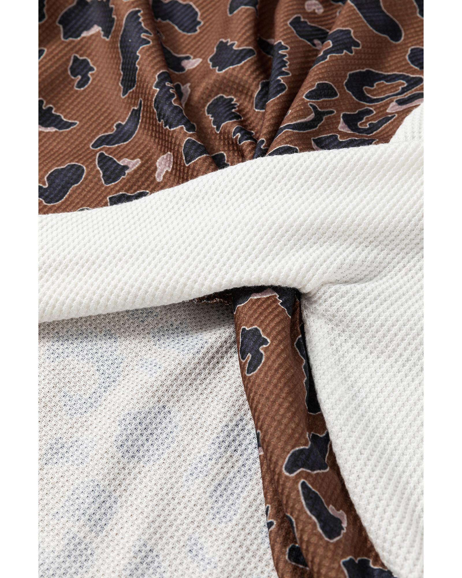 Brown Leopard Contrast Waffle Knit Twist Hem V Neck Top – L