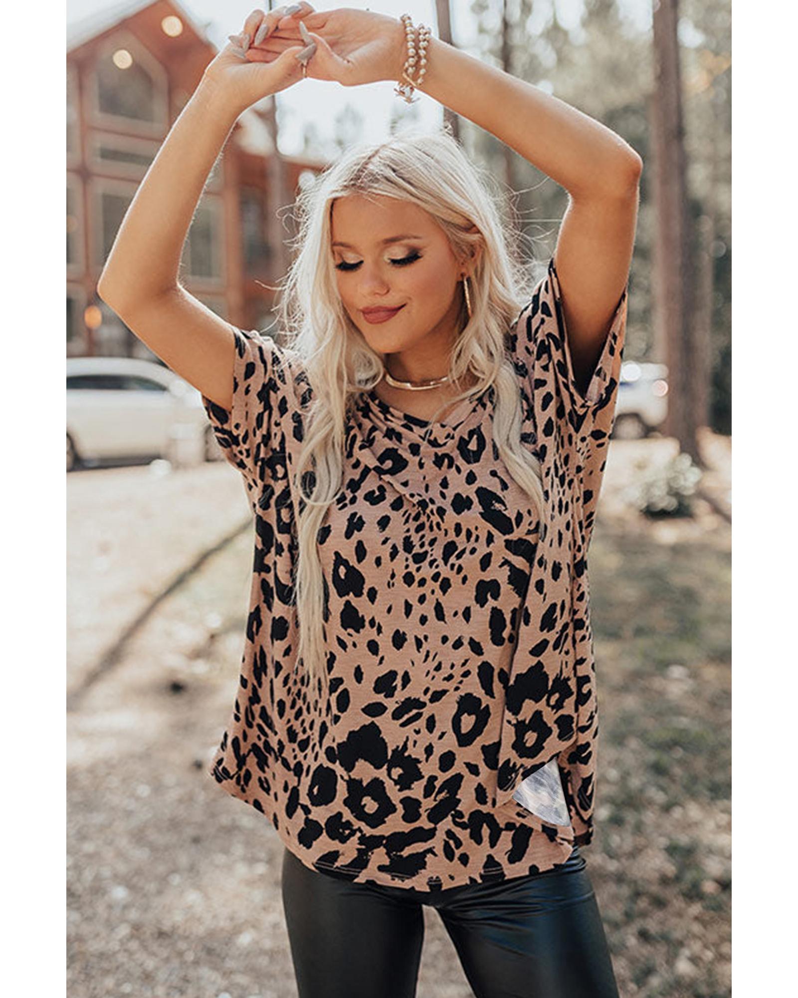 Brown Leopard Print V Neck Half Sleeve Oversized Tee – M