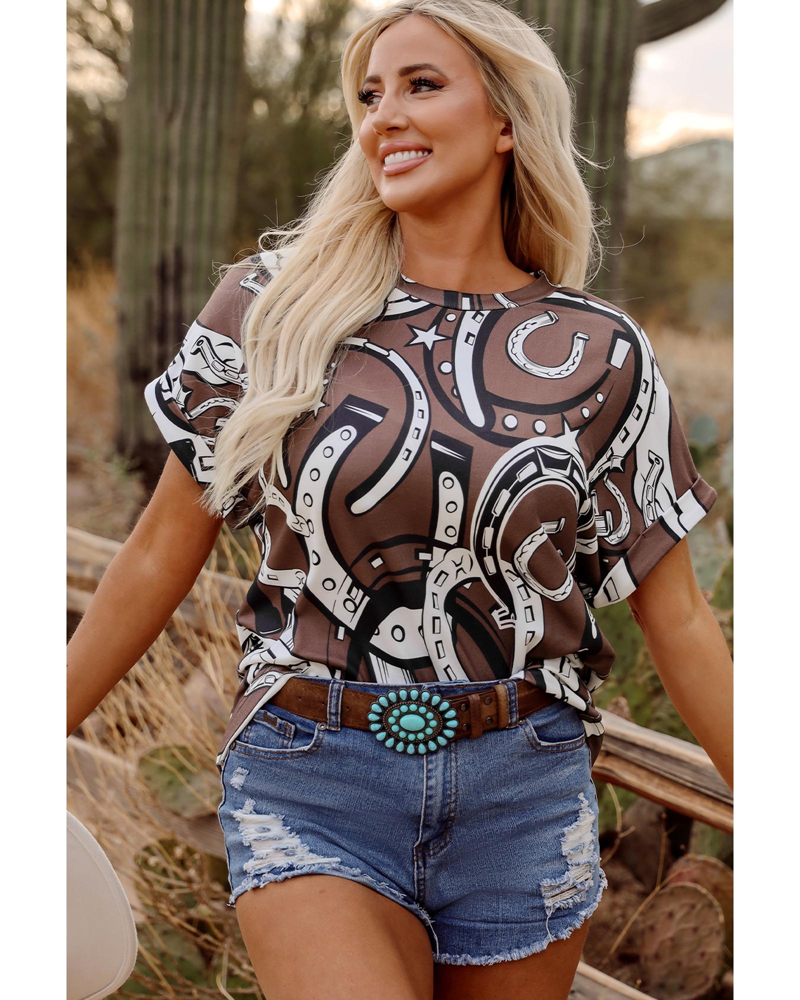 Brown Lucky Horseshoes Graphic Dolman T-shirt – L