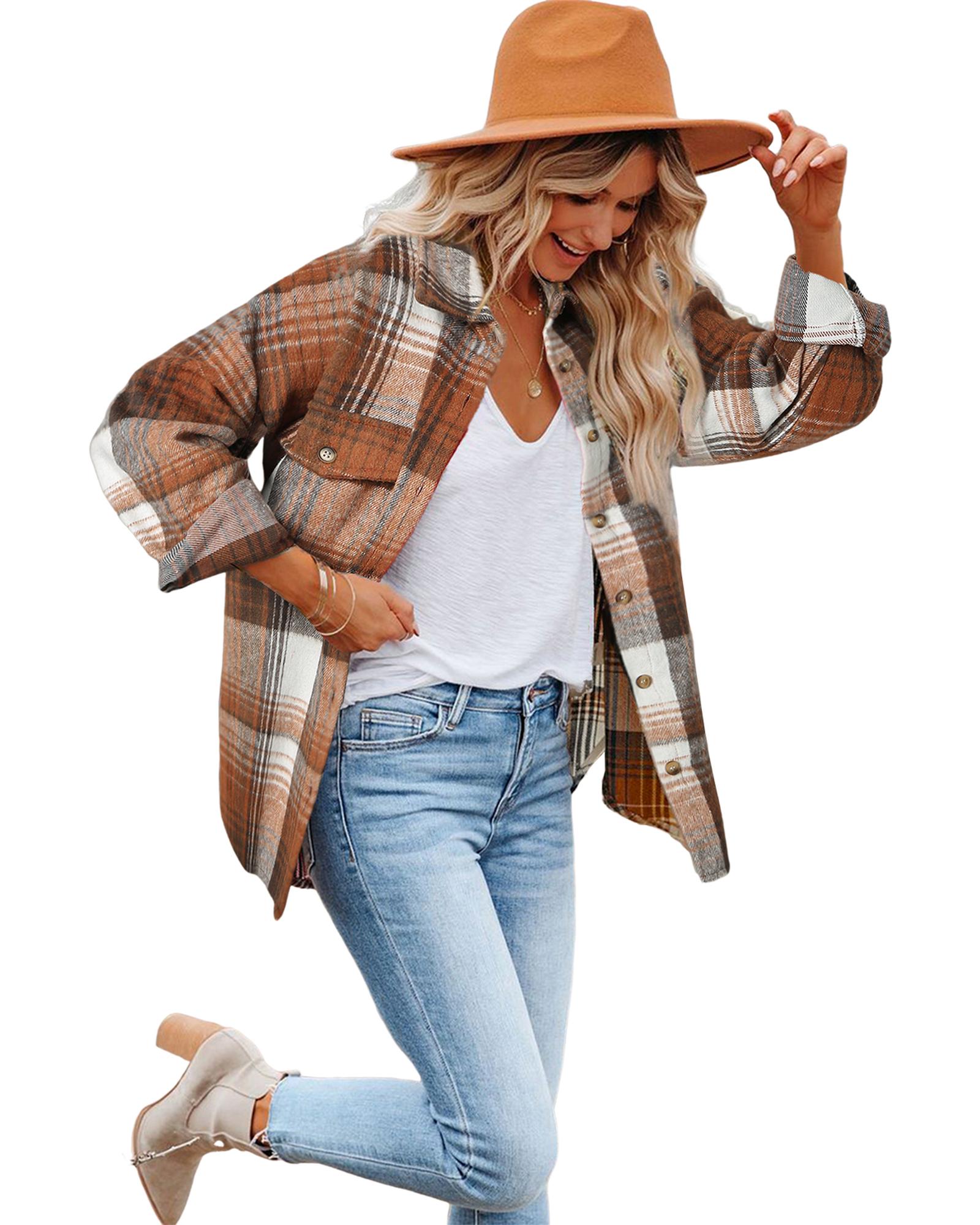 This plaid shacket combines a classic design with a trendy fitted look, making it a versatile addition to your wardrobe. It features a stylish allover plaid pattern, front chest pockets, and tortoise buttons, offering both functionality and fashion. Crafted from high-quality fabric, it provides a comfortable and laid-back layer suitable for various casual outfits.