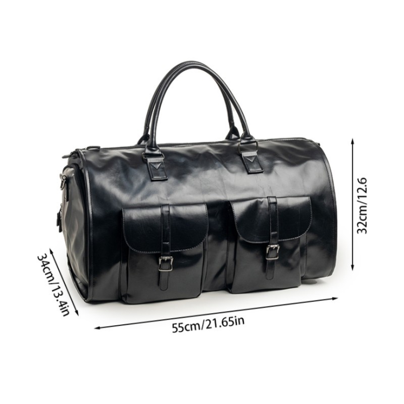 This multifunctional travel duffel bag combines style and practicality, making it suitable for various occasions such as travel, gym sessions, or overnight stays. Crafted from high-quality leather, it offers durability and a sophisticated appearance. Its spacious design and multiple compartments allow for organized storage of clothes, accessories, and essentials, while the convenient handles provide easy carrying. The sleek black exterior features front buckle pockets for additional storage and quick access.