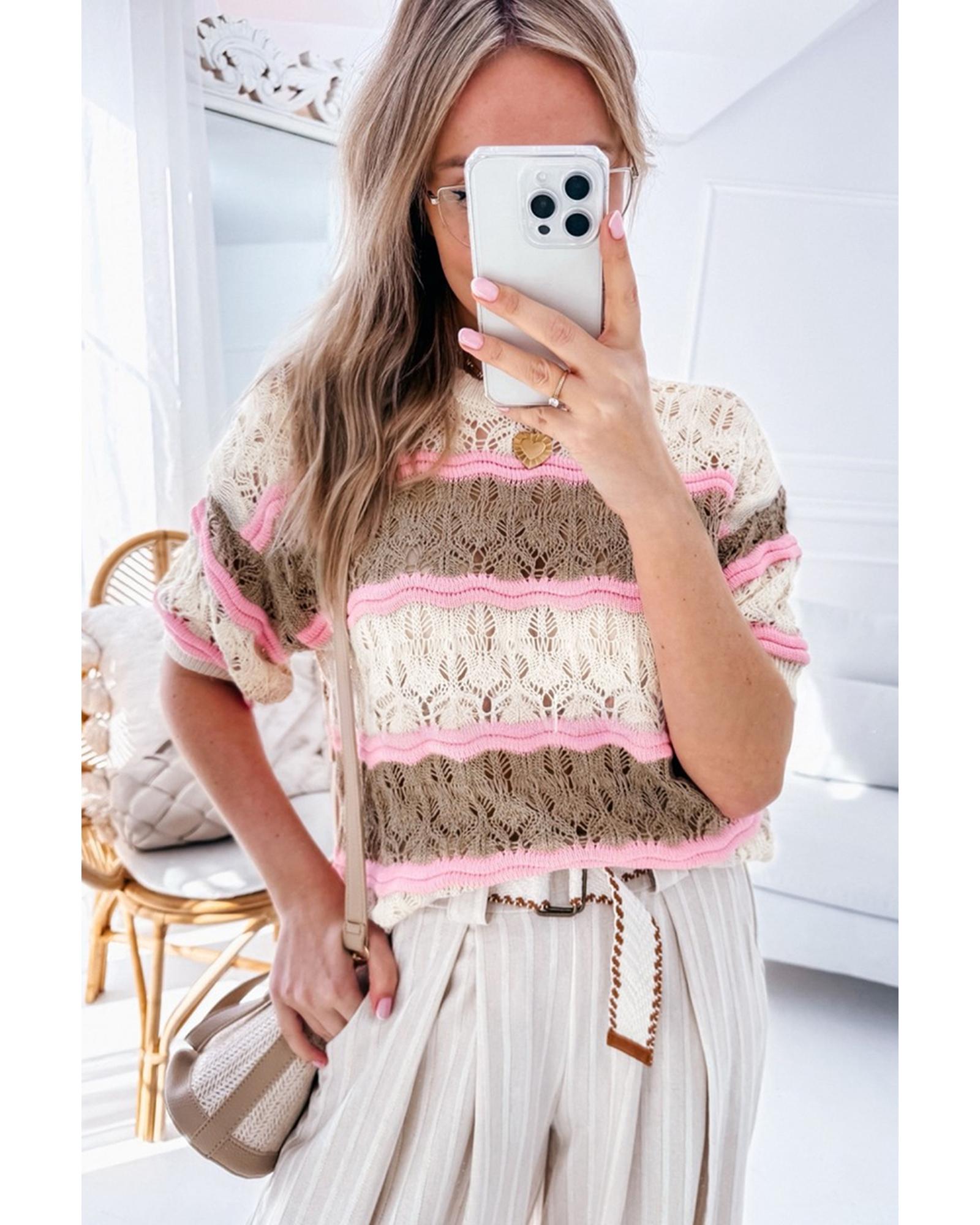 Brown Stripe Color Block Hollow Out Crochet Half Sleeve Sweater – L