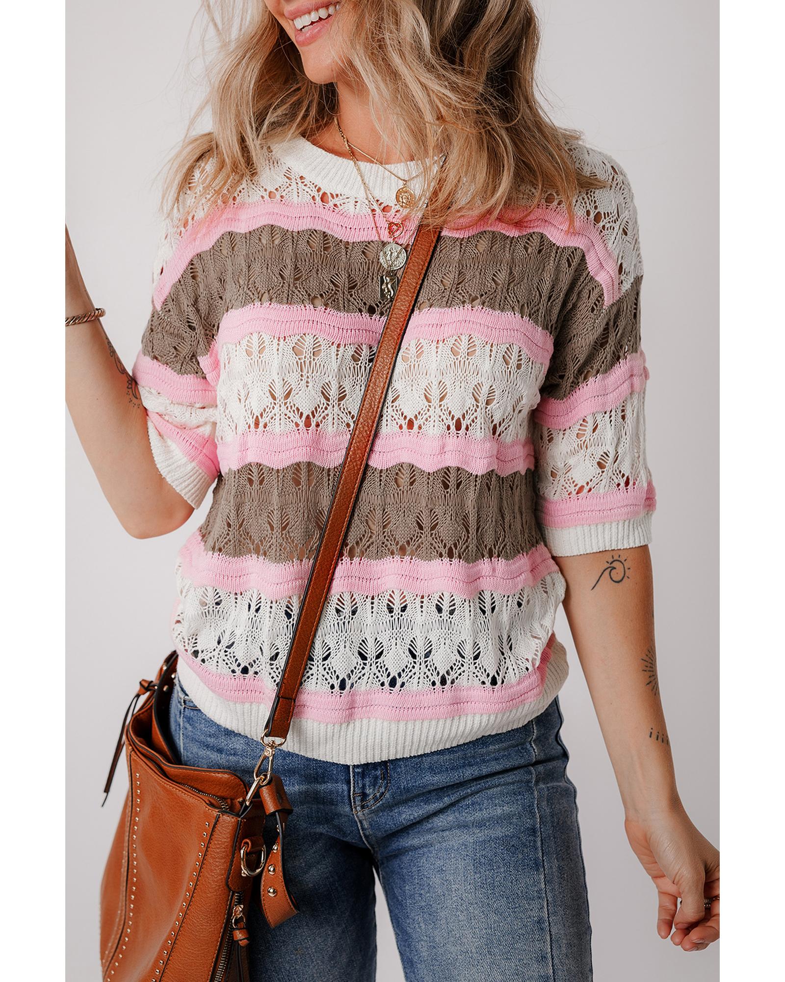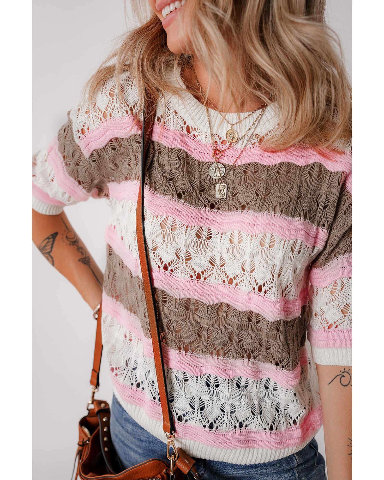 Brown Stripe Color Block Hollow Out Crochet Half Sleeve Sweater – M