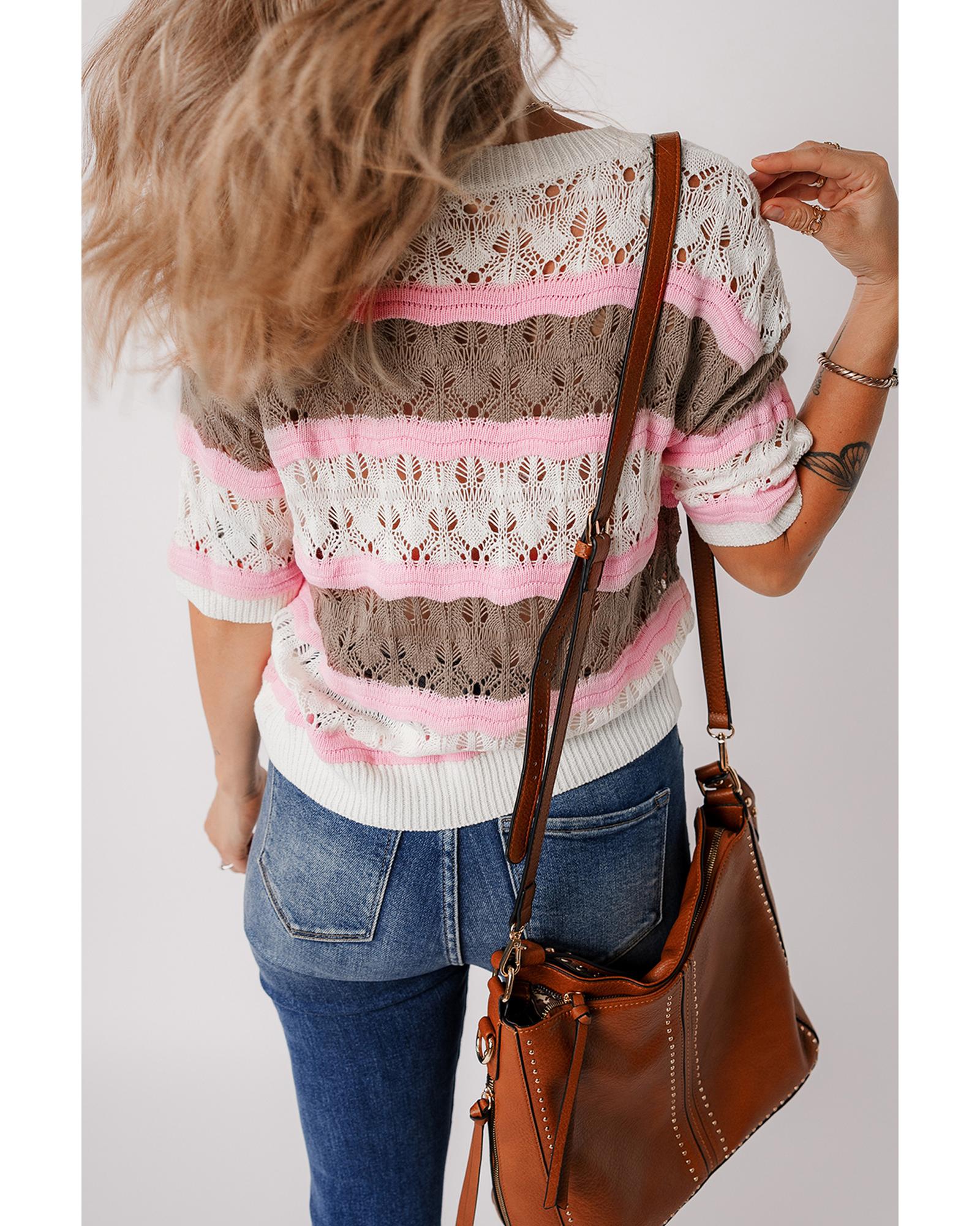 Brown Stripe Color Block Hollow Out Crochet Half Sleeve Sweater – XL