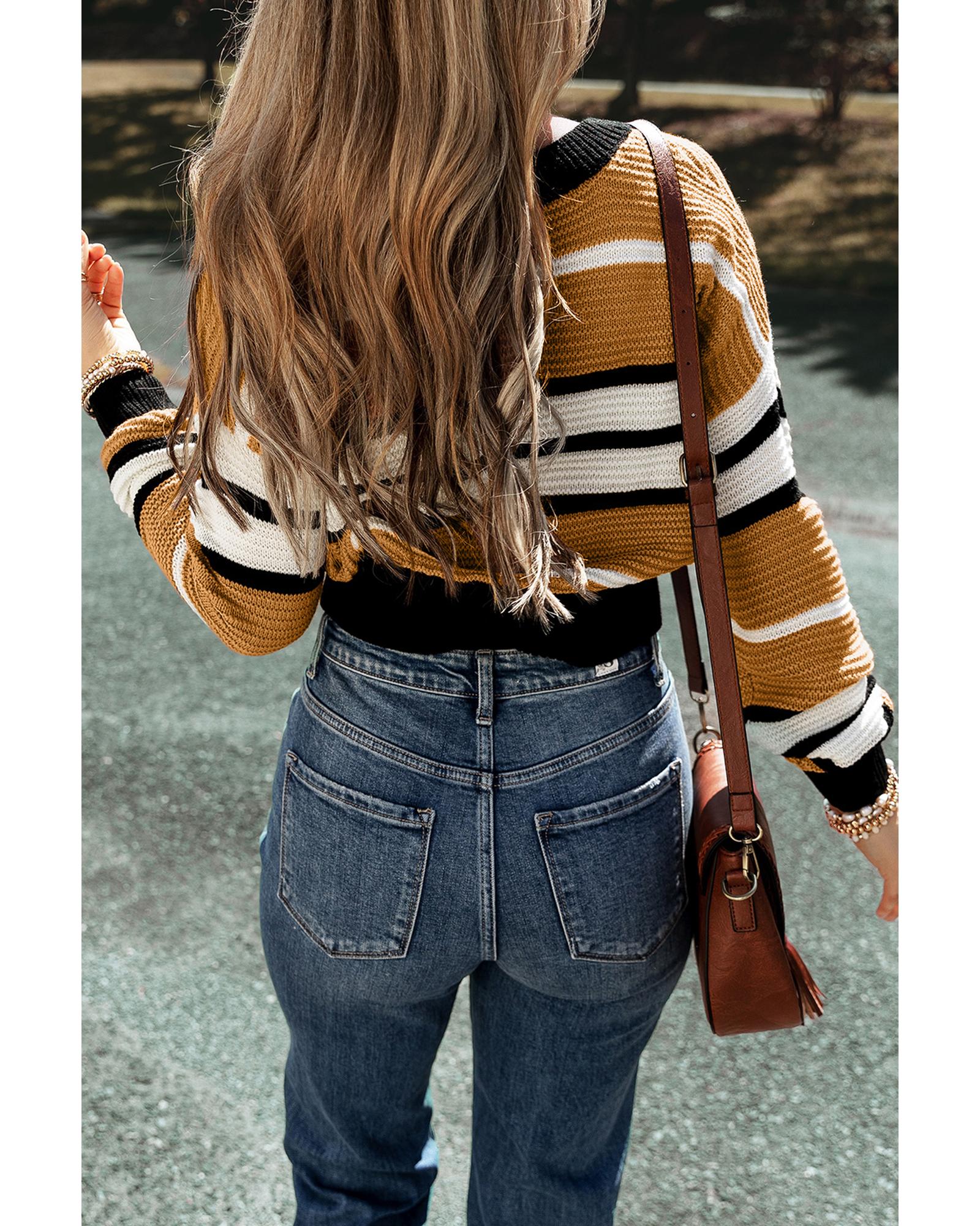 Brown Stripe Contrast Stripes V Neck Textured Knit Sweater – L
