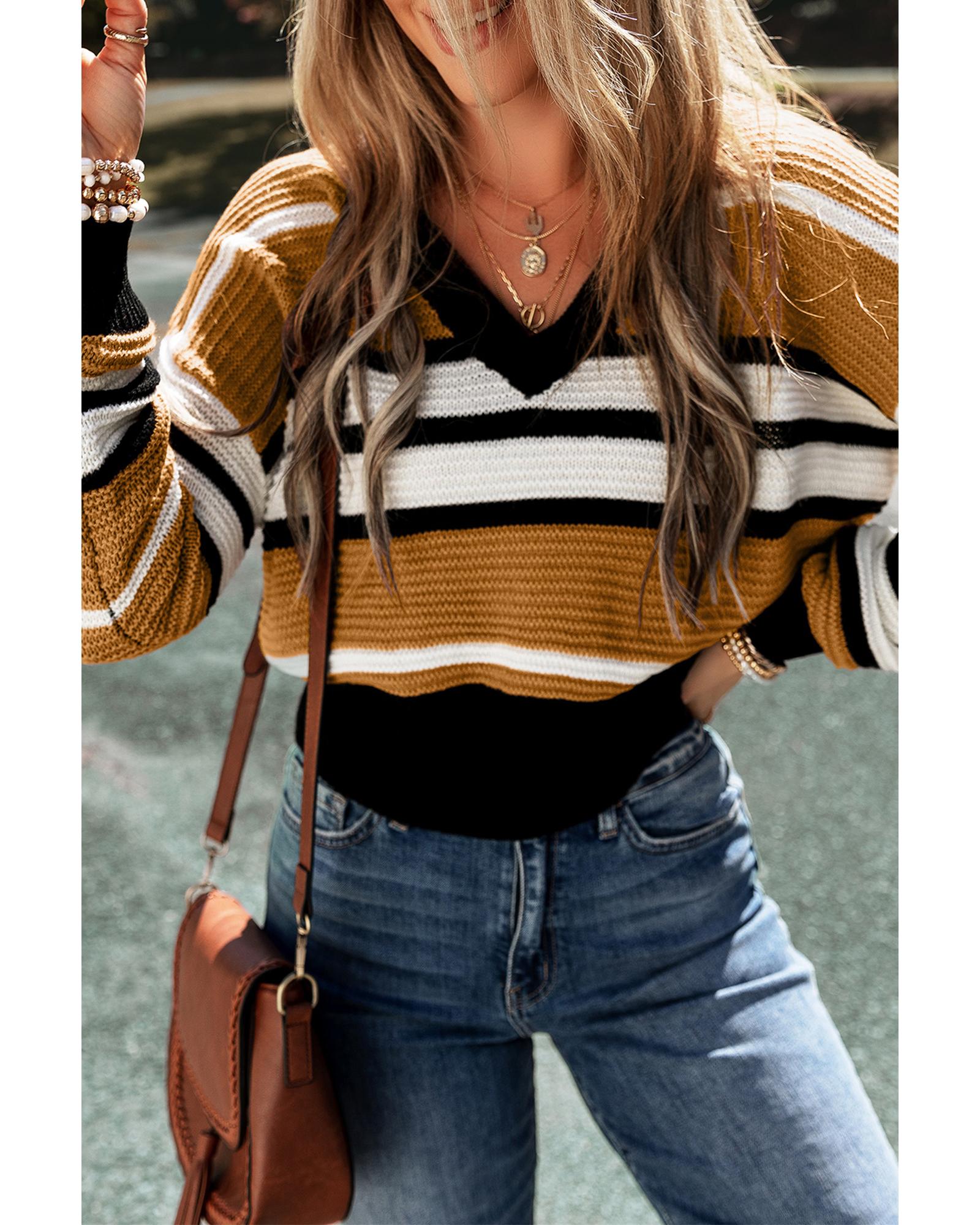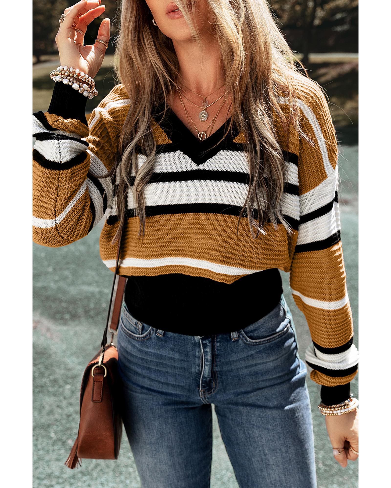 Brown Stripe Contrast Stripes V Neck Textured Knit Sweater – S