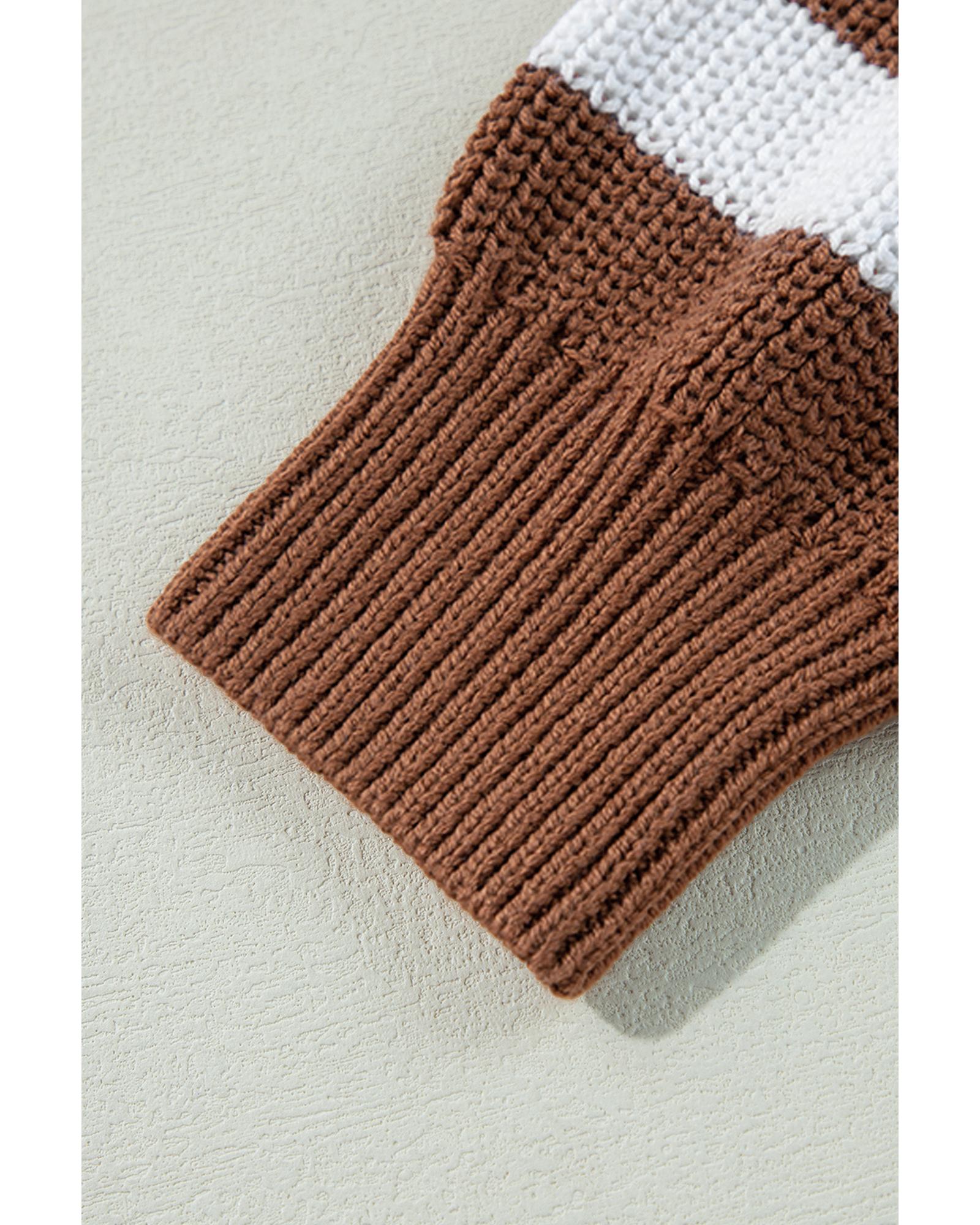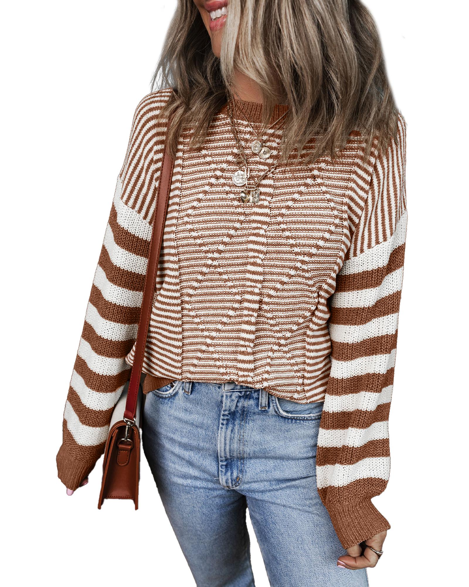 Brown Stripe Geometric Textured Drop Shoulder Sweater – S