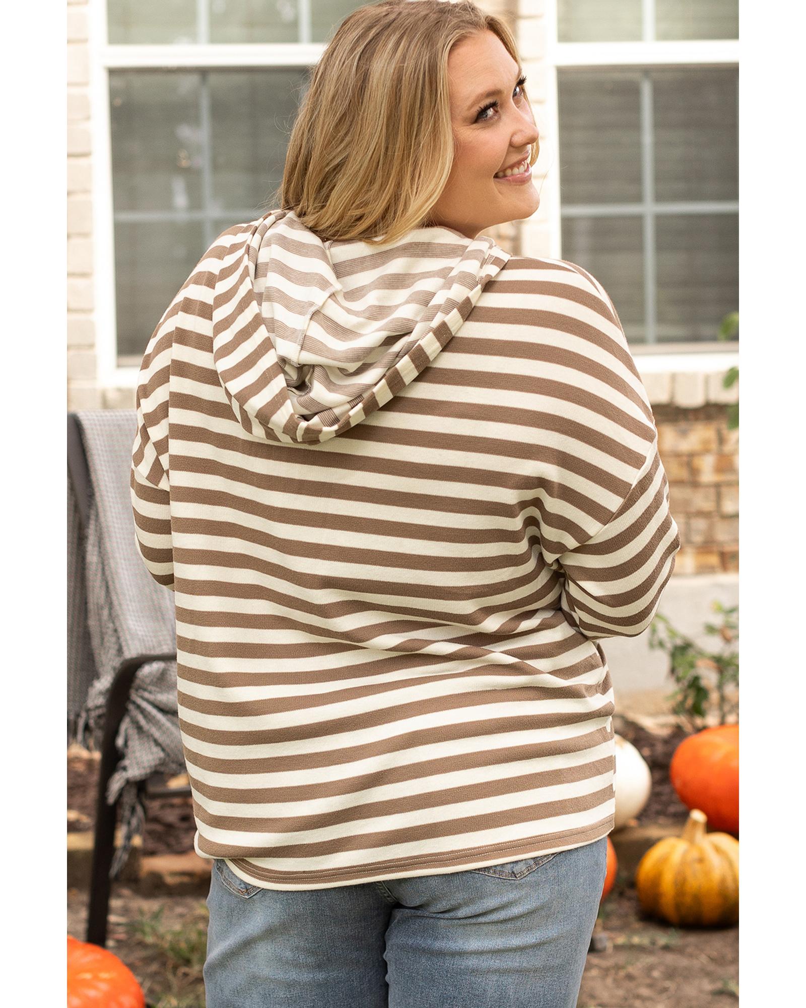 Brown Stripe Quarter Buttons Drop Sleeve Plus Size Hoodie – 3X