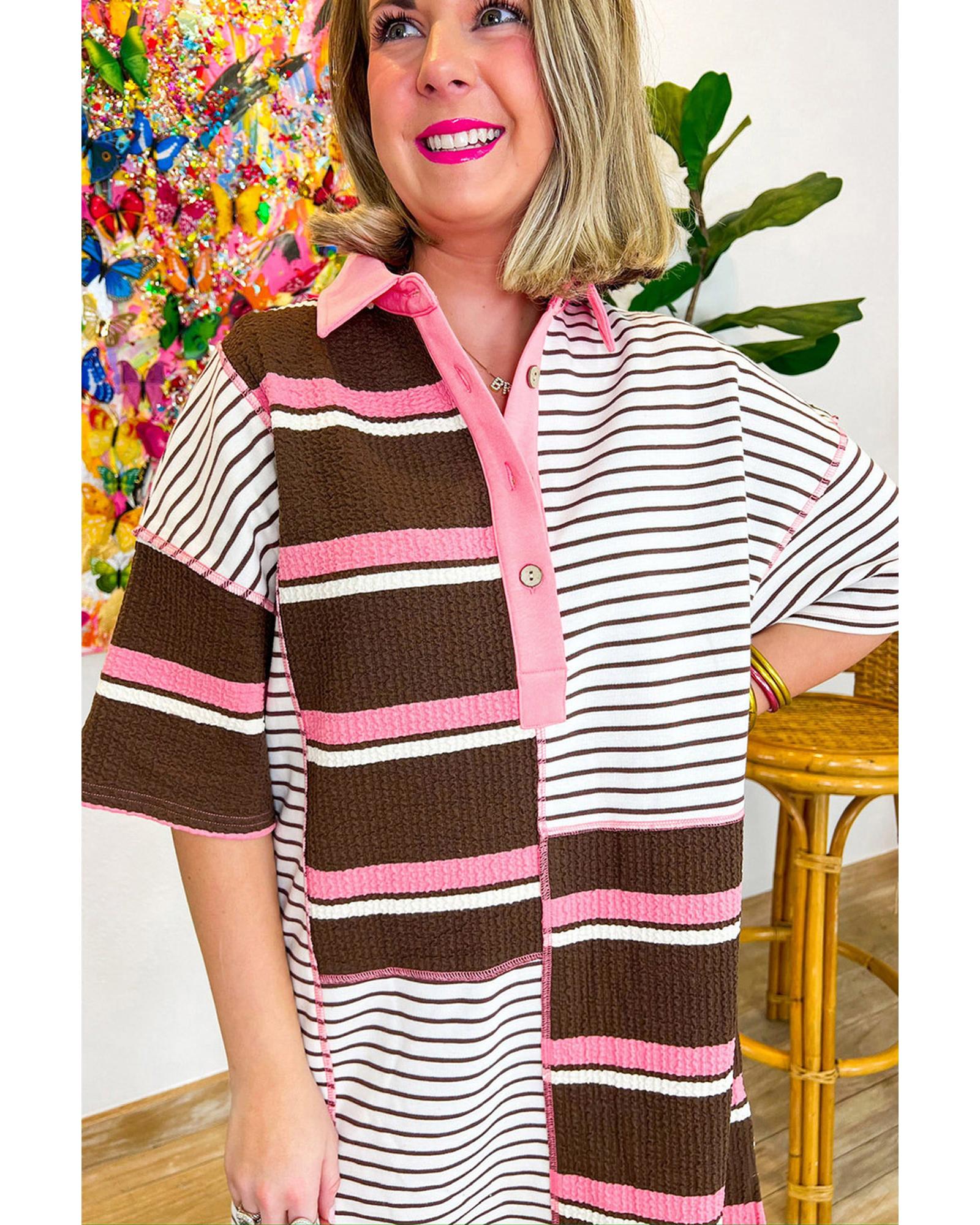 Brown Stripe Striped Textured Patchwork Buttoned T Shirt Dress – M