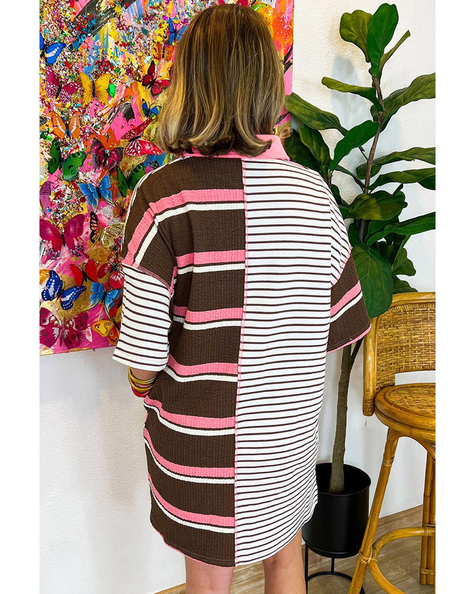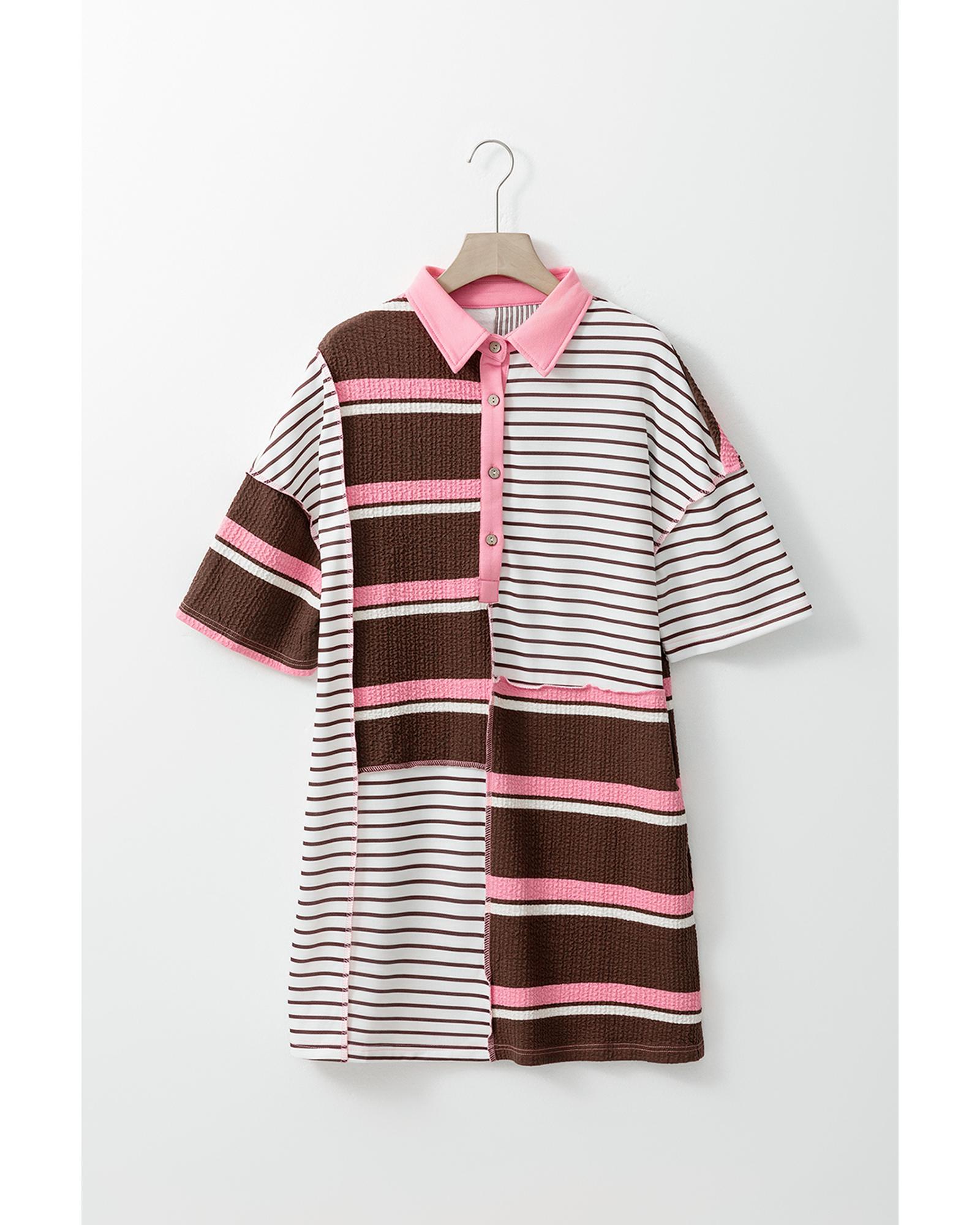 This striped textured patchwork buttoned T-shirt dress offers a trendy and versatile casual style. Designed with a fitted silhouette, it combines comfort with fashionable details, making it suitable for various occasions.