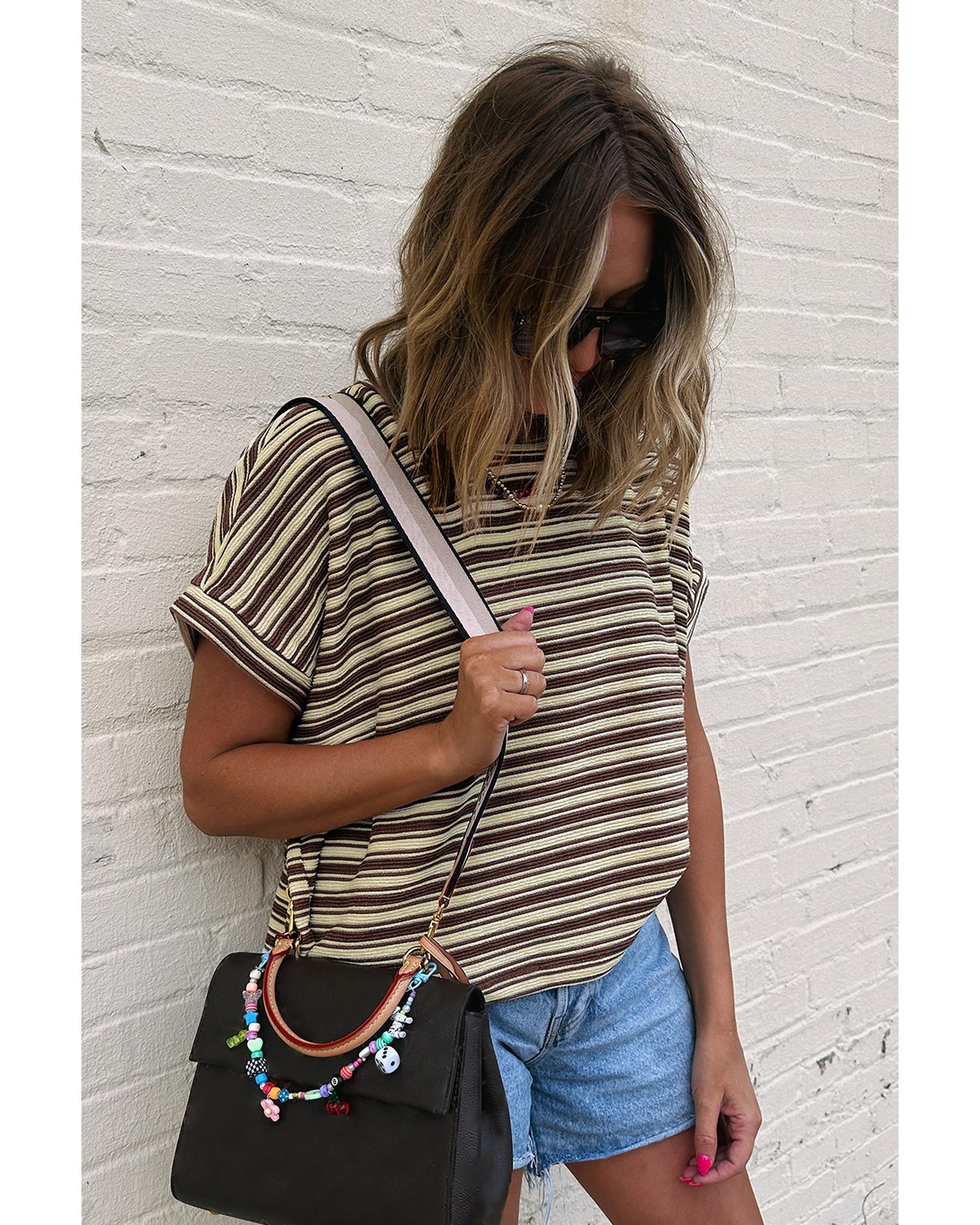 Brown Stripe Textured Side Slits Crew Neck T Shirt – S