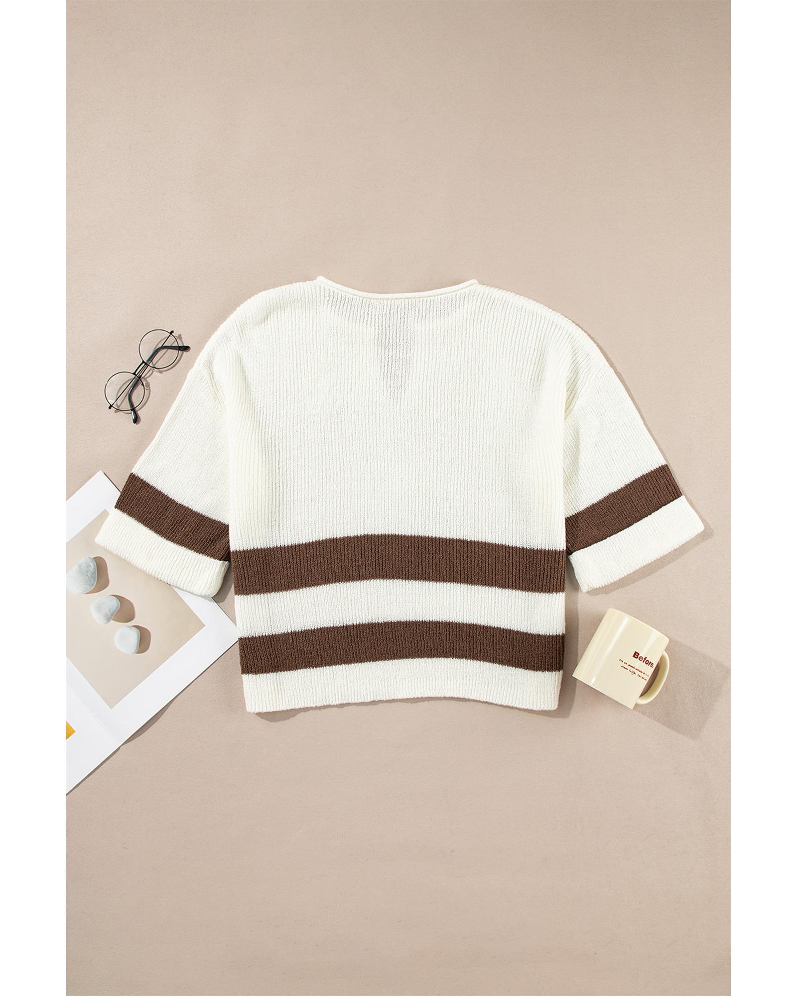 Brown Striped Accent Notched V Neck Cropped Sweater T Shirt – M