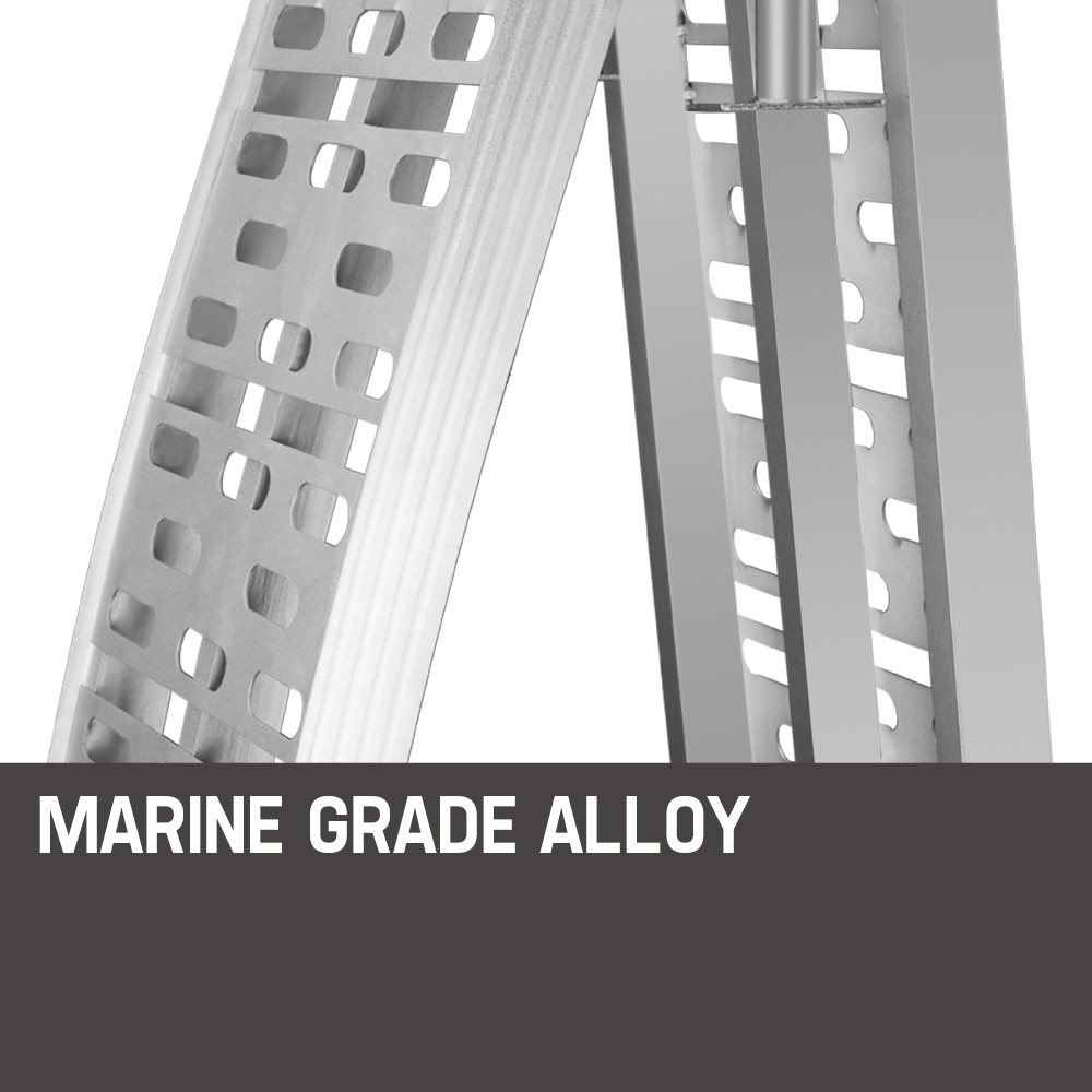 These loading ramps are made from high-quality marine grade alloy, offering a robust and durable solution for loading needs. They feature a fold-away design for easy storage and transport, along with slip-resistant tips for safety. The ramps are designed to support heavy loads with a maximum capacity of 1360kg when used as a pair, making them suitable for various applications.
