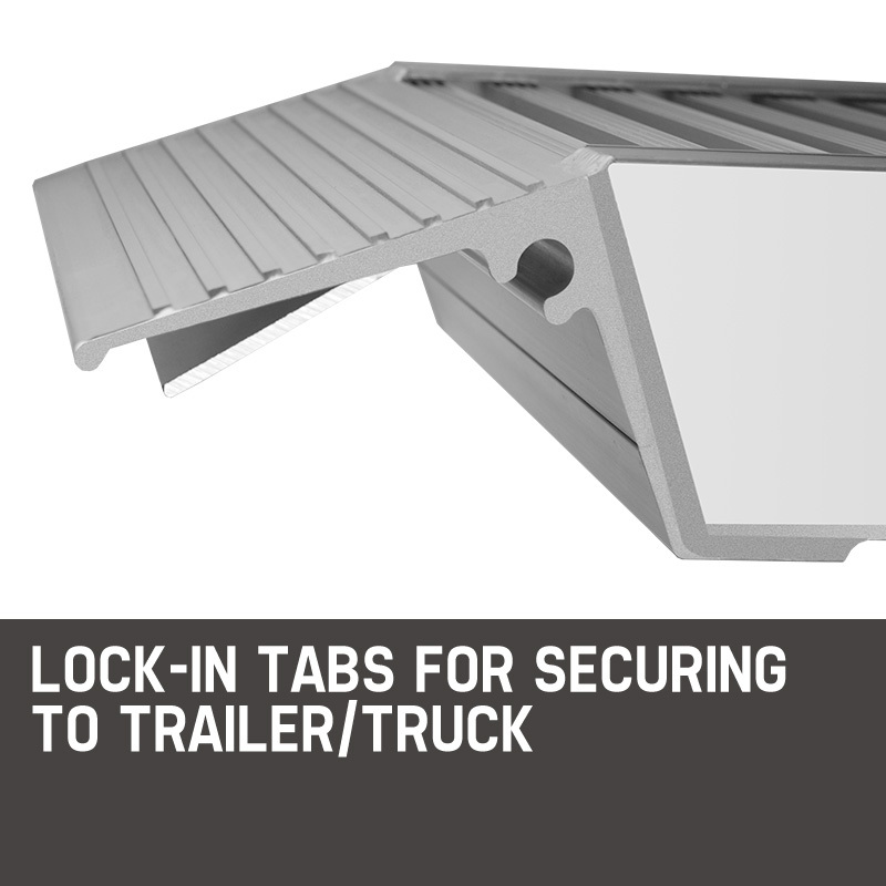Features include non-slip serrated slats, lock-in tabs for securing the ramps during use, and a marine-grade alloy construction that resists corrosion. The ramps are finished with high-quality welding for durability and longevity, ensuring they can withstand demanding use over time.