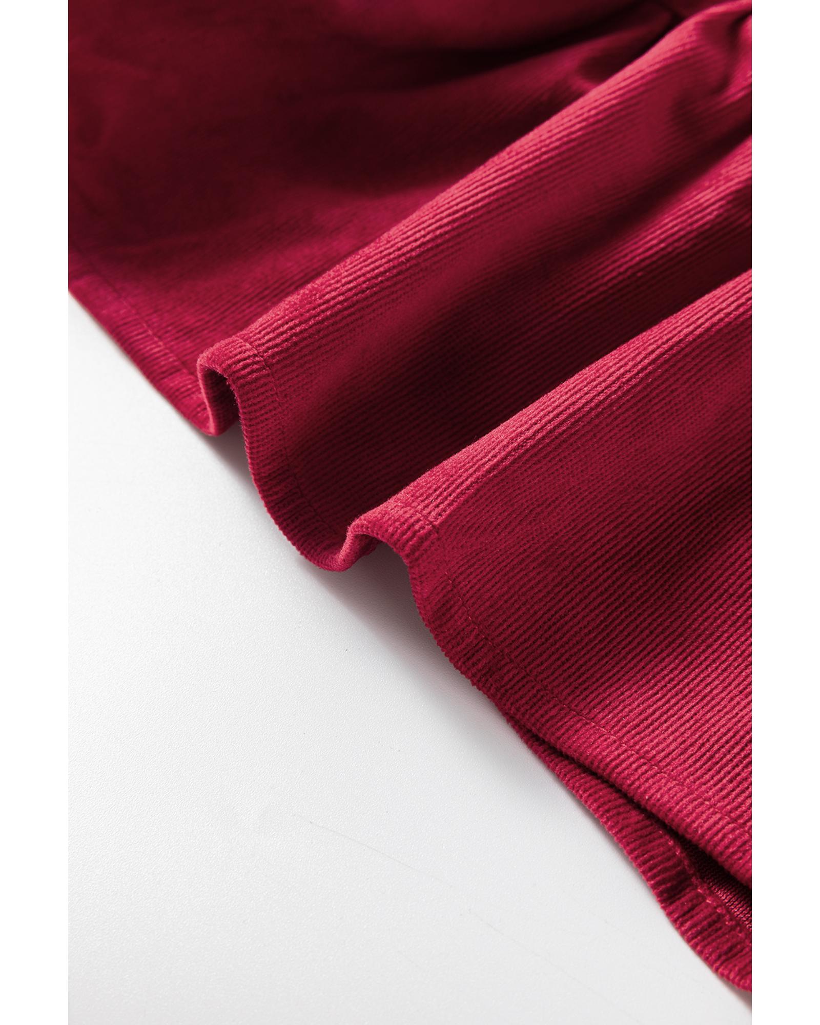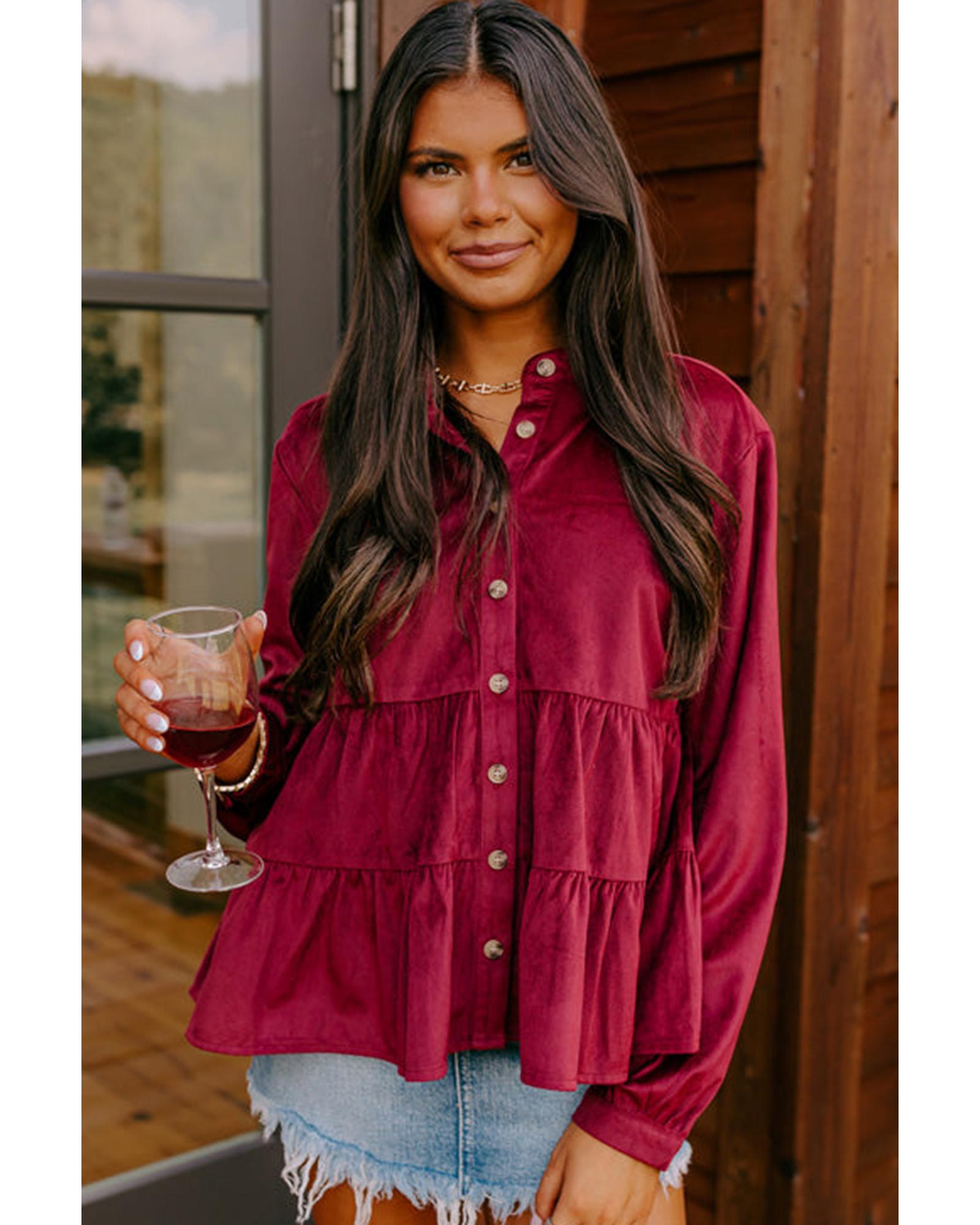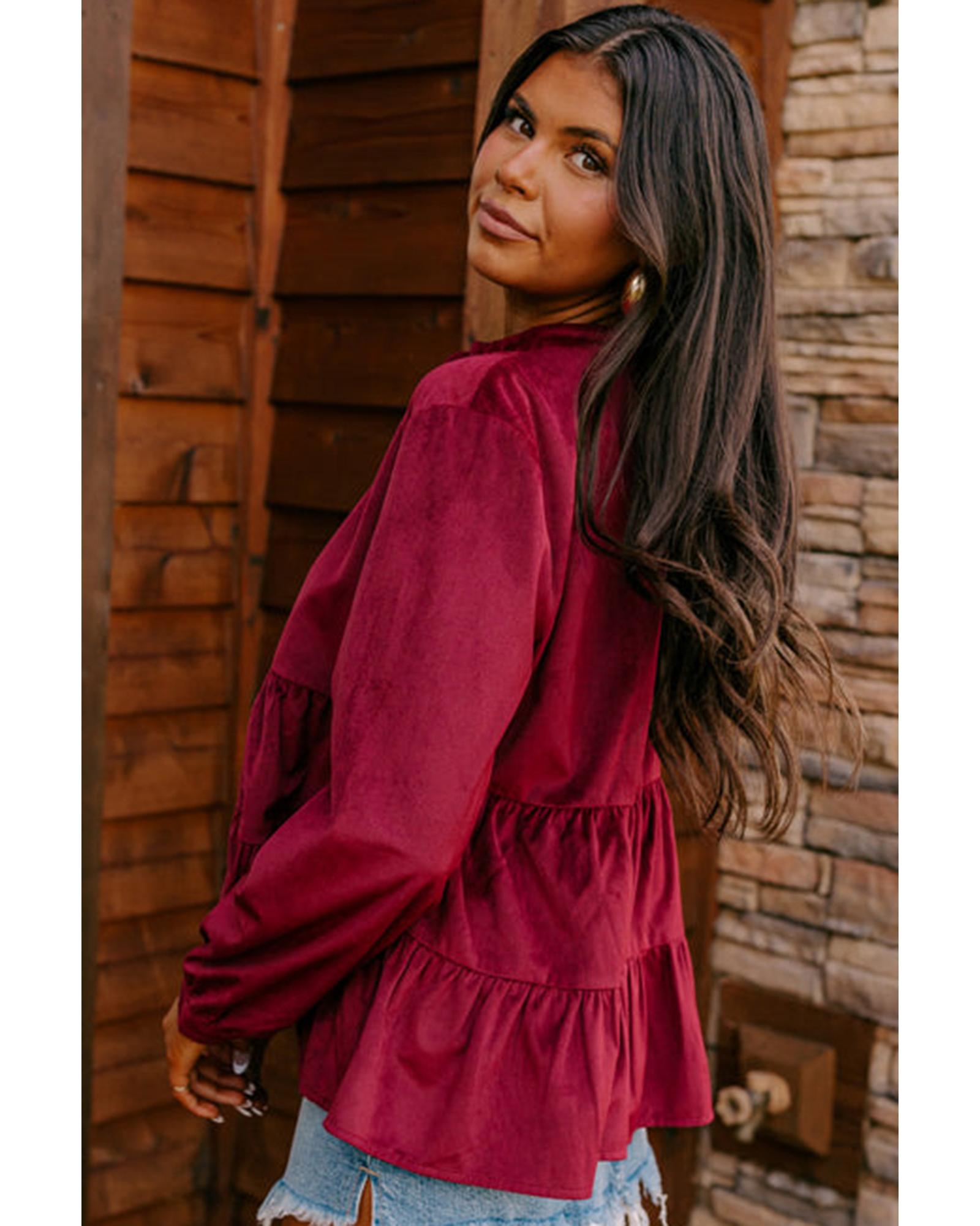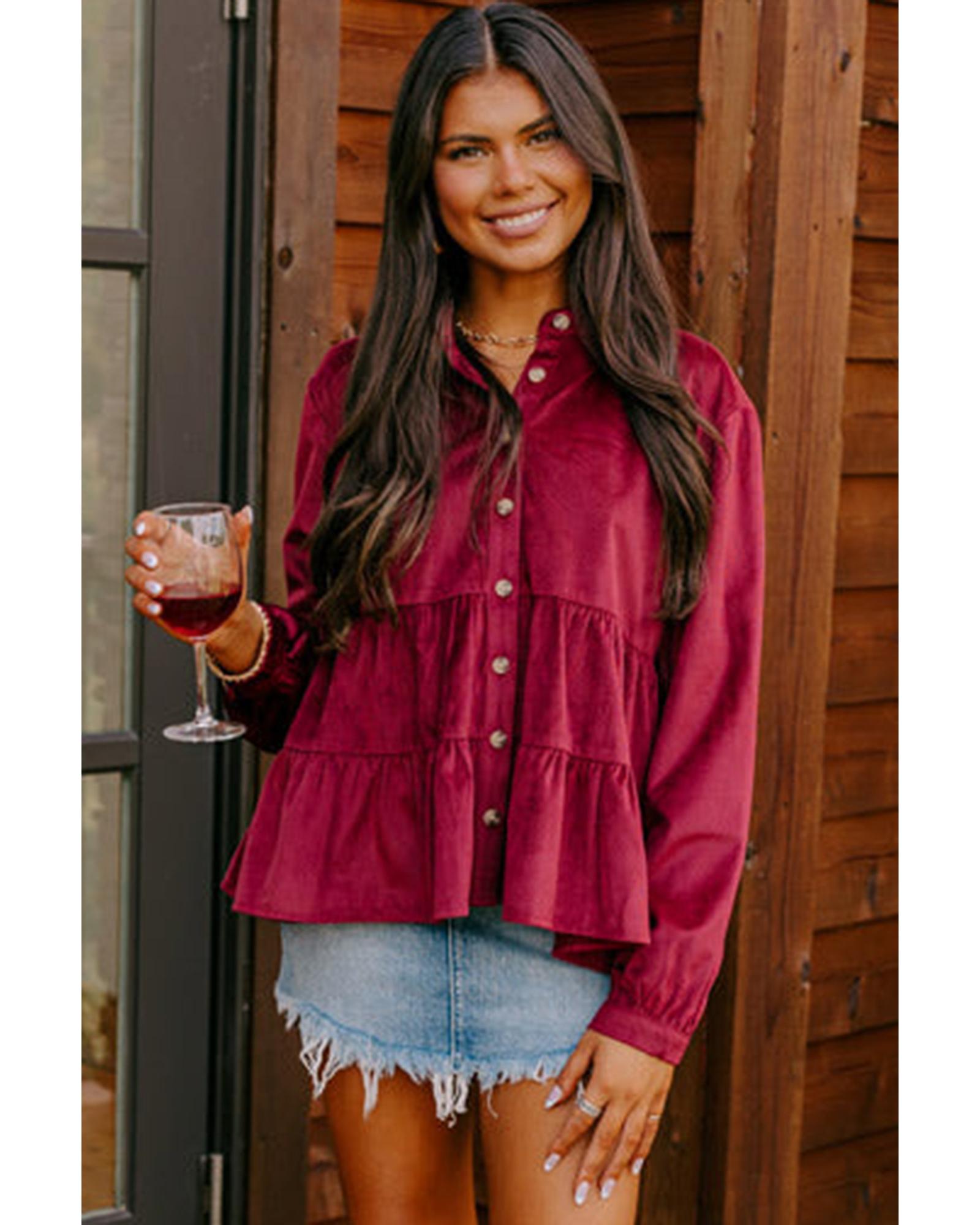 - 1 x Burgundy Corduroy Ruffle Tiered Buttoned O Neck Shirt